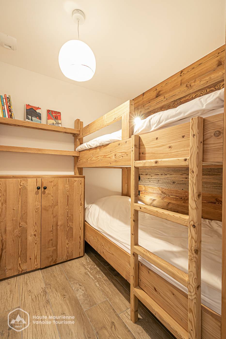 A sleeping area with a double bed (160*200) and a second with bunk beds (the sleeping area is not suitable for children under 6 years old).