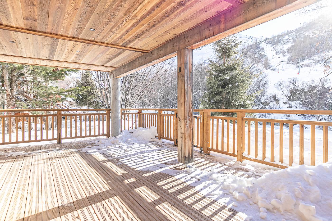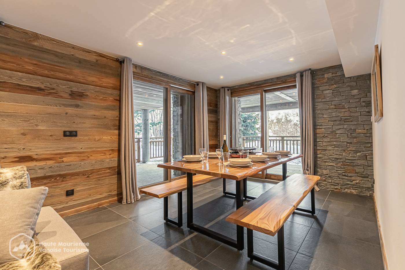 The living room opens onto a large terrace and the sublime surrounding nature, ideal for direct access to the start of the slopes.