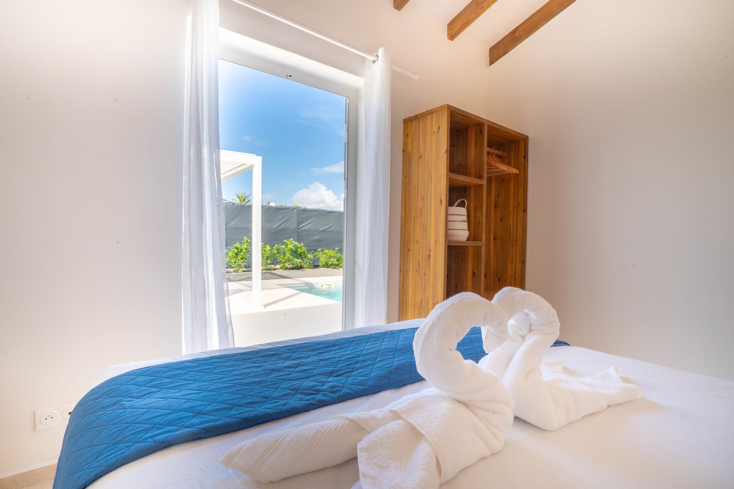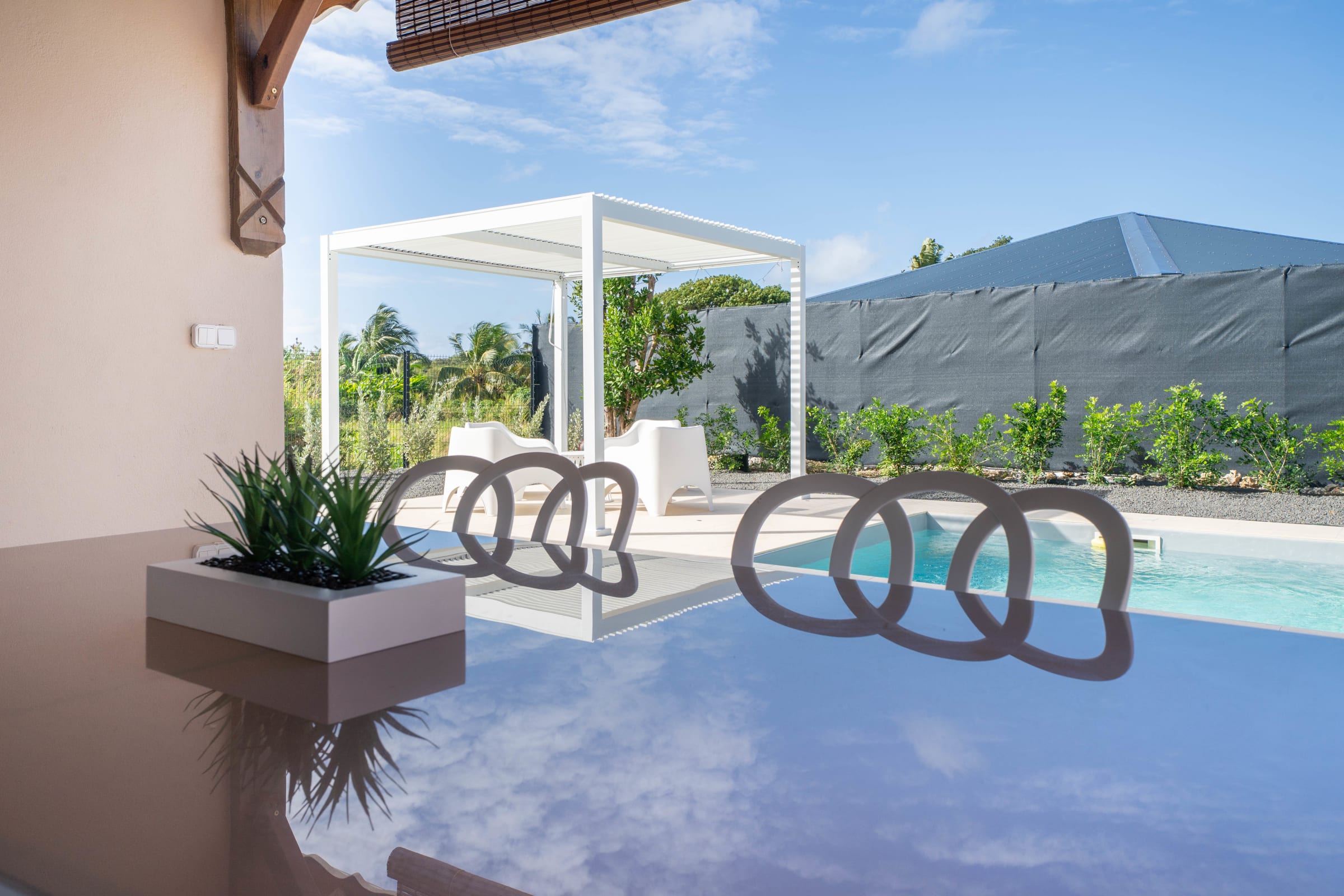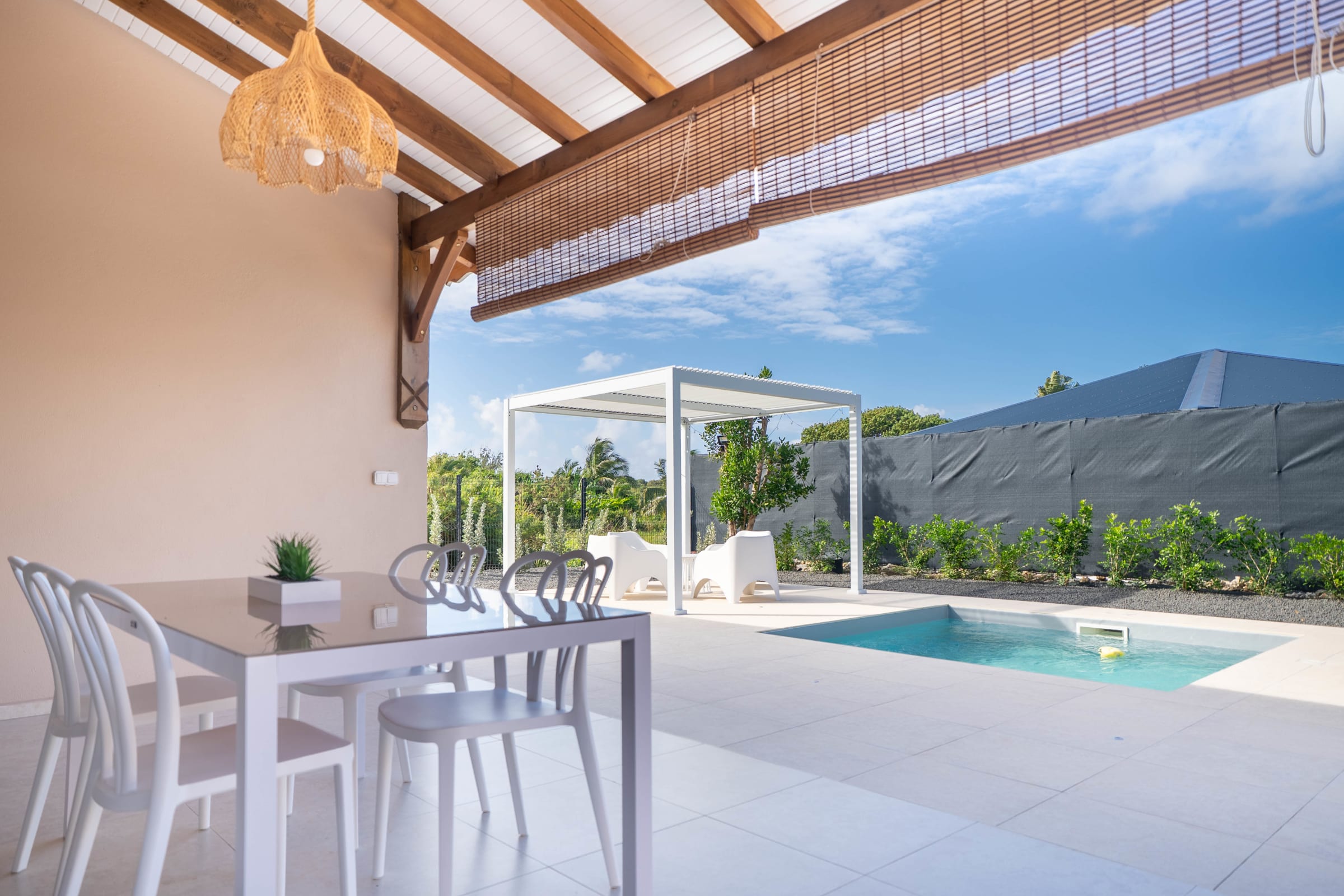 Enjoy a fully equipped modern kitchen that opens onto a large plunge pool, the perfect spot to sip a cocktail under the Caribbean sun. The private 3x3 meter swimming pool invites you to moments of pure relaxation. For those wishing to stay as a group, the adjoining twin villa (Cotoon Lodge 2 - Ti Koton) next door allows accommodation for up to 8 guests in complete privacy.