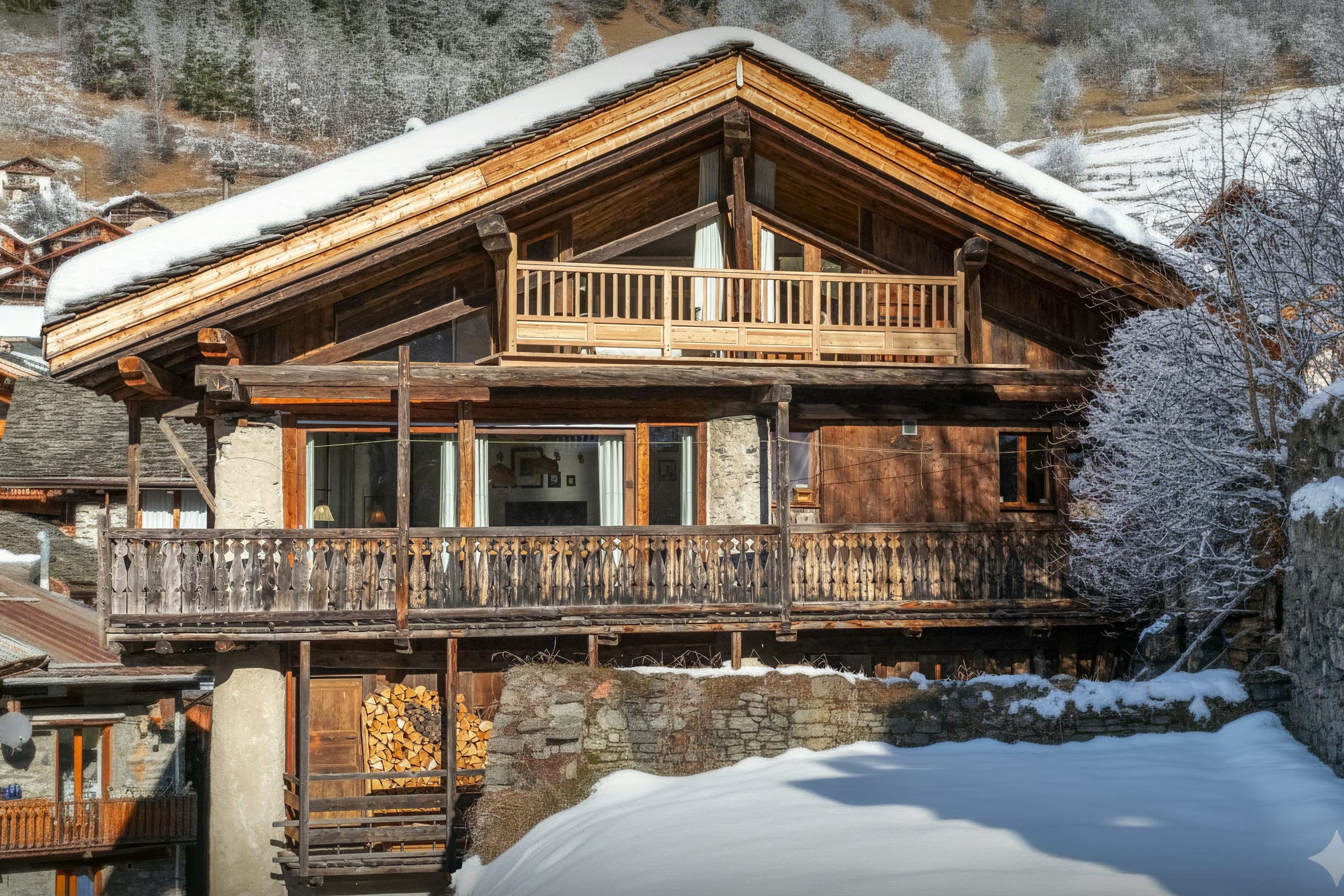 The open-plan living area is the real heart of the chalet. Flooded with natural light from large windows, it opens onto a terrace and a balcony with breathtaking views. In winter, the wood-burning stove creates the perfect cosy atmosphere for long evenings together, while in summer, the terrace with its pizza oven is sure to be the setting for unforgettable shared moments.