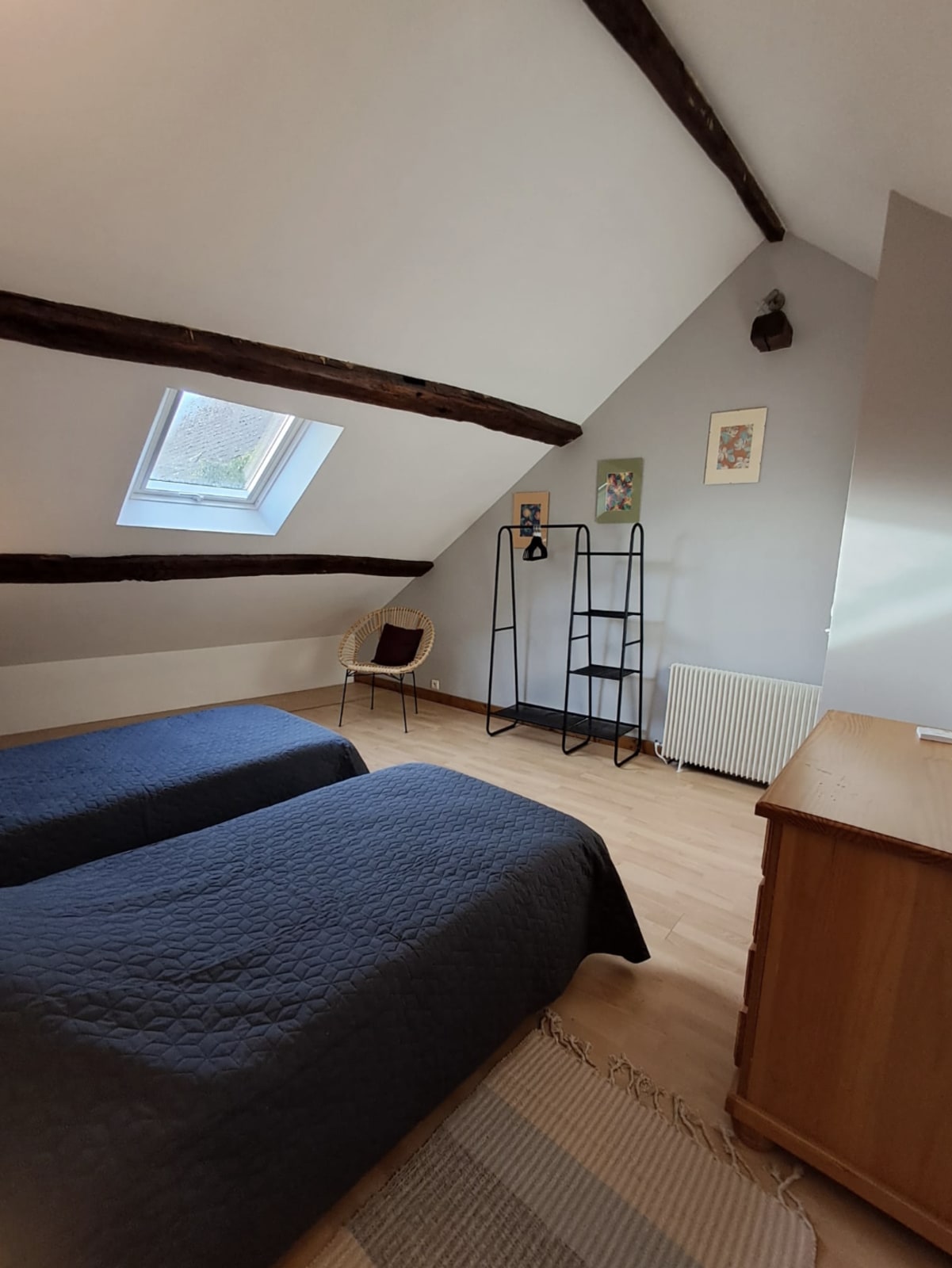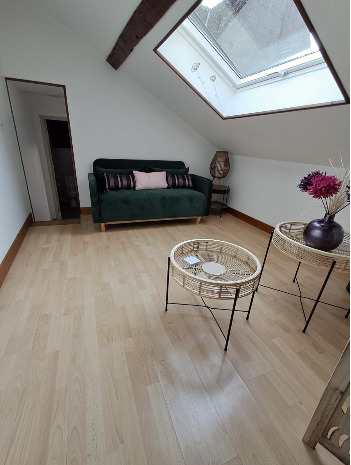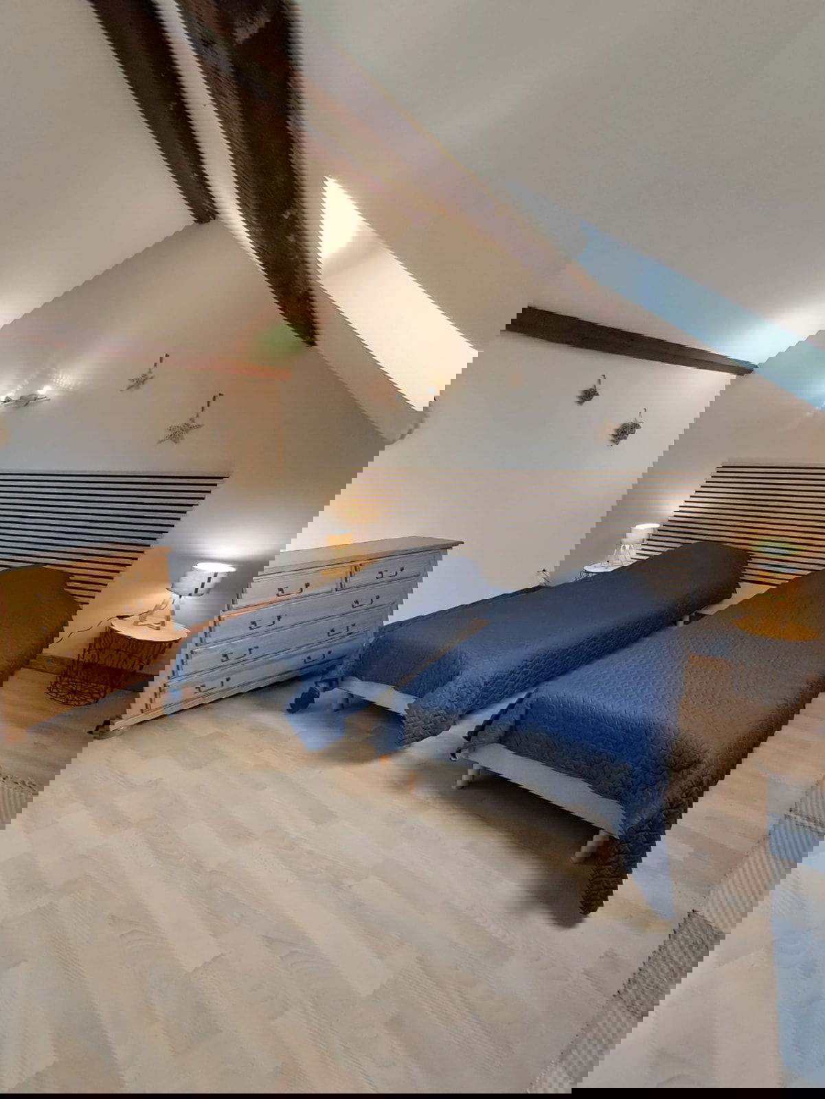 The accommodation includes a main bedroom with a double bed, an upstairs bedroom with two single beds, as well as an open landing area with a sofa bed that can accommodate two additional guests. The space is warm, functional, and pleasant to live in.