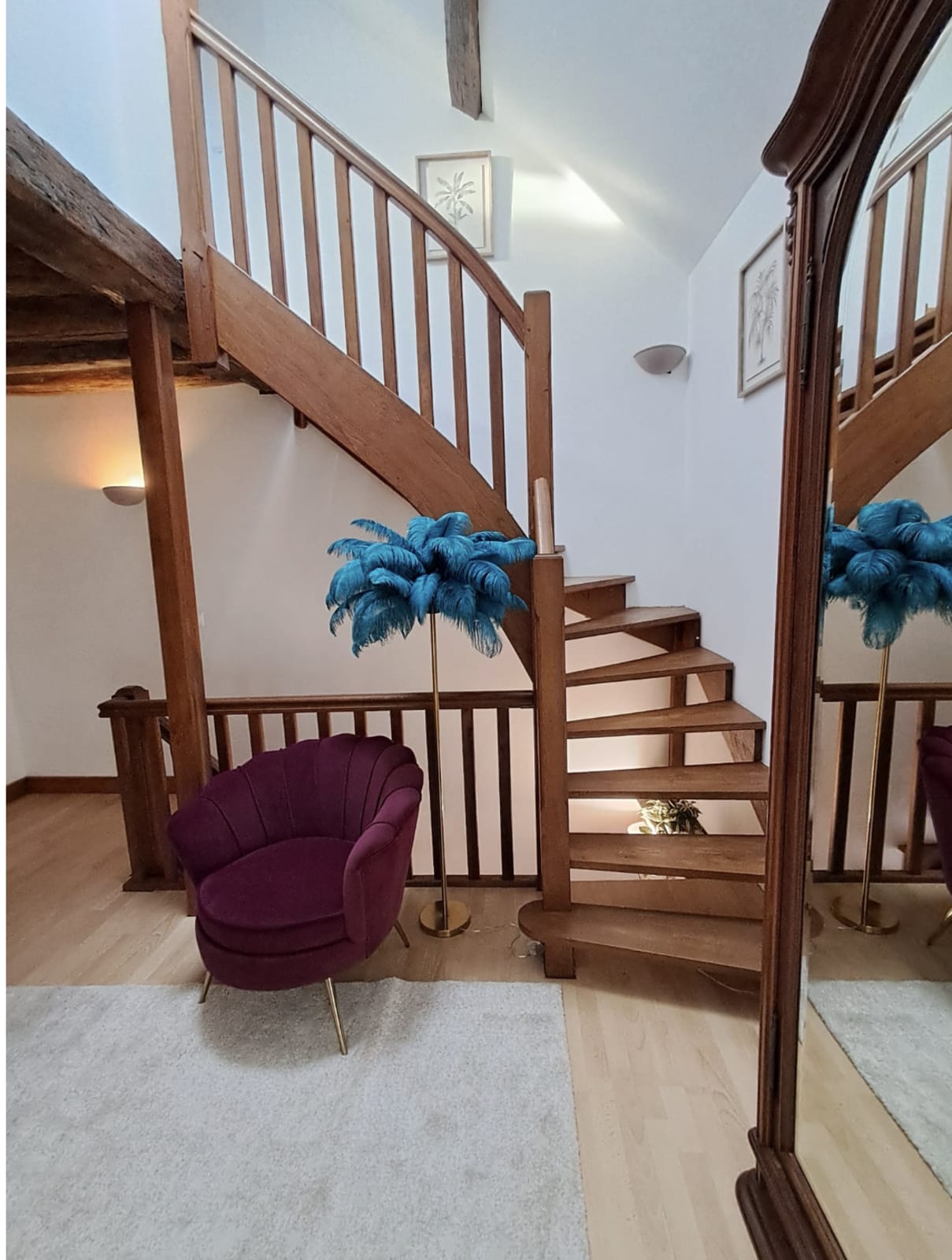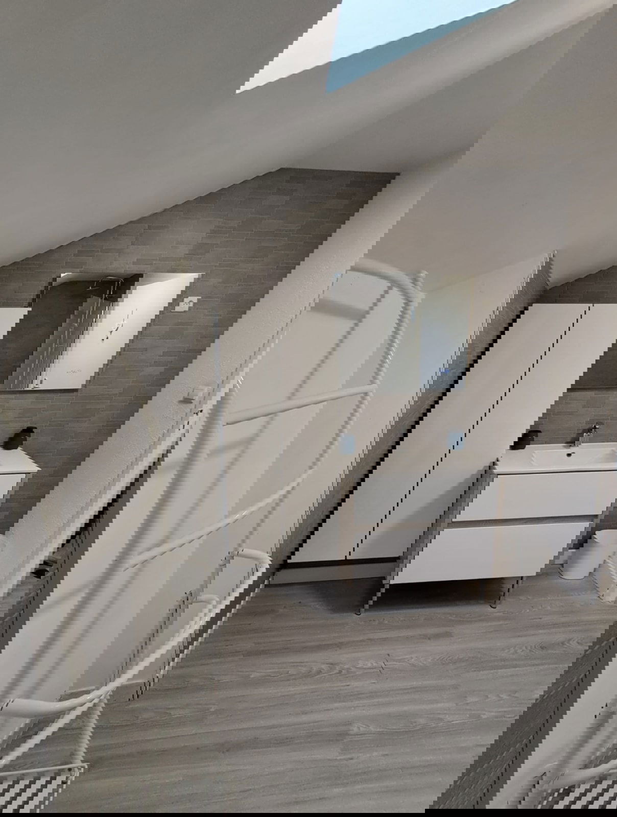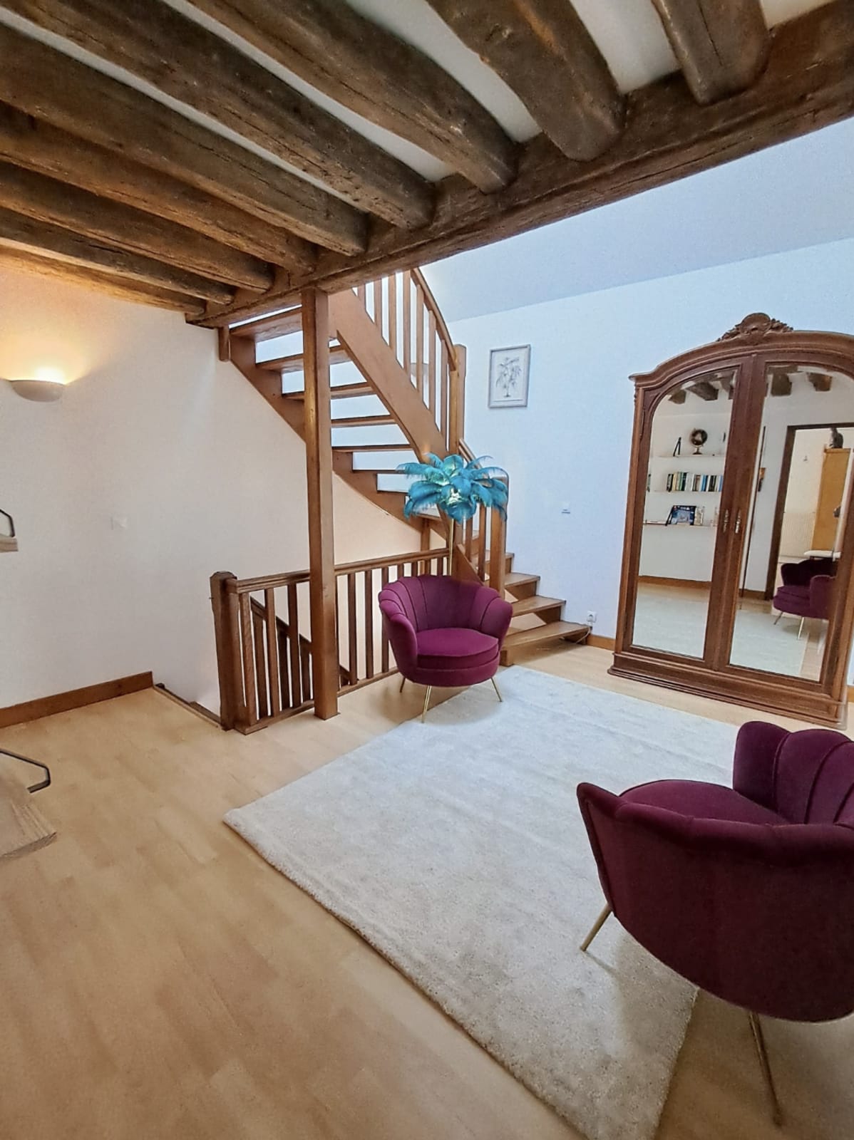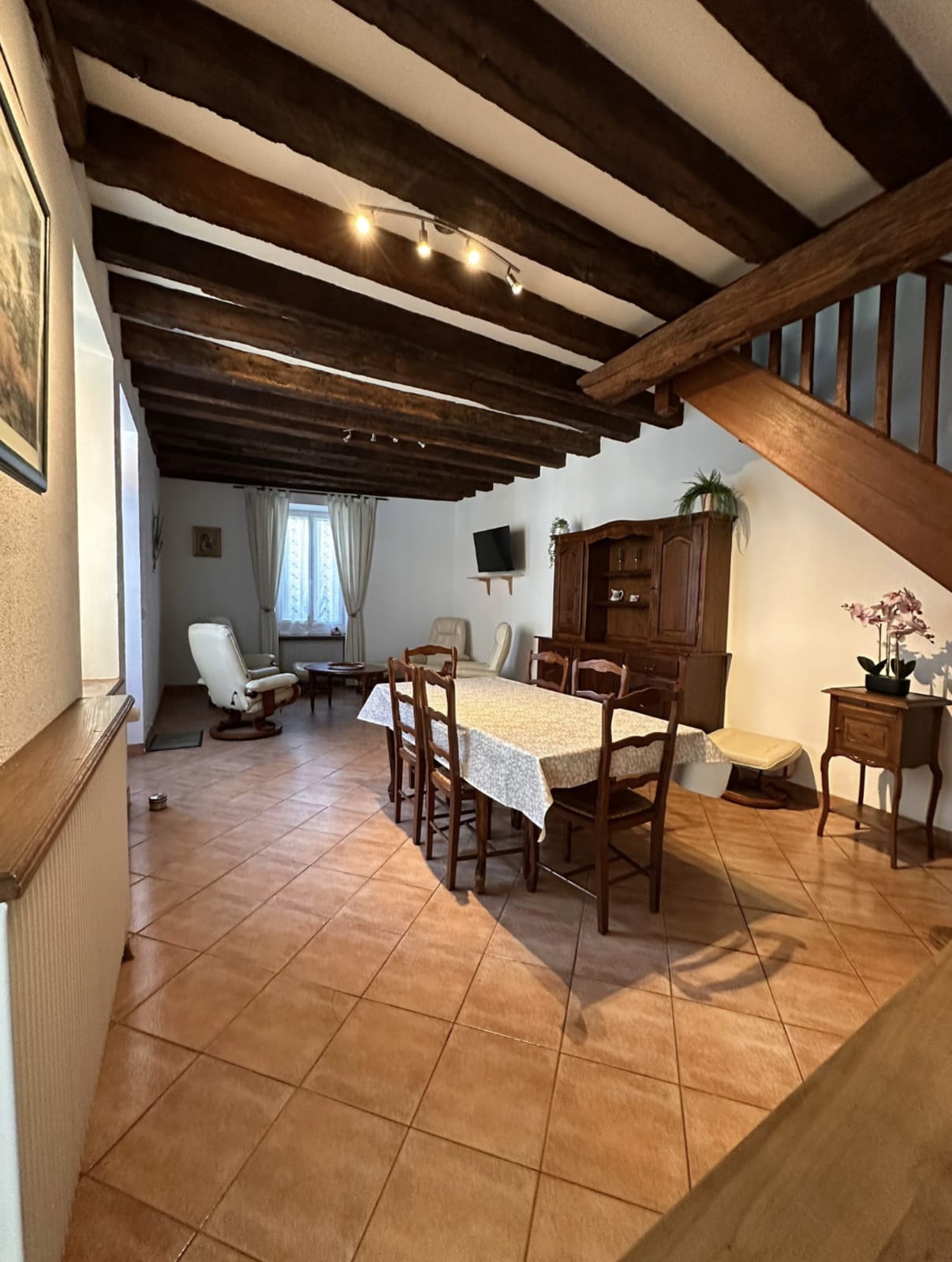 The accommodation includes a main bedroom with a double bed, an upstairs bedroom with two single beds, as well as an open landing area with a sofa bed that can accommodate two additional guests. The space is warm, functional, and pleasant to live in.