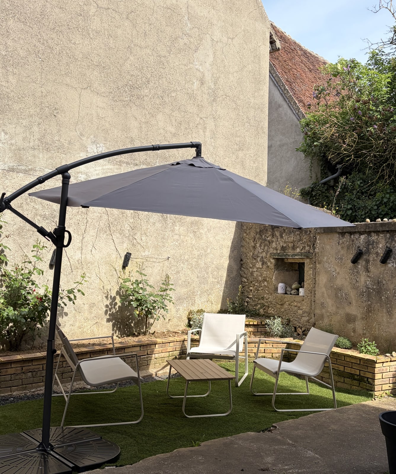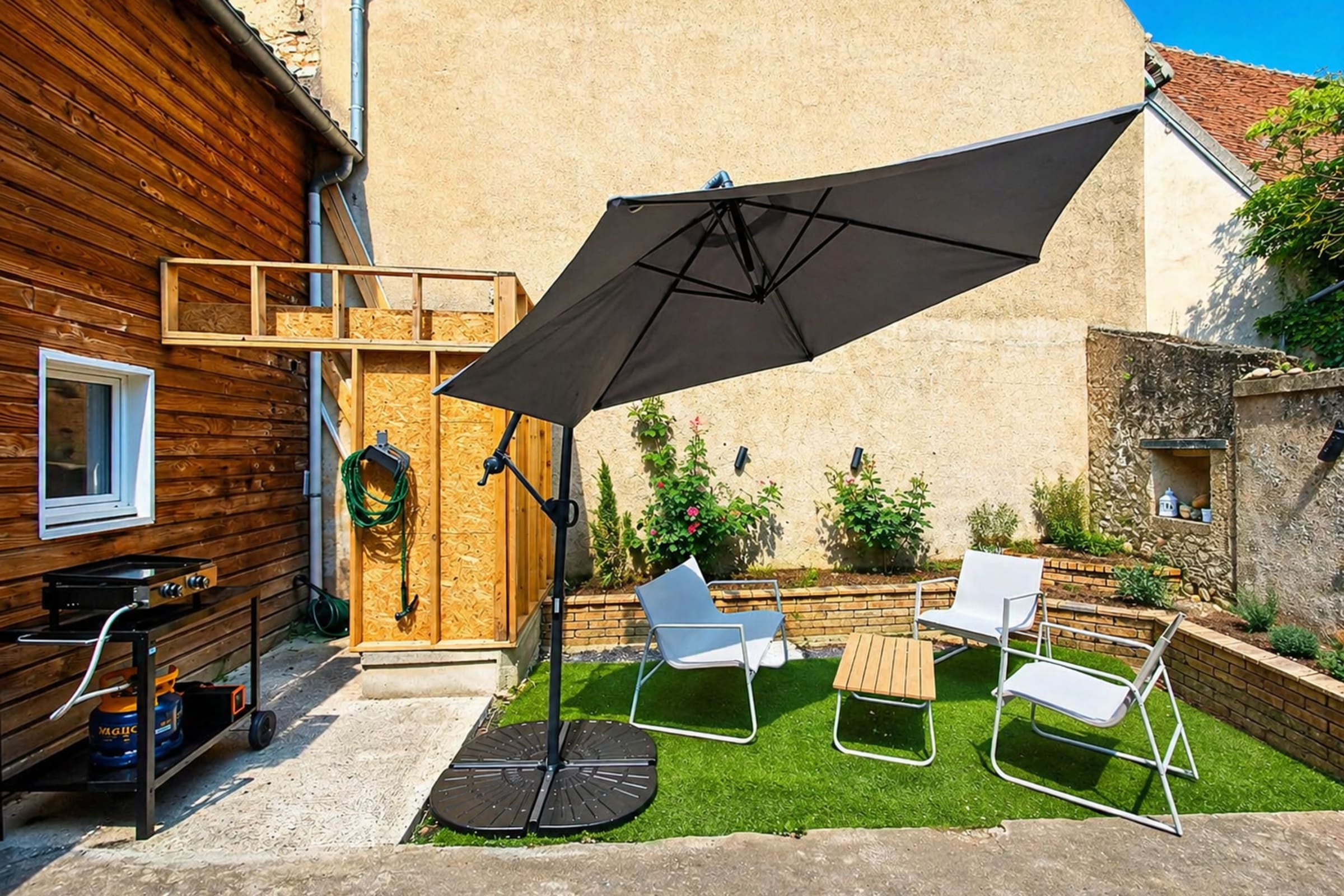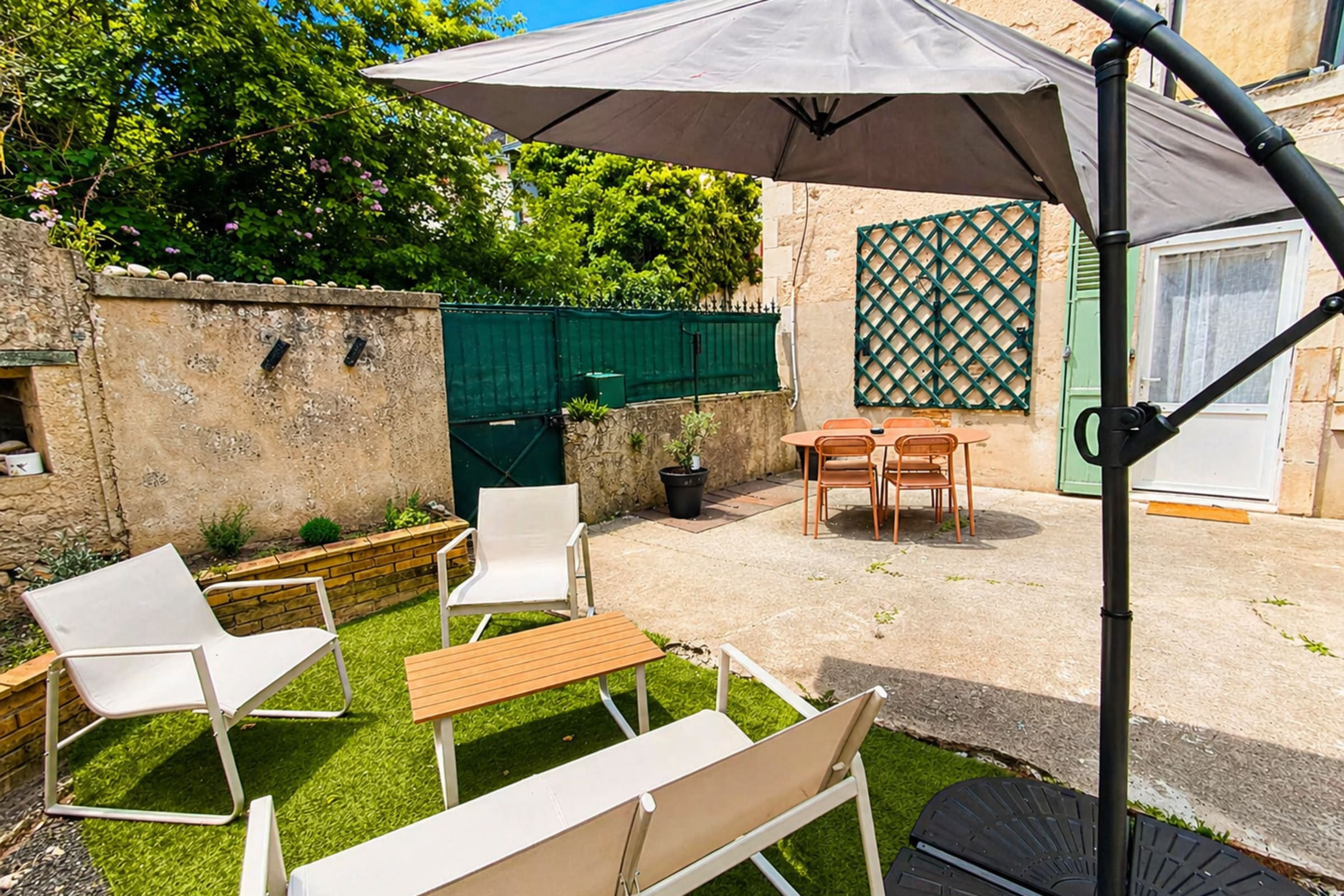 Outside, a small private courtyard with a garden table, four chairs, and a parasol allows you to fully enjoy sunny days.