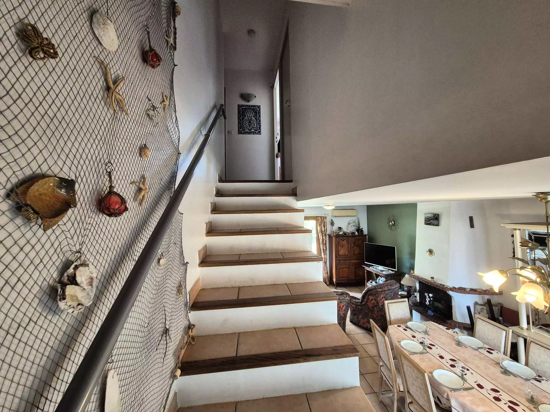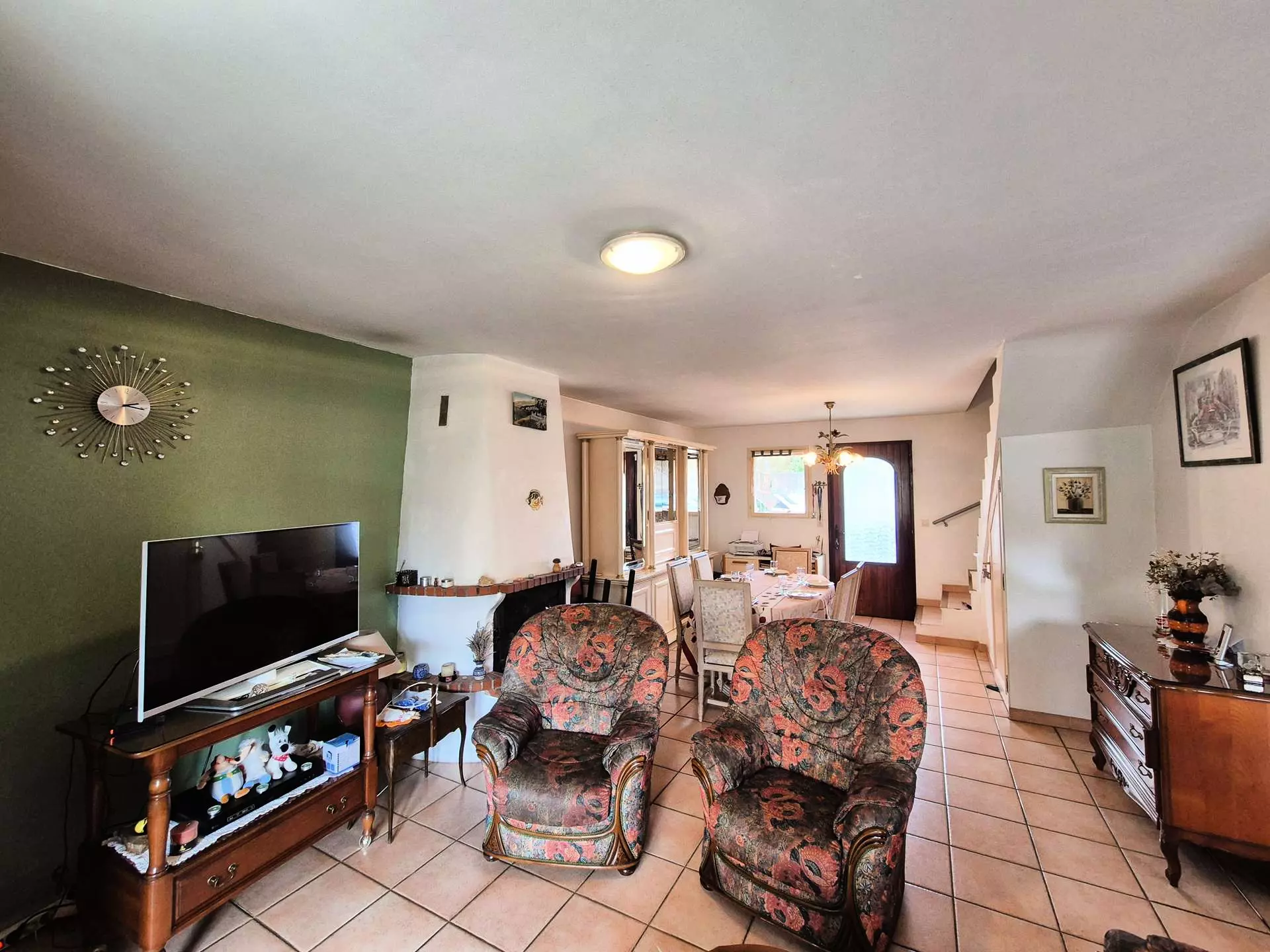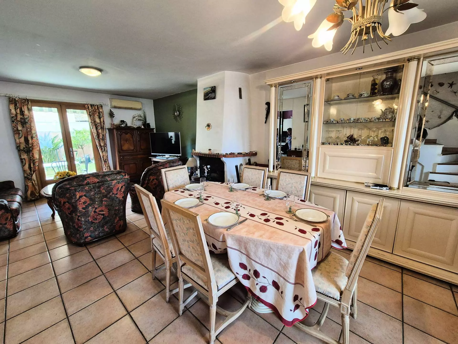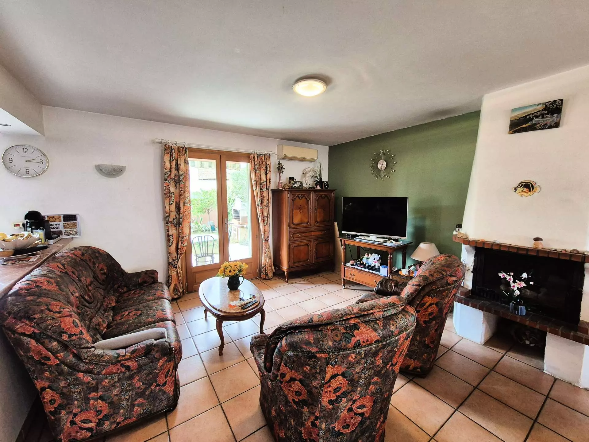 Ground floor: south-facing, large living room opening onto terrace and garden, fitted kitchen open to living room with sofa (not convertible) and armchairs, 1 separate WC.