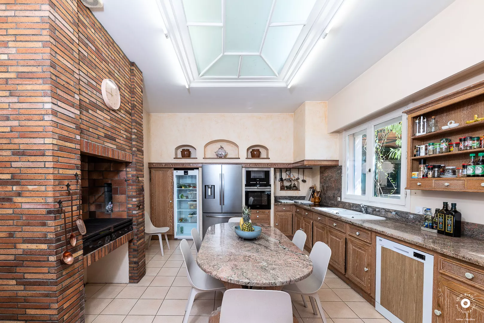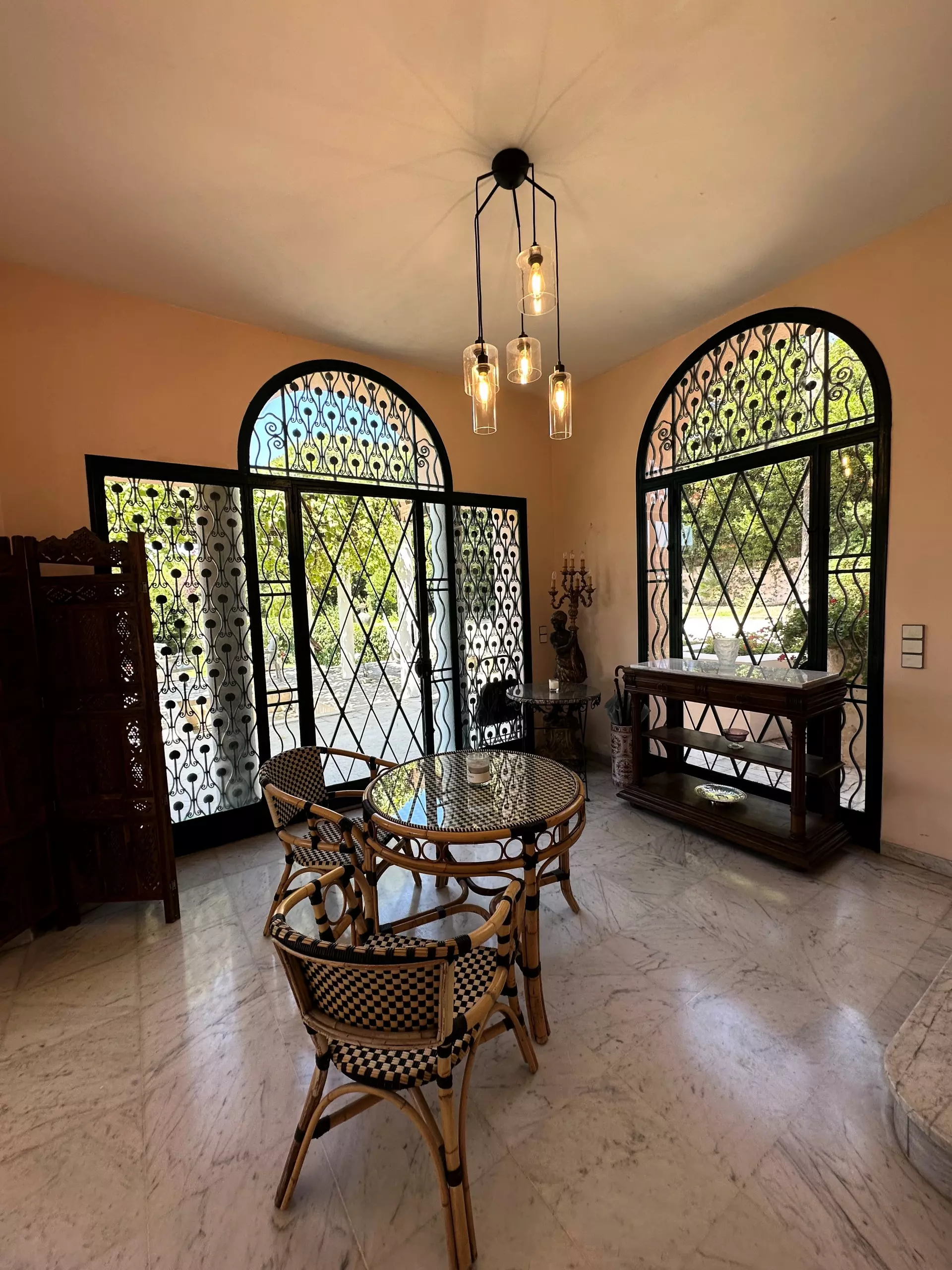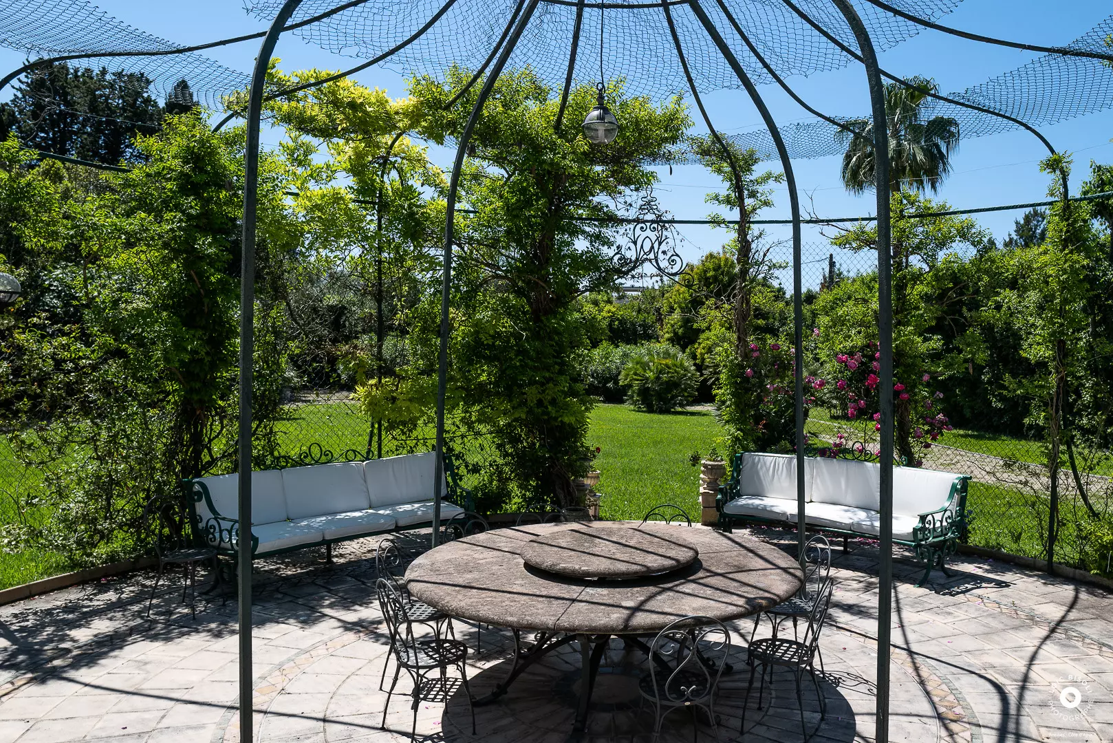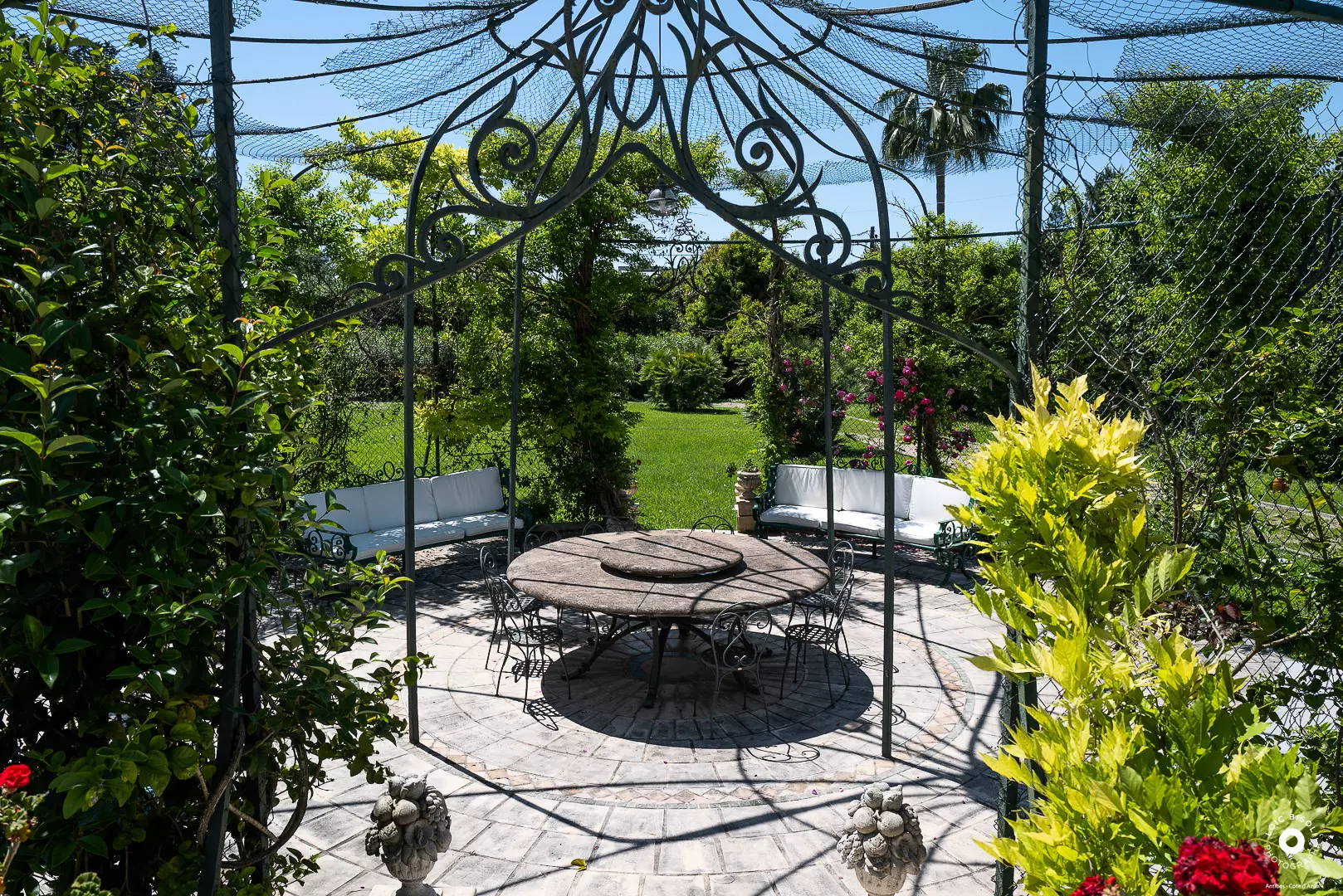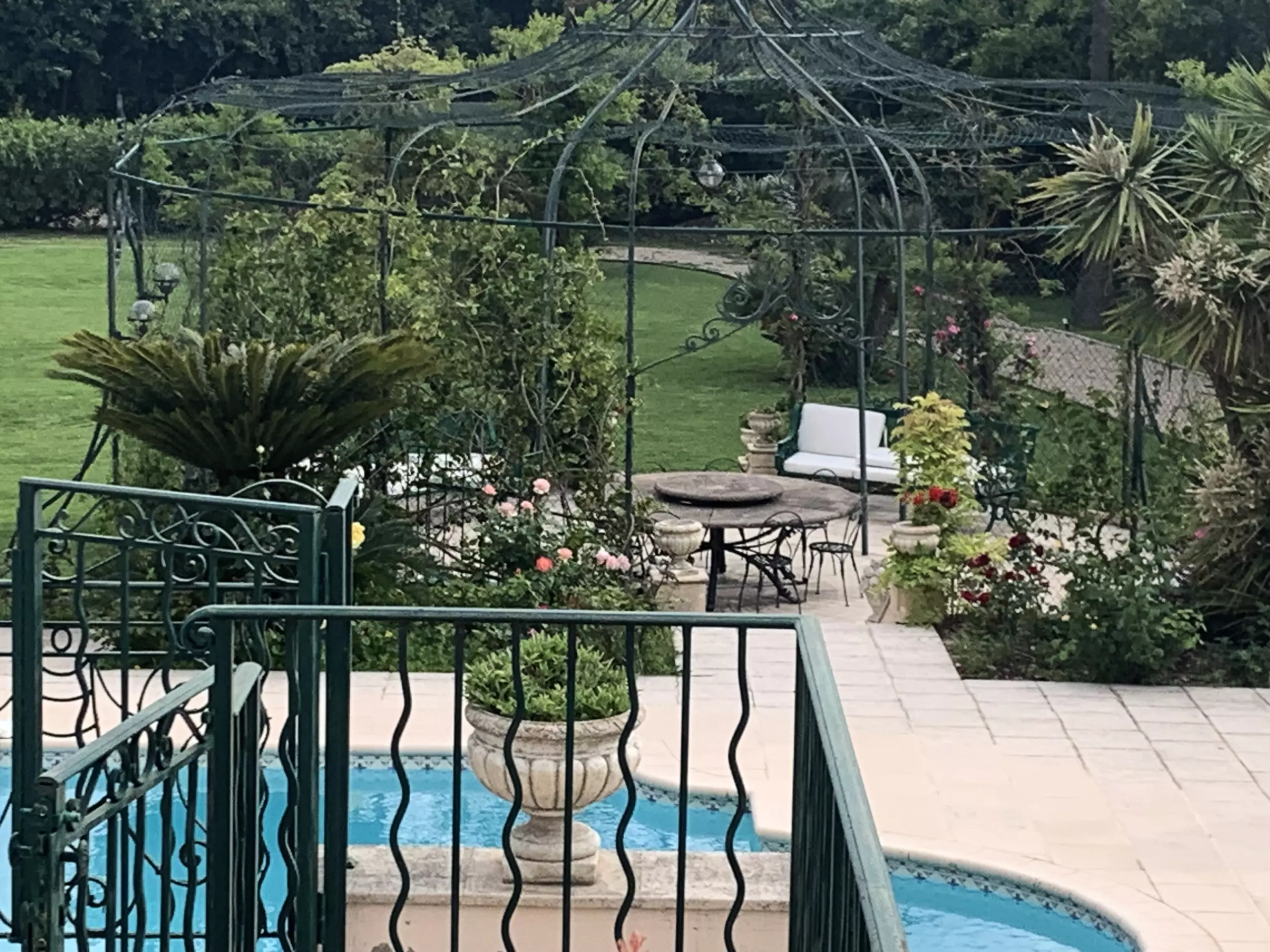 From the moment you arrive, you'll be bathed in sunshine and enchanted by the view. Bright, airy spaces seamlessly blend the inviting dining room, living room, and fully equipped kitchen. Each room opens onto a terrace overlooking the pool and lush garden, where a gazebo stands proudly – the perfect spot for relaxing and enjoying time outdoors.