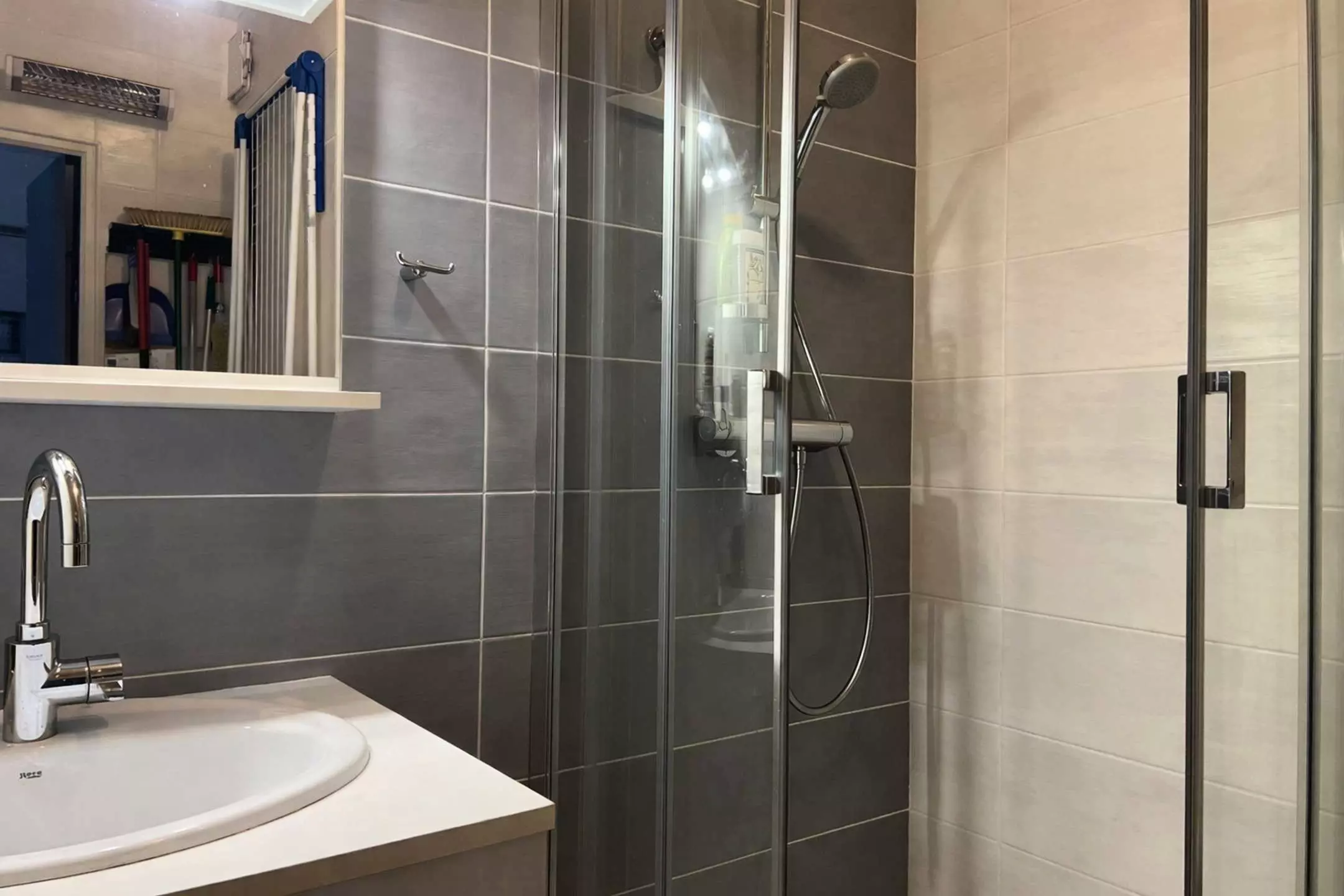 - Bathroom with shower and toilet, equipped with a vanity unit and a washing machine;