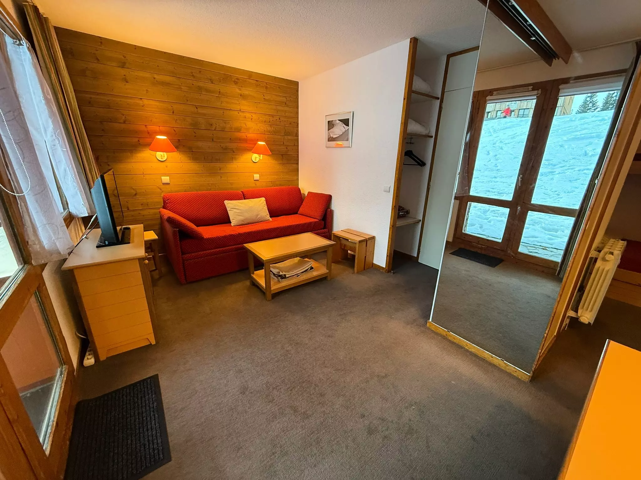 The advantages of your rental: This ground-floor apartment, located at the foot of the slopes in the village center, is ideal for a carefree mountain holiday. Facing south, it boasts a small covered terrace with mountain views, perfect for enjoying the outdoors after skiing. The apartment comprises a comfortable living room and a semi-open-plan, fully equipped kitchen (dishwasher, induction hob, microwave). Less than 100 meters from the slopes and close to shops and activities, this property offers a sought-after location for a convenient and enjoyable mountain vacation.
