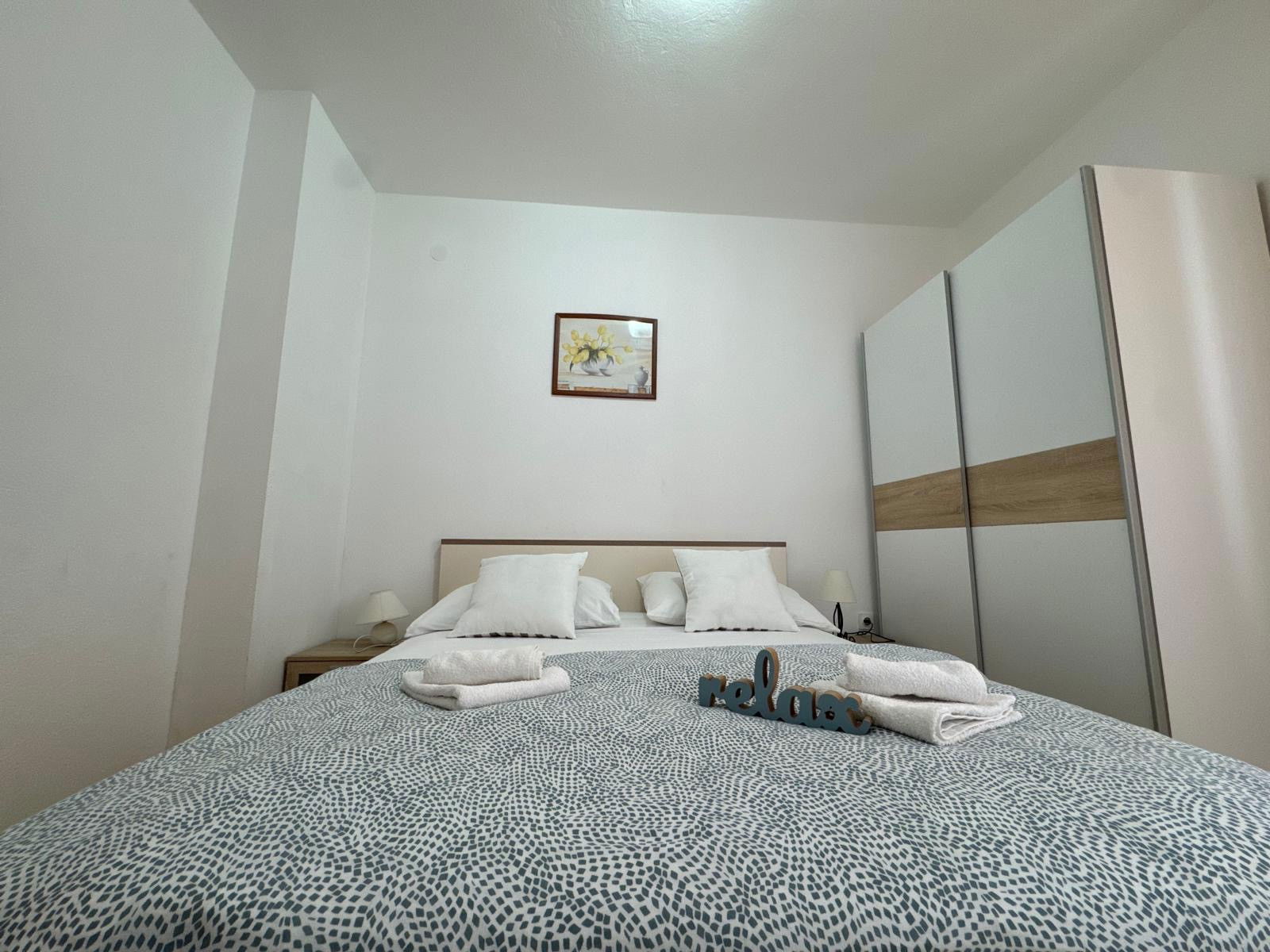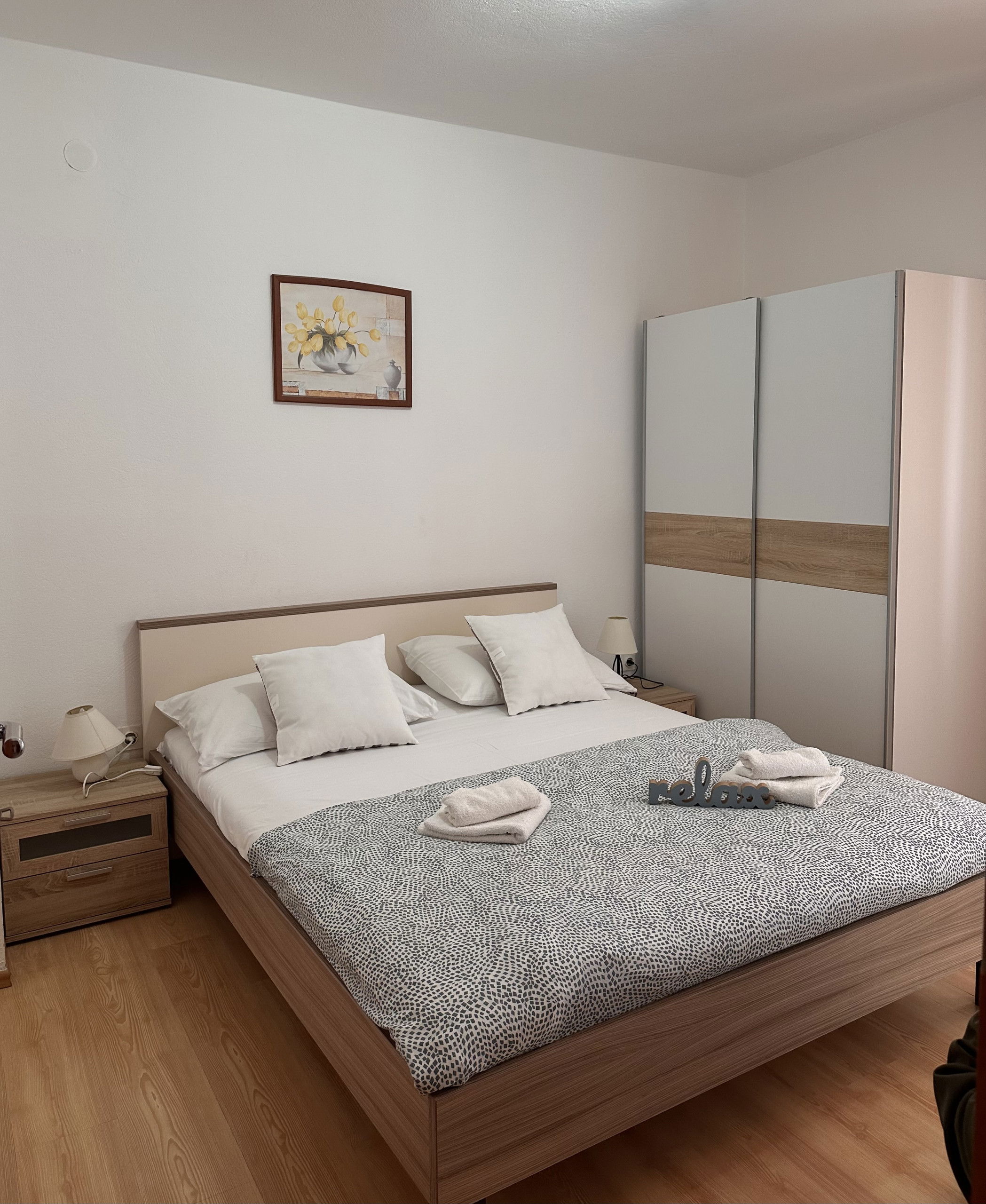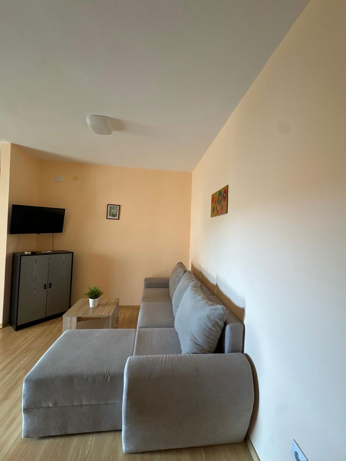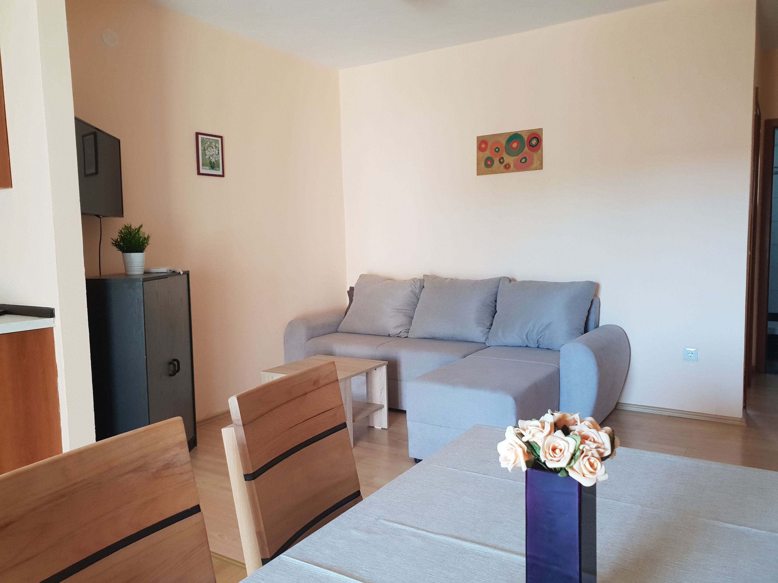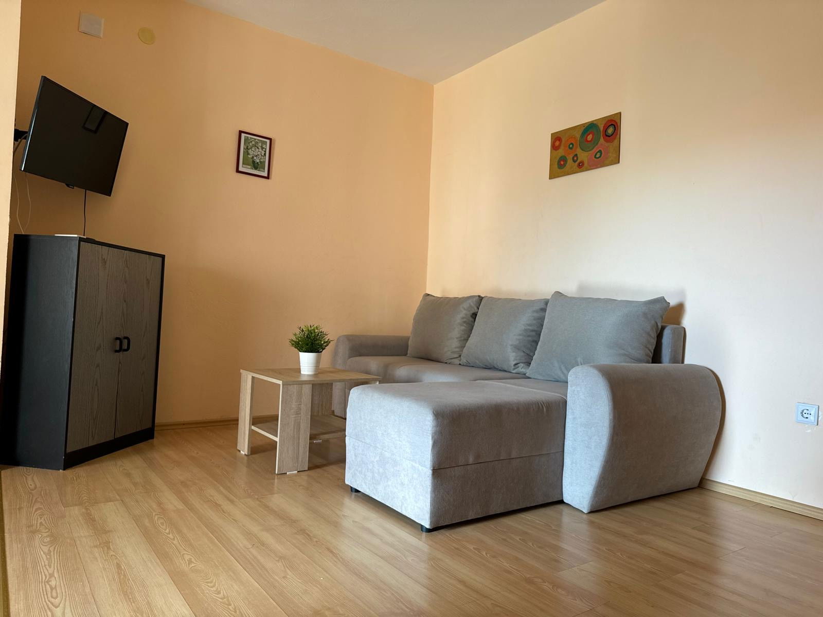 The apartment features one bedroom with a comfortable double bed and an additional sofa bed, accommodating up to three guests. The bedroom is equipped with high-quality linens and ample storage space, ensuring a restful night's sleep.