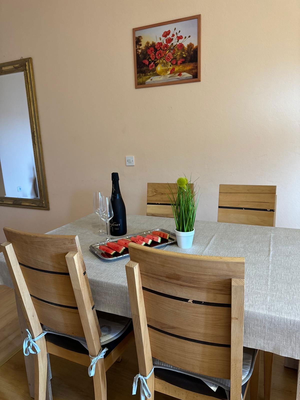 The apartment offers private parking for up to eight vehicles, providing convenient access to your accommodation. Additionally, the property is equipped with air conditioning, ensuring a comfortable indoor climate throughout your stay.