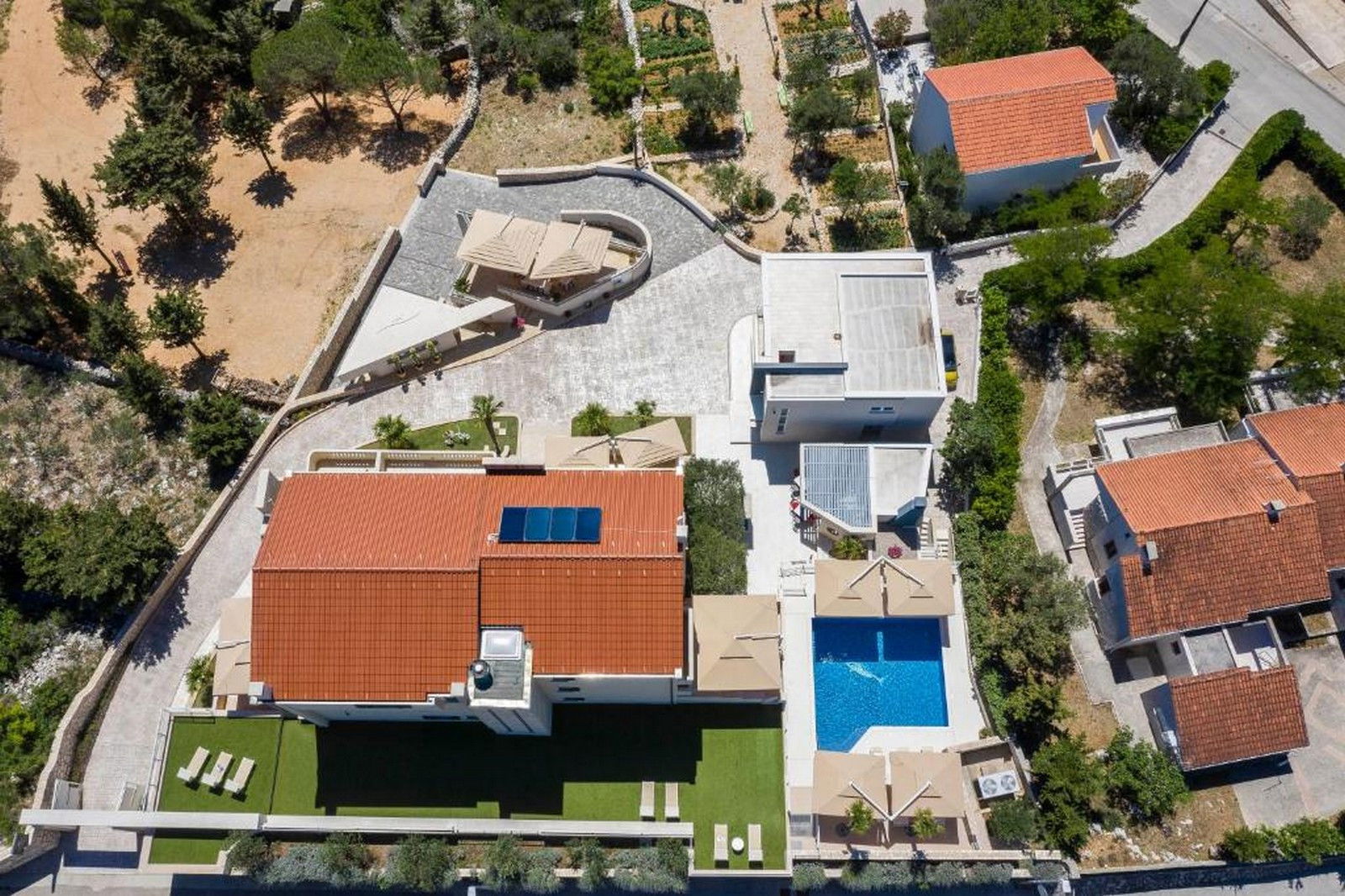 The outdoor terrace is shared by all apartments and offers an outdoor pool measuring 40 m2, and you can use 20 sun loungers. There is also a dining table with seating. There is also an outdoor gas grill at your disposal, and you can try the prepared meals in the summer kitchen.