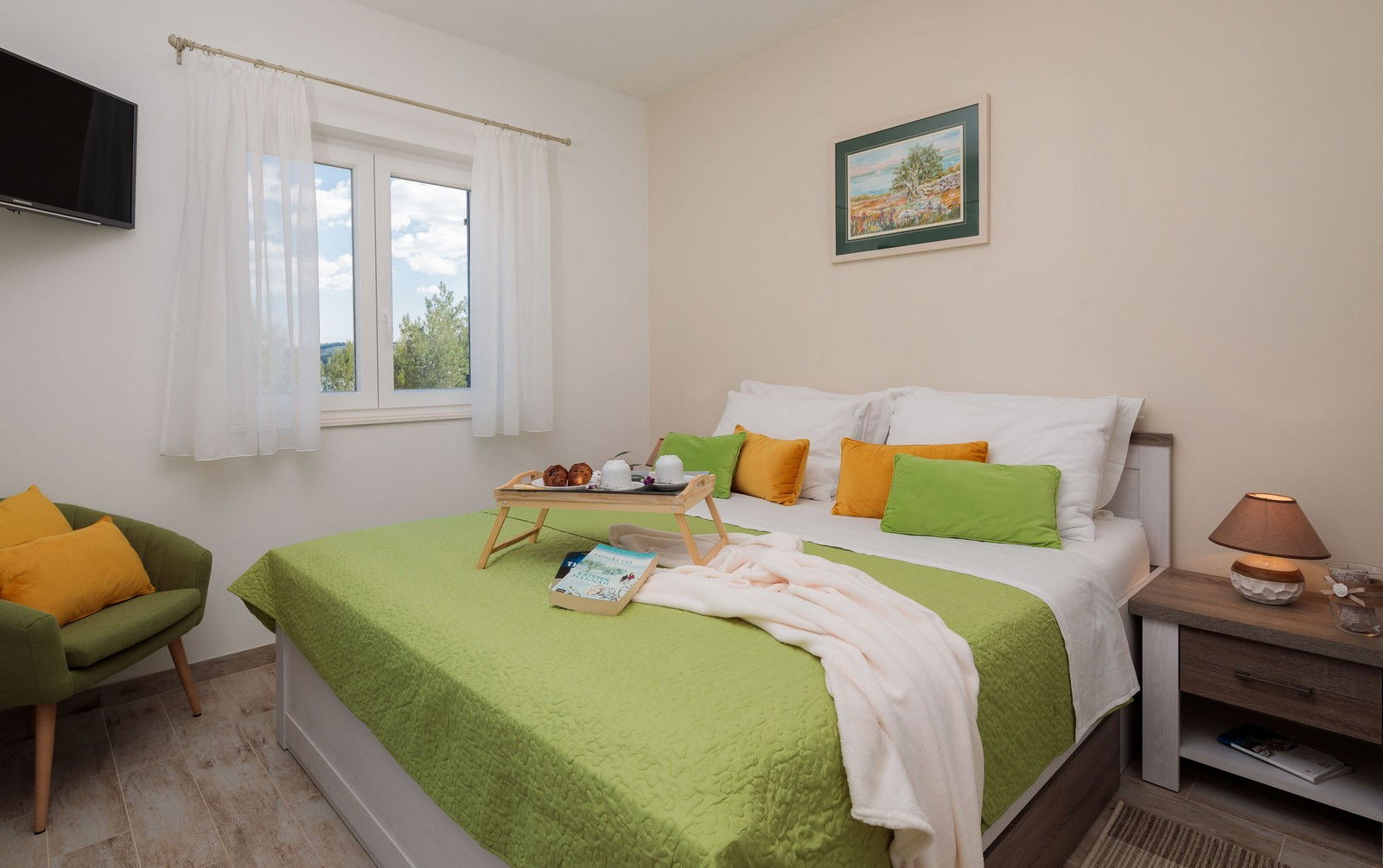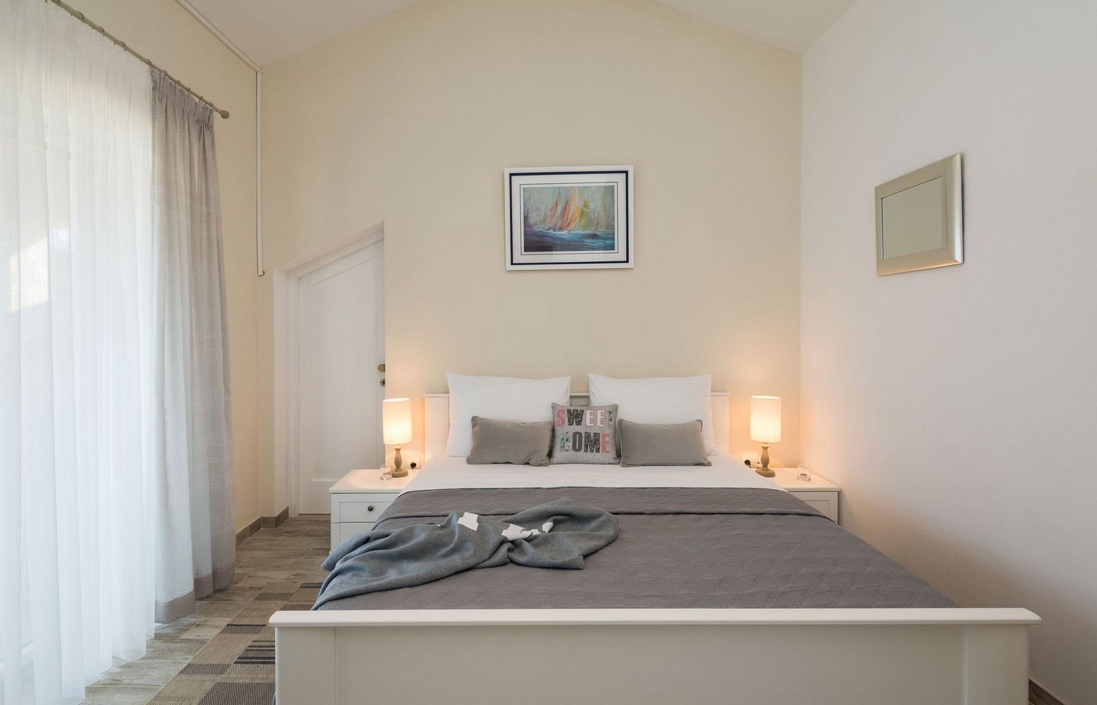 Built in 2016 in a contemporary style, it is fully air-conditioned, offers 130 m2 of living space, and can accommodate a maximum of 7, and optimally 6 people. You will be comfortably accommodated in 3 bedrooms, one of which is located on the upper floor, and the remaining two are on the ground floor. Two rooms have a double bed, while the third room has 2 single beds. As an additional bed, you can use a sofa bed for 1 person. All bedrooms have a TV, air conditioning and a safe. One bedroom has its own en suite bathroom, and the other two have a shared bathroom.