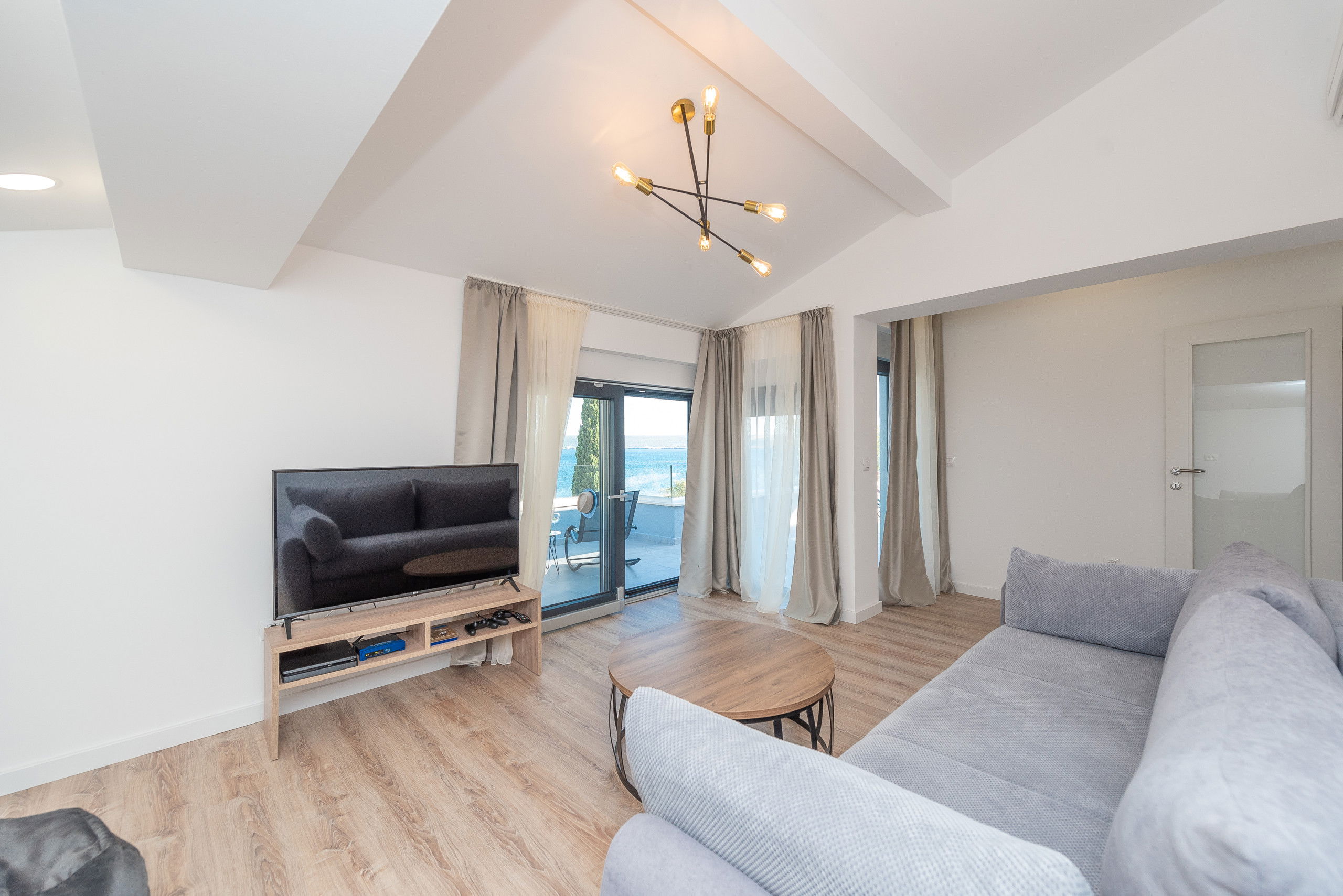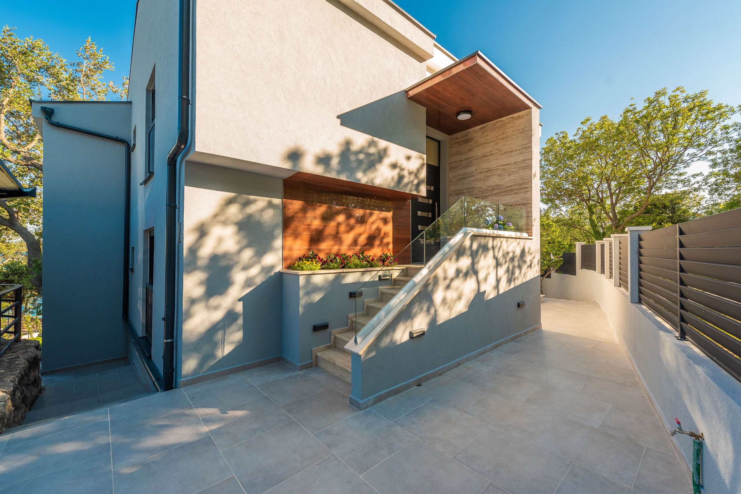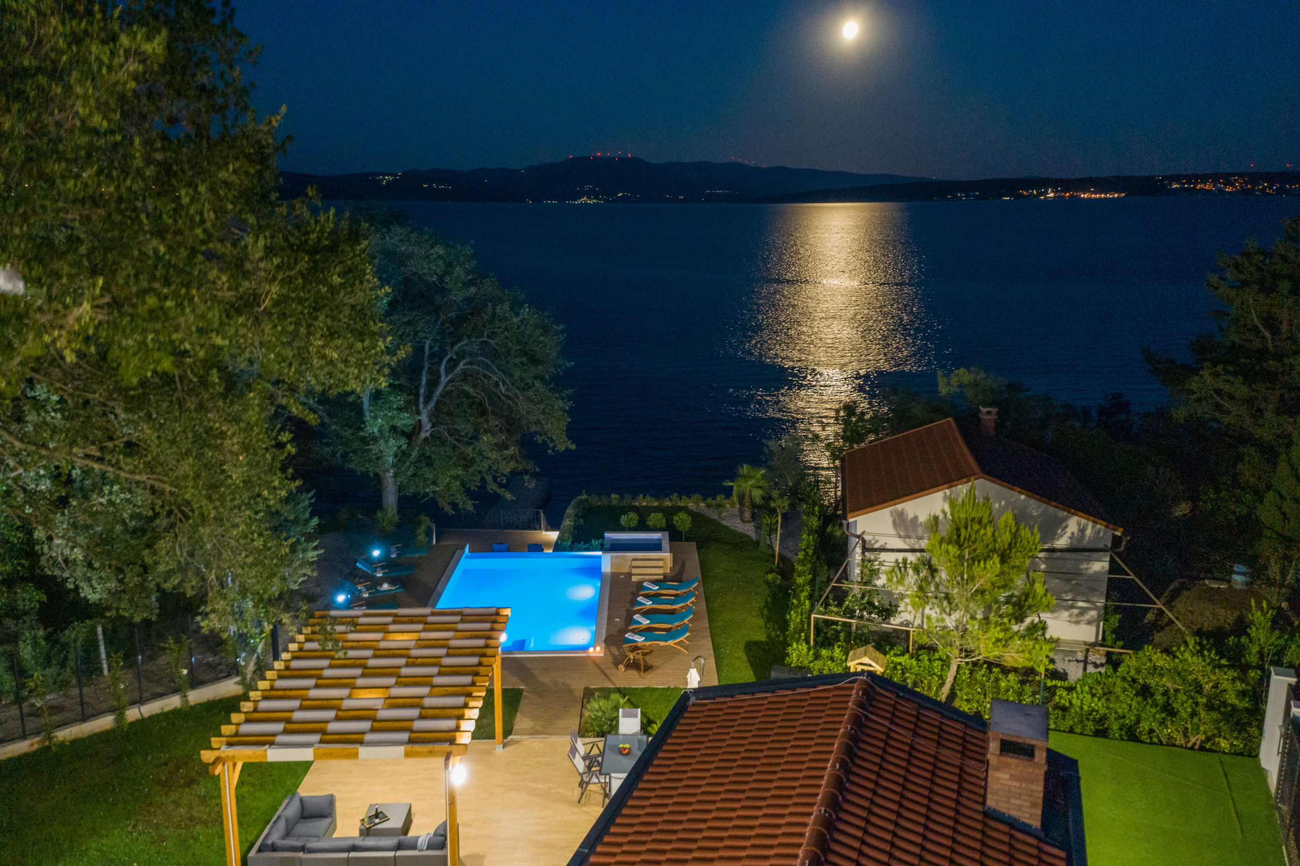Villa Promenada was built in 2019 in a contemporary and modern style, and offers you 250 m2 of living space. It is only 5 meters from the nearest beach, where you will be able to explore the depths of the sea and swim in the Adriatic Sea. It is fully air-conditioned, and offers accommodation for a maximum of 12, and optimally 10 people. You will sleep in 5 bedrooms (2 are located on the ground floor, and the remaining 3 are on the upper floor), each of which has a double bed. There are also 5 bathrooms with showers and 2 separate toilets. As additional facilities, there is a washing machine, dryer and iron. The villa has 2 living rooms, which are equipped with a sofa, fireplace and television. One sofa serves as an extra bed for 2 people. The kitchen is equipped with everything you need to prepare delicious meals for family or friends, and there is a dining room with 10 seats.
