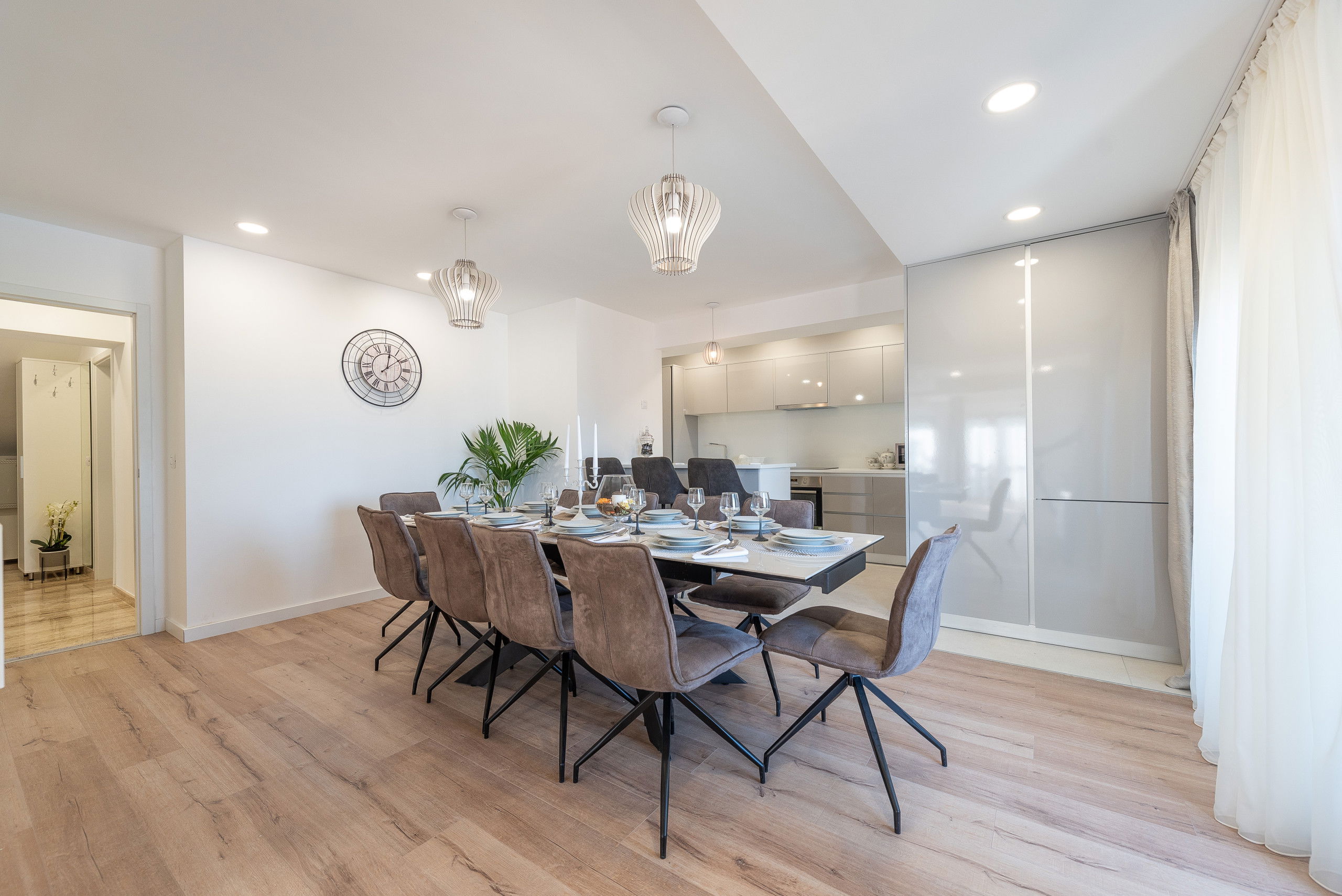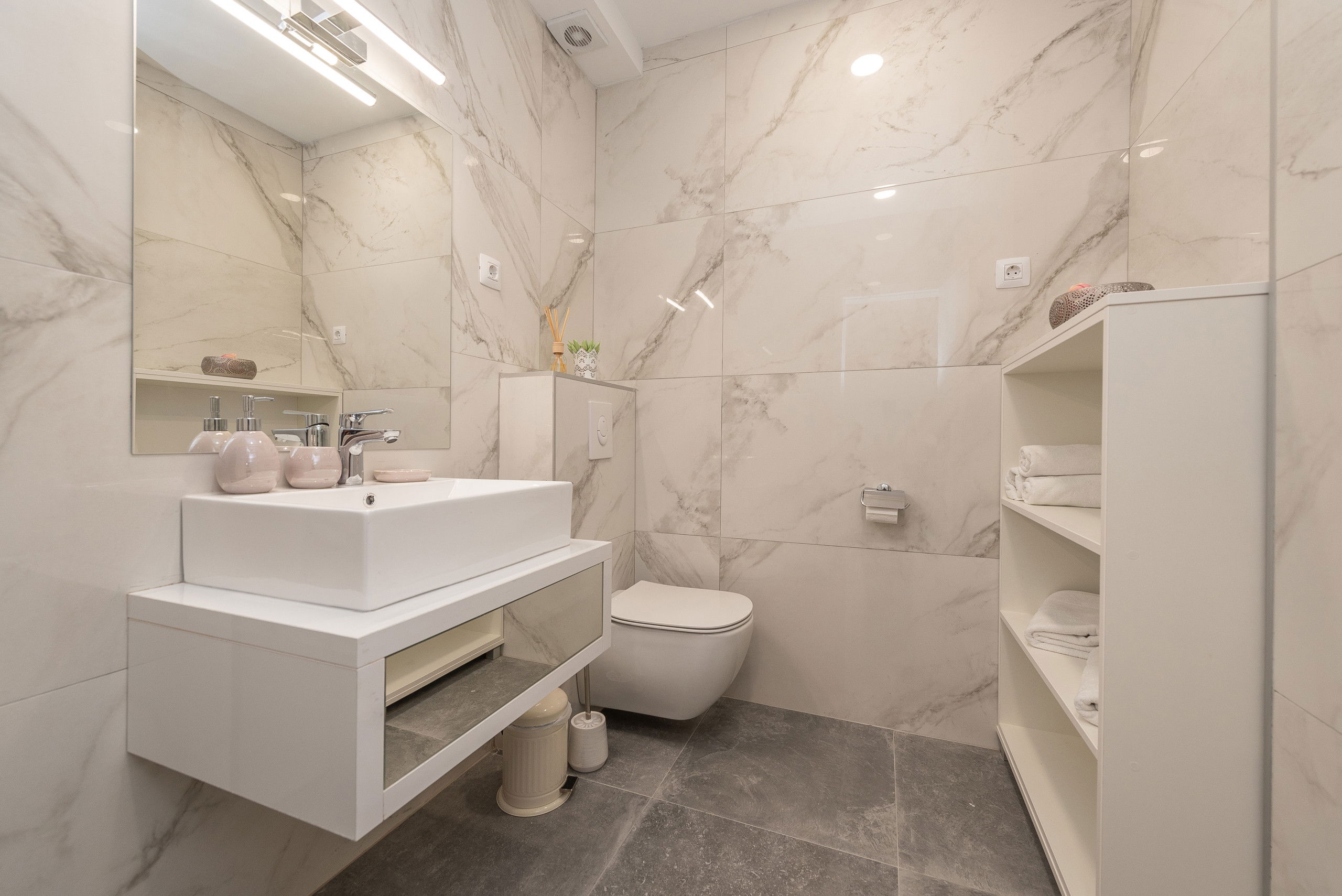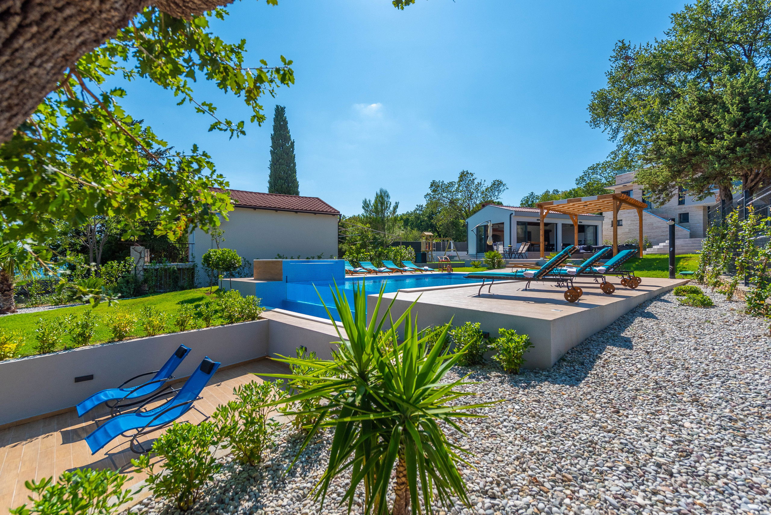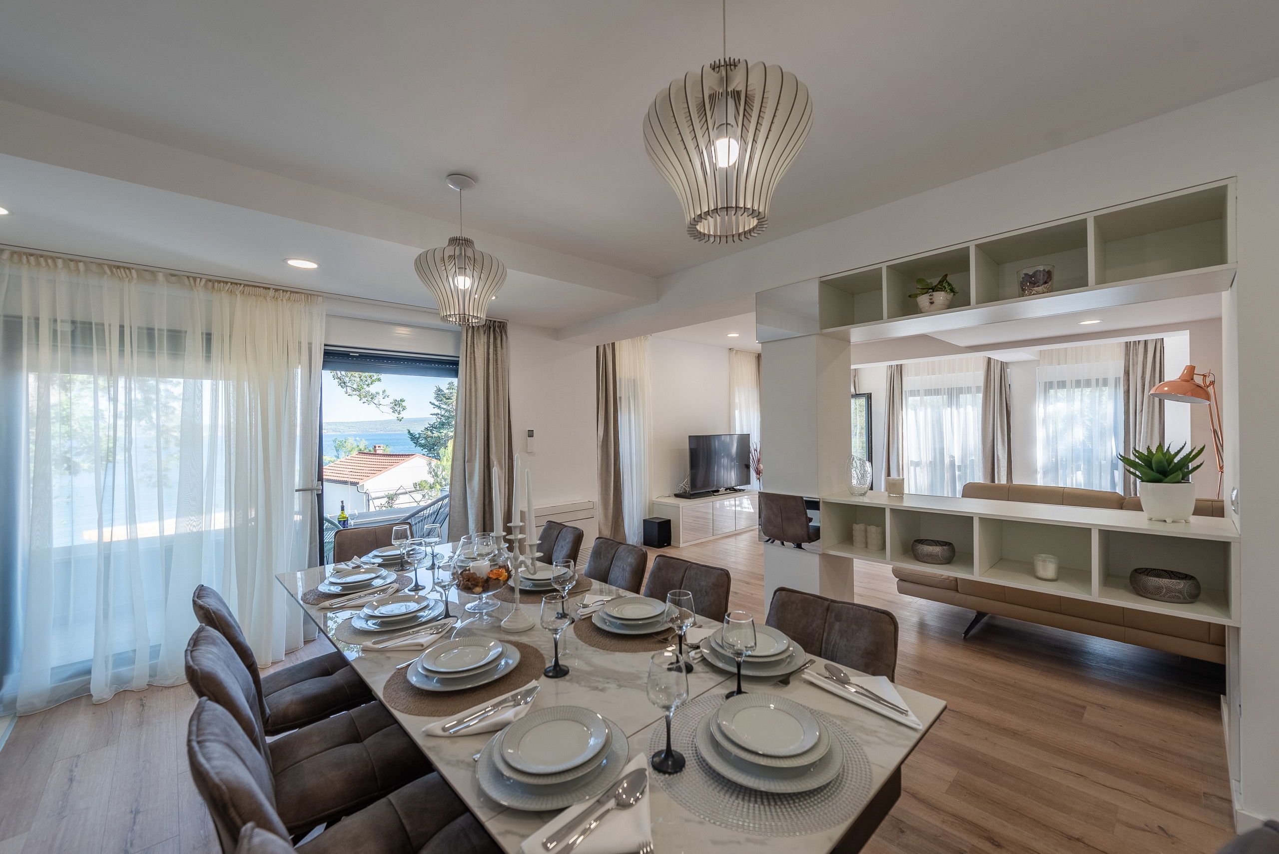 Villa Promenada was built in 2019 in a contemporary and modern style, and offers you 250 m2 of living space. It is only 5 meters from the nearest beach, where you will be able to explore the depths of the sea and swim in the Adriatic Sea. It is fully air-conditioned, and offers accommodation for a maximum of 12, and optimally 10 people. You will sleep in 5 bedrooms (2 are located on the ground floor, and the remaining 3 are on the upper floor), each of which has a double bed. There are also 5 bathrooms with showers and 2 separate toilets. As additional facilities, there is a washing machine, dryer and iron. The villa has 2 living rooms, which are equipped with a sofa, fireplace and television. One sofa serves as an extra bed for 2 people. The kitchen is equipped with everything you need to prepare delicious meals for family or friends, and there is a dining room with 10 seats.