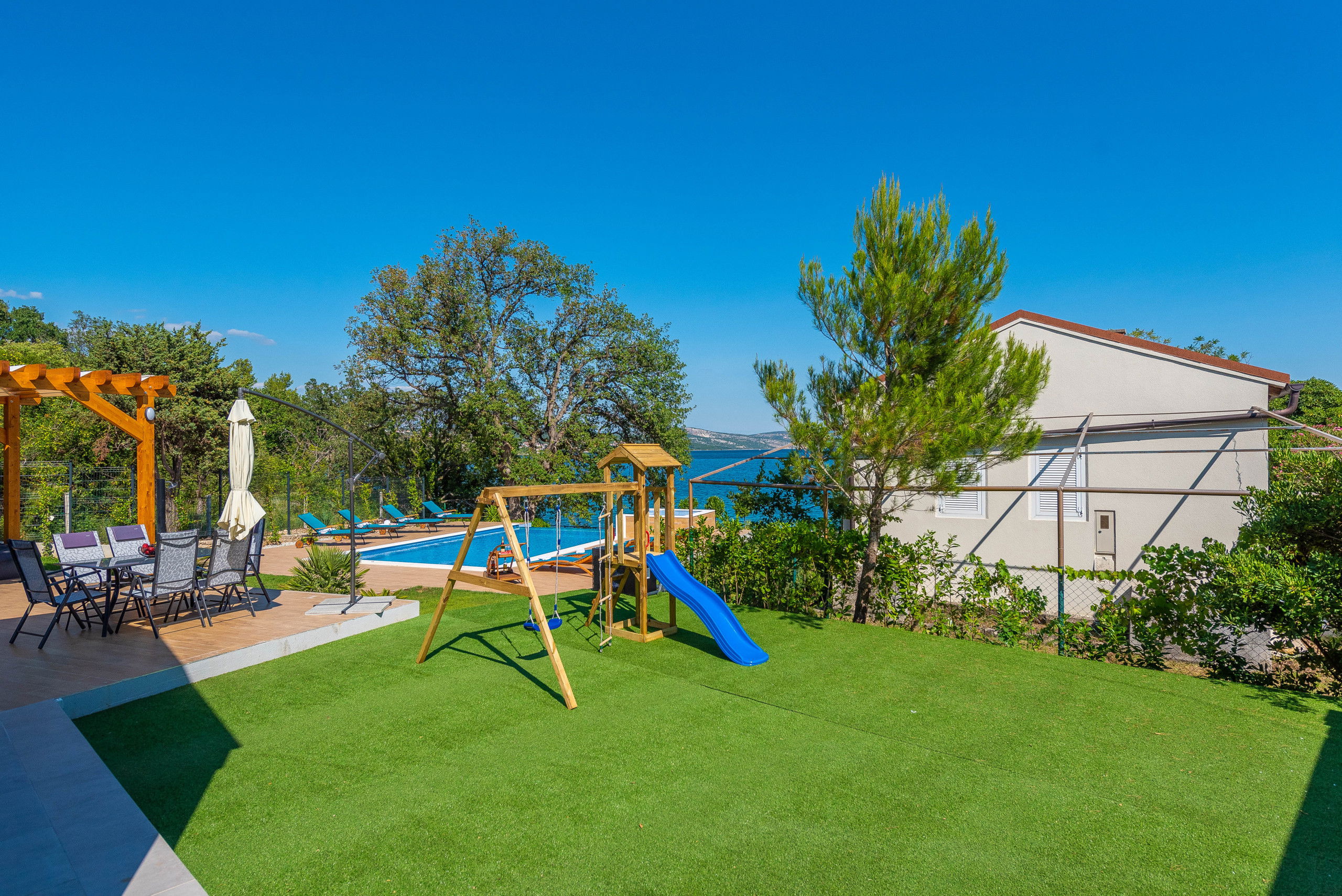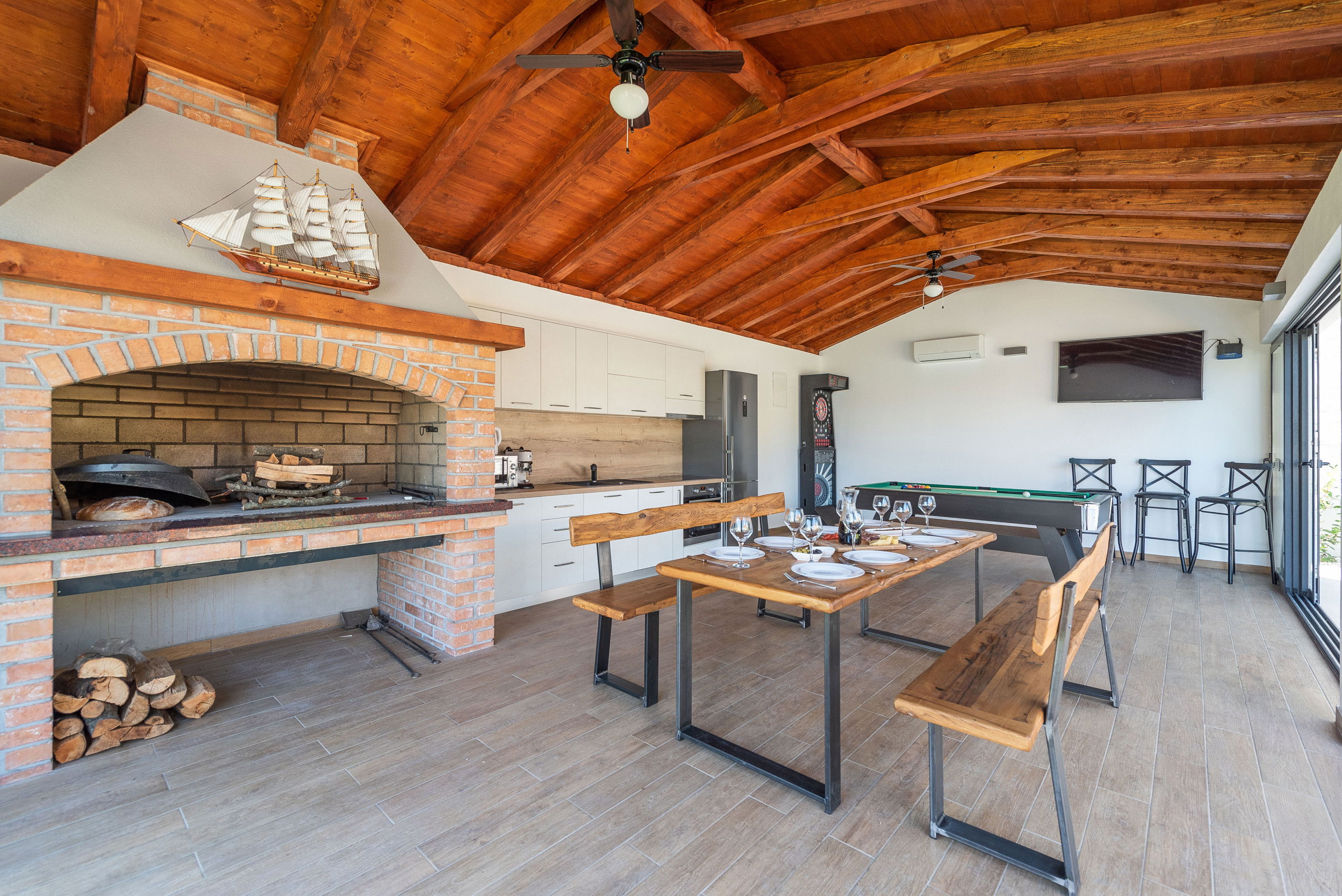 Next to the pool there is a separate room where you will enjoy preparing traditional Dalmatian dishes using the indoor charcoal or wood-fired grill. The tavern has a dining table, billiards, darts, kitchen and TV.