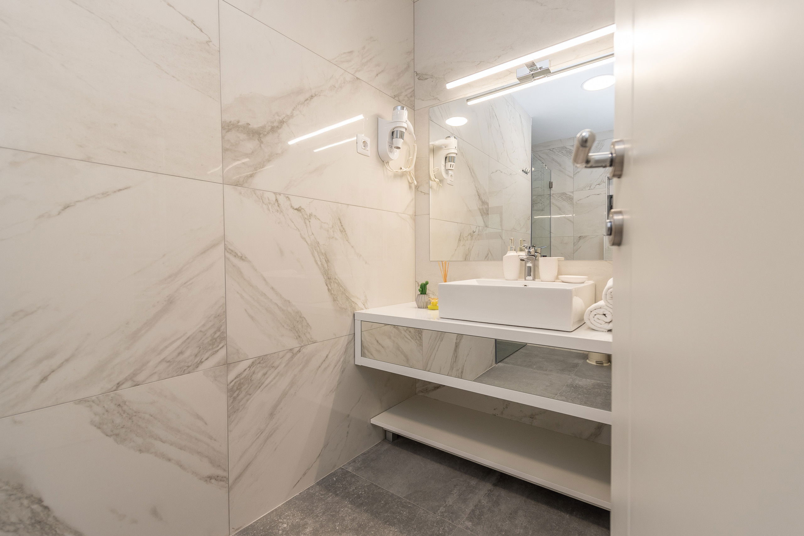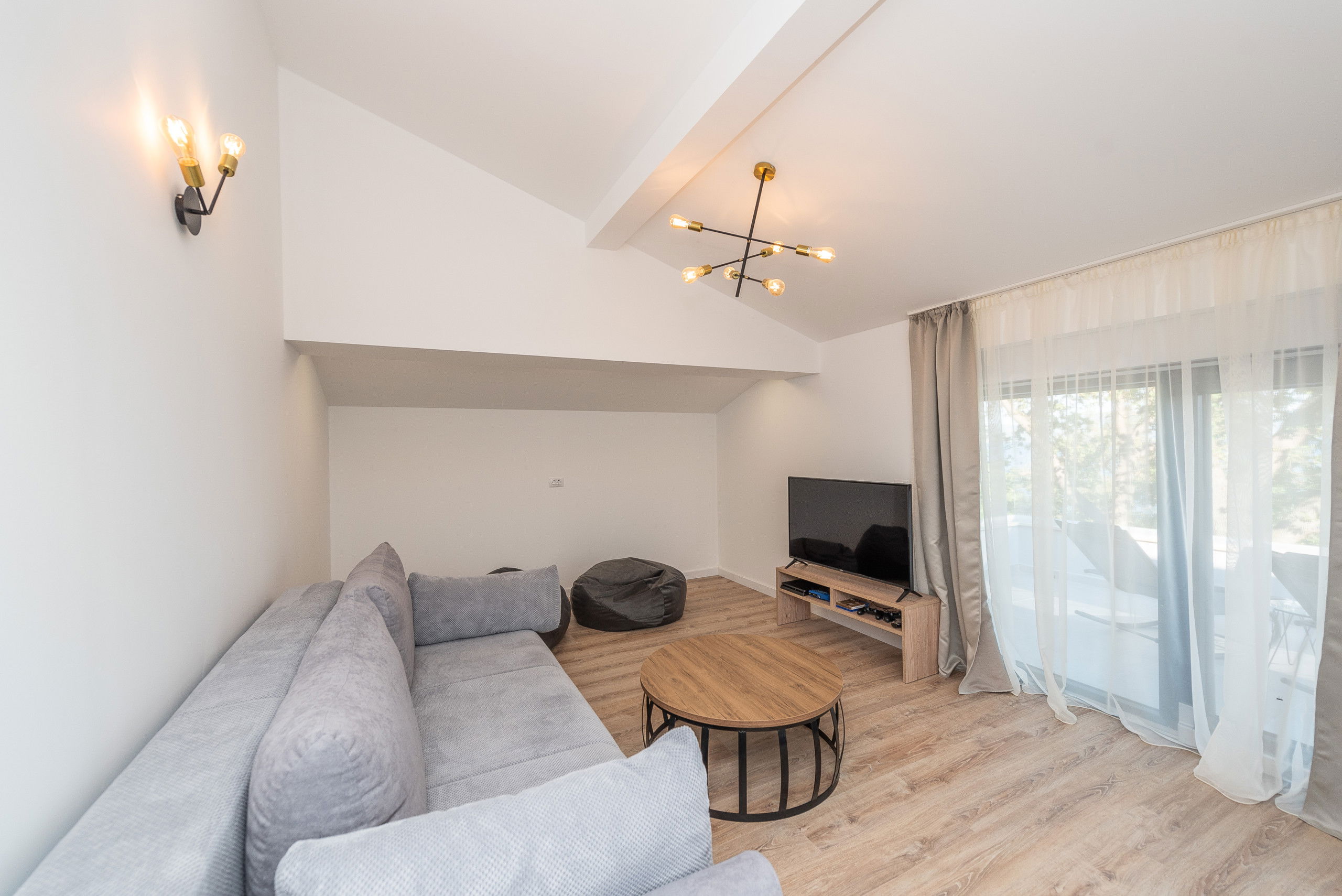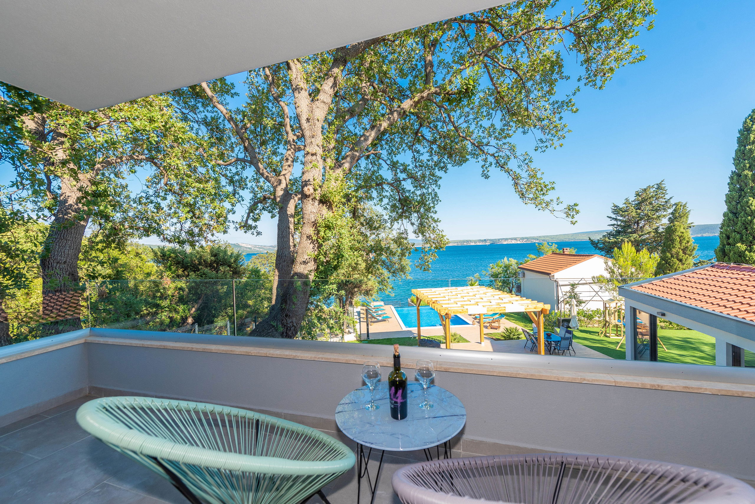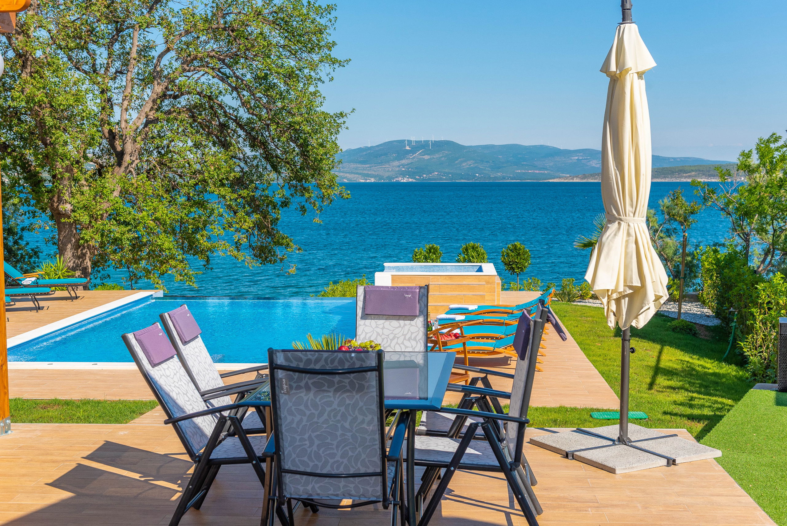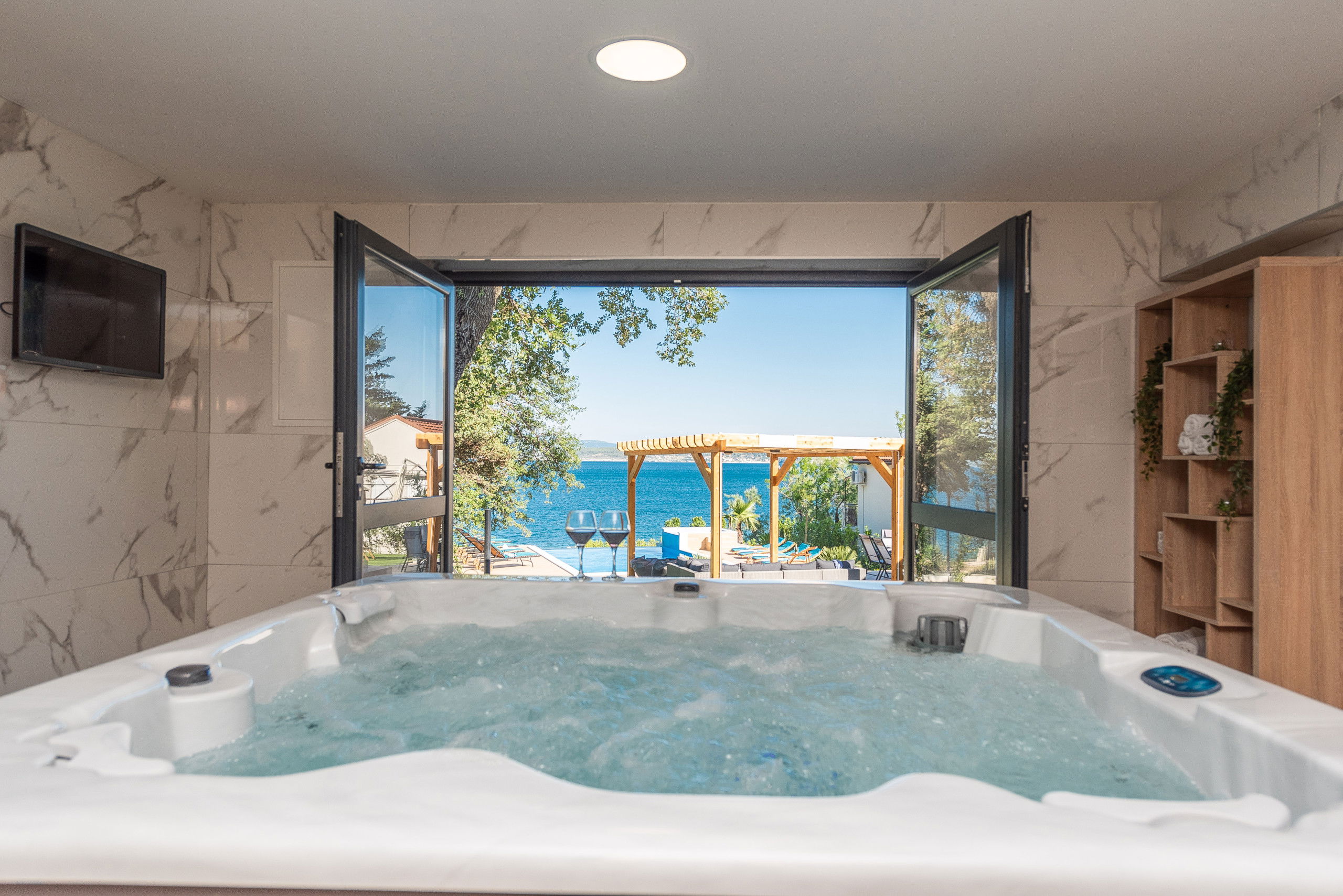 You will enjoy the outdoor terrace the most thanks to the heated infinity pool measuring 40 m2 with massage jets, next to which there are 8 sun loungers. The pool heating period is from 01.05. - 31.10. This will be the place where you will enjoy sunbathing and reading your favorite book. There is also a covered seating area, and balconies with a table and chairs overlooking the sea.