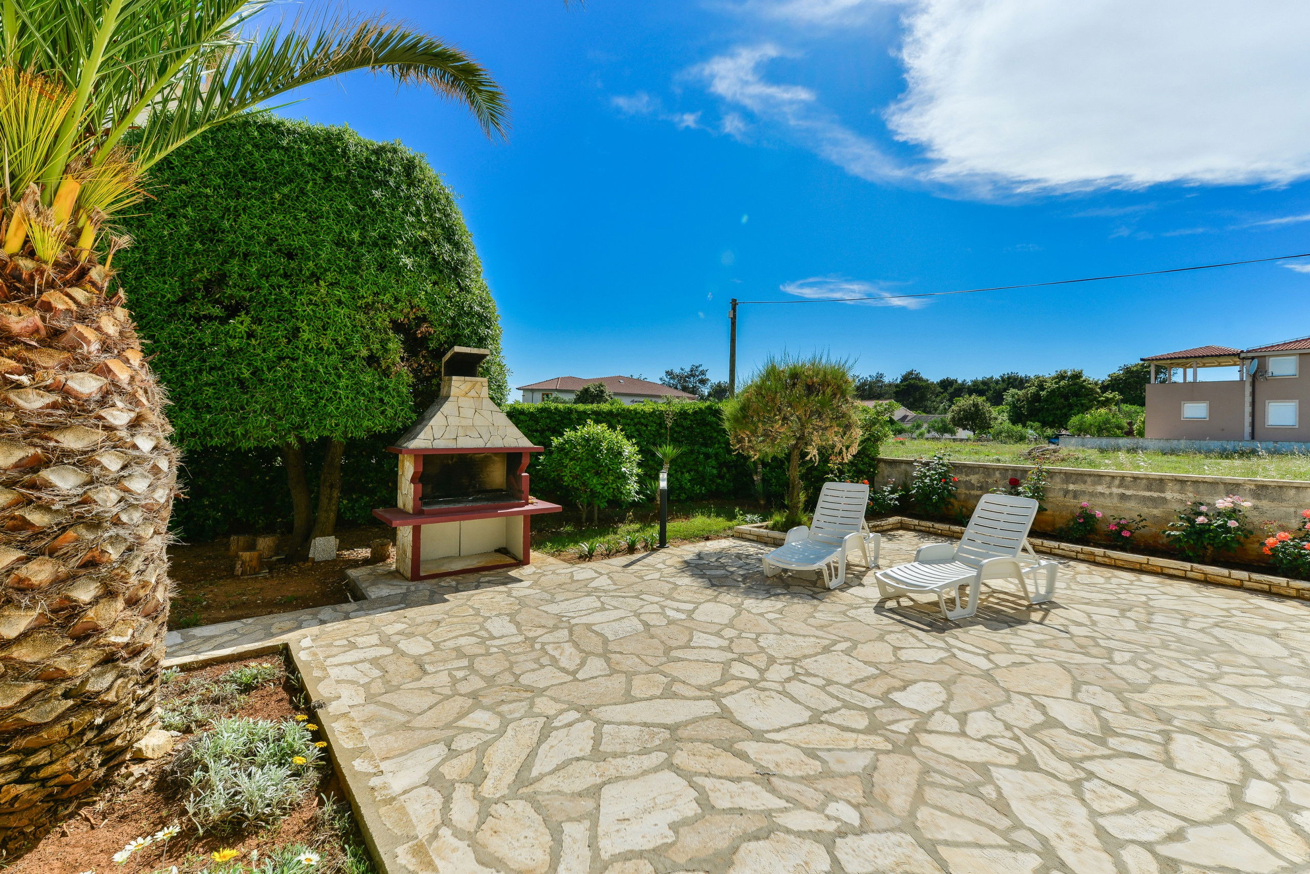 The outdoor terrace has a courtyard, deck chairs and an outdoor charcoal or wood-fired barbecue.