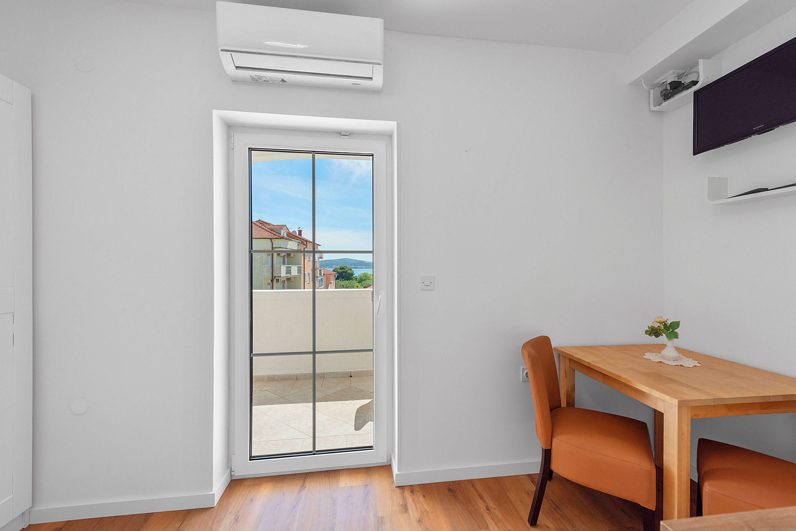Superior studio Tania 3 is located in the small Dalmatian town of Sv. Filip i Jakov. It is a small tourist resort in Zadar County, Croatia. It is located on the coast of the Pašman Channel, 25 km southeast of the city of Zadar and only 3 km northwest of the old royal town of Biograd na Moru. The main beach stretches along the entire center and is a perfect combination of sand, gravel and stone, which makes it ideal for enjoying the joys of the sea. In addition, Sveti Filip i Jakov can be an excellent starting point for sightseeing in the National Parks Krka, Kornati, Plitvice and Paklenica, as well as visiting beautiful cities such as Zadar, Biograd, Primošten and Šibenik. Superior studio Tania is part of an apartment complex, located on the ground floor and is suitable for a maximum of 2 people. The studio apartment is air-conditioned and has a TV. There is also a small kitchen, a table with chairs and a double bed. The bathroom is equipped with a shower. This studio apartment also has a balcony with a seating area and a sea view, where you can drink your coffee in peace and quiet in the morning. In addition to the morning sun, it has natural shade during the day, which ensures a pleasant stay throughout the day.