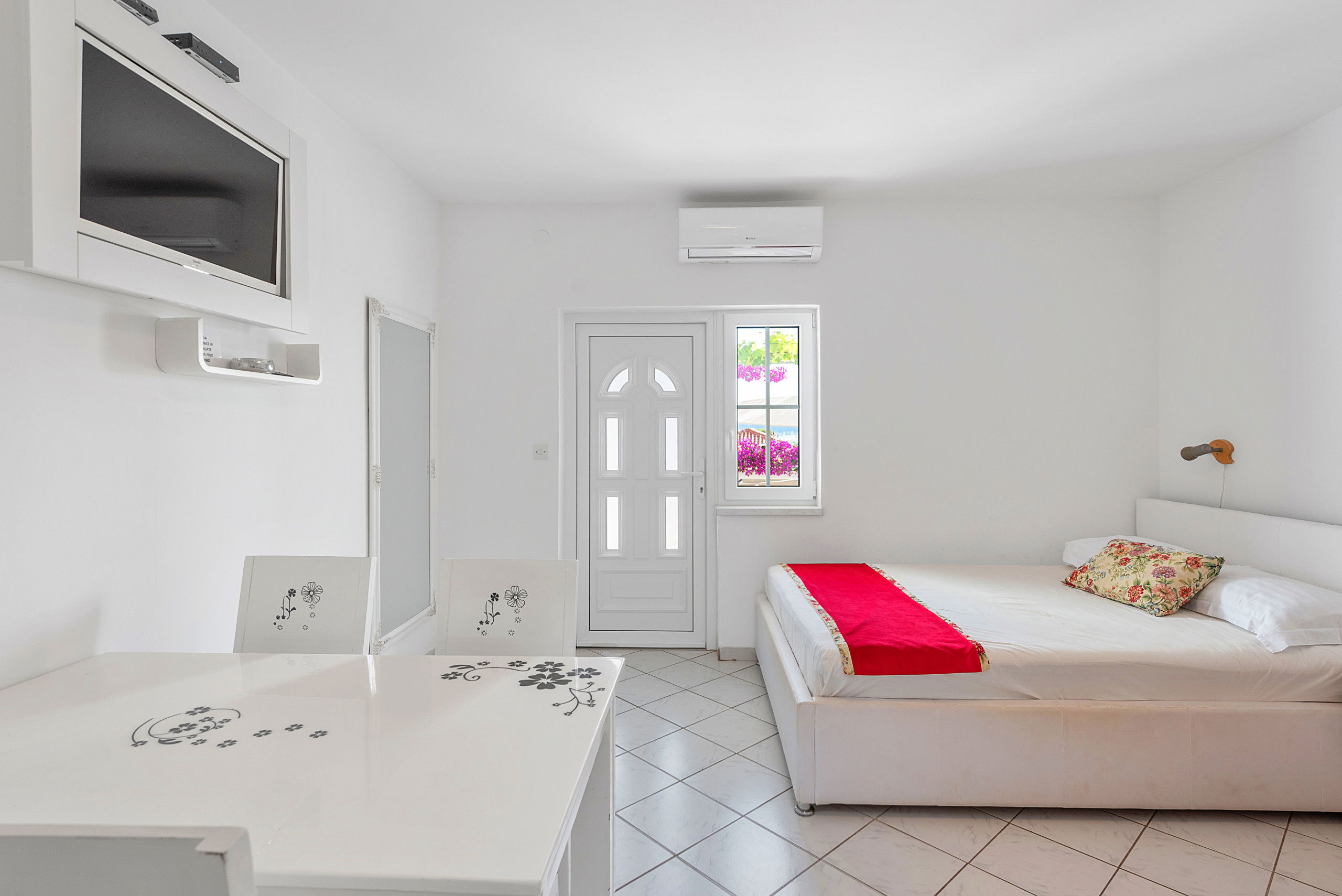 Superior studio Tania 16 is located in the small Dalmatian town of Sv. Filip i Jakov. It is a small tourist resort in Zadar County, Croatia. It is located on the coast of the Pašman Channel, 25 km southeast of the city of Zadar and only 3 km northwest of the old royal town of Biograd na Moru. The main beach stretches along the entire center and is a perfect combination of sand, gravel and stone, which makes it ideal for enjoying the joys of the sea. In addition, Sveti Filip i Jakov can be an excellent starting point for sightseeing in the National Parks Krka, Kornati, Plitvice and Paklenica, as well as visiting beautiful cities such as Zadar, Biograd, Primošten and Šibenik. Superior studio Tania is part of an apartment complex, located on the ground floor and is suitable for a maximum of 2 people. If you are traveling with a child, an extra bed is available. The studio apartment is air-conditioned and has a TV. There is also a small kitchen, a table with chairs and a double bed. The bathroom is equipped with a shower. In front of the apartment there is a beautiful terrace with vines that provides shade and a beautiful view of the sea. In addition to the morning sun, it has natural shade during the day, which ensures a pleasant stay throughout the day.