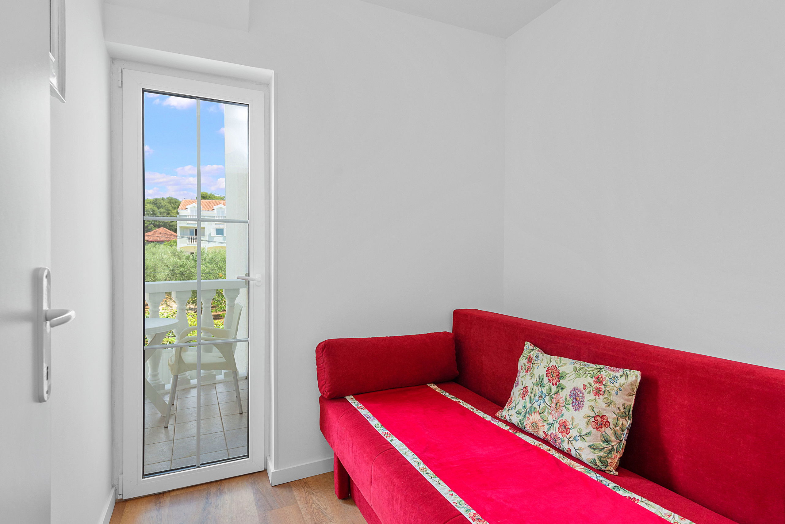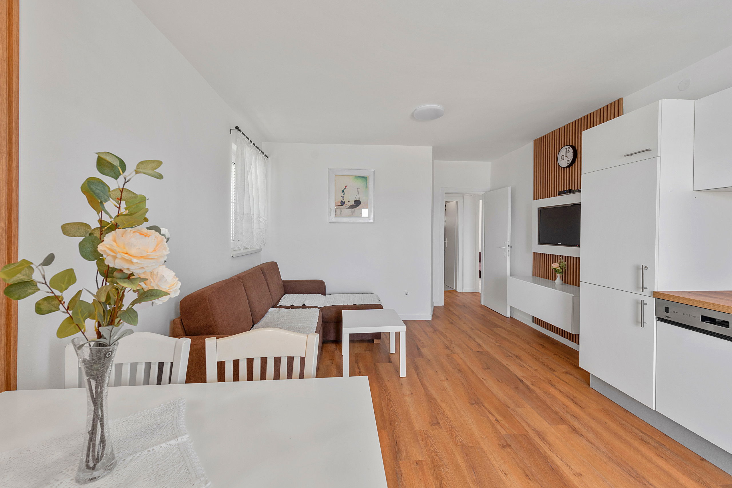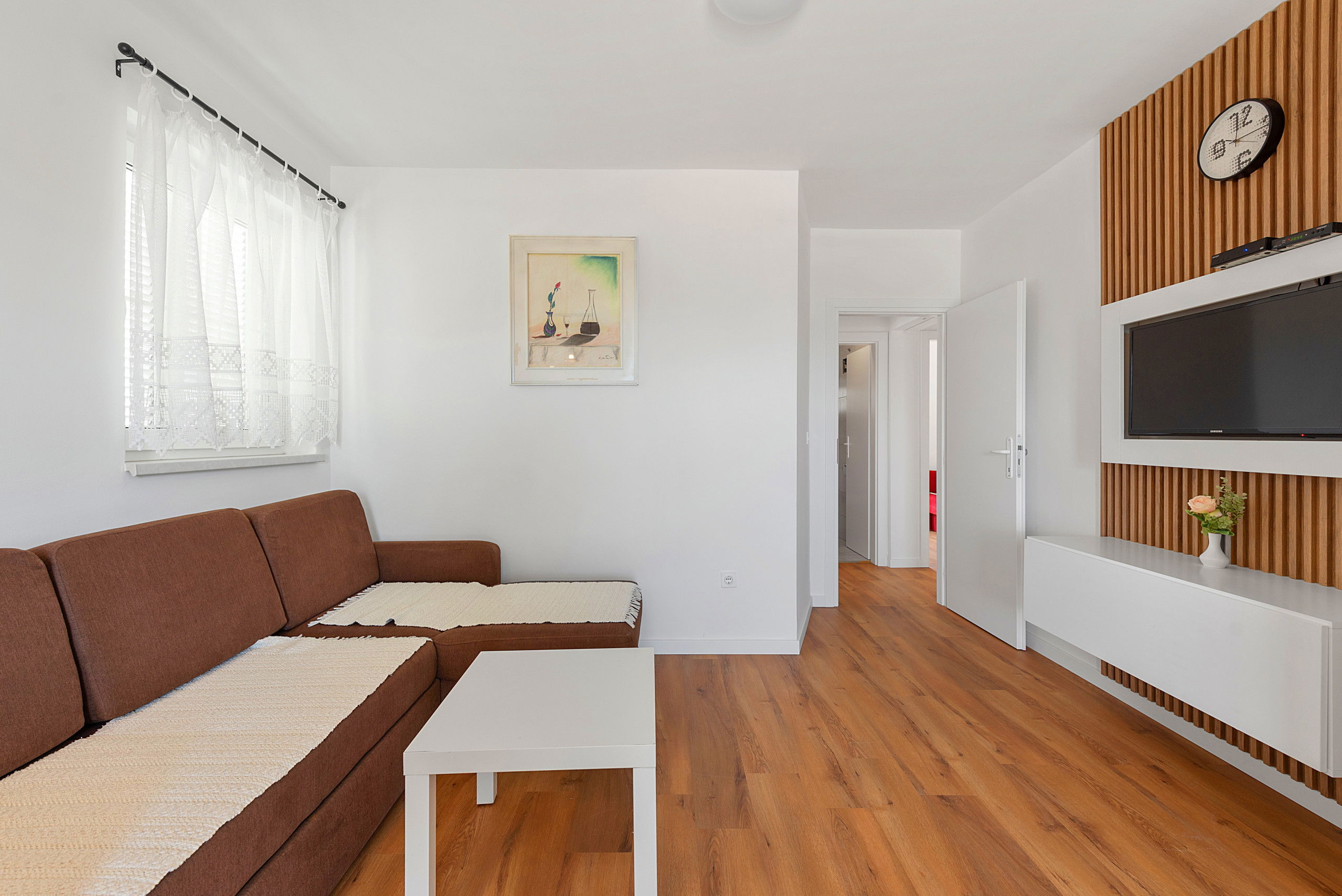Superior apartment Tania 8 is located in the small Dalmatian town of Sv. Filip i Jakov. It is a small tourist resort in Zadar County, Croatia. It is located on the coast of the Pašman Channel, 25 km southeast of the city of Zadar and only 3 km northwest of the old royal town of Biograd na Moru. The main beach stretches along the entire center and is a perfect combination of sand, gravel and stone, which makes it ideal for enjoying the joys of the sea. In addition, Sveti Filip i Jakov can be an excellent starting point for sightseeing in the National Parks Krka, Kornati, Plitvice and Paklenica, as well as visiting beautiful cities such as Zadar, Biograd, Primošten and Šibenik. Superior apartment Tania is part of an apartment complex, located on the 1st floor and is suitable for a maximum of 4 people. The apartment is air-conditioned and has a TV. There is also a kitchen, a table with chairs and 2 bedrooms. One has a double bed, while the other has 1 single sofa bed. An additional person can sleep on a sofa bed. The bathroom is equipped with a shower. This apartment also has a balcony with a seating area and a view of the garden, where you can drink your morning coffee in peace and quiet.
