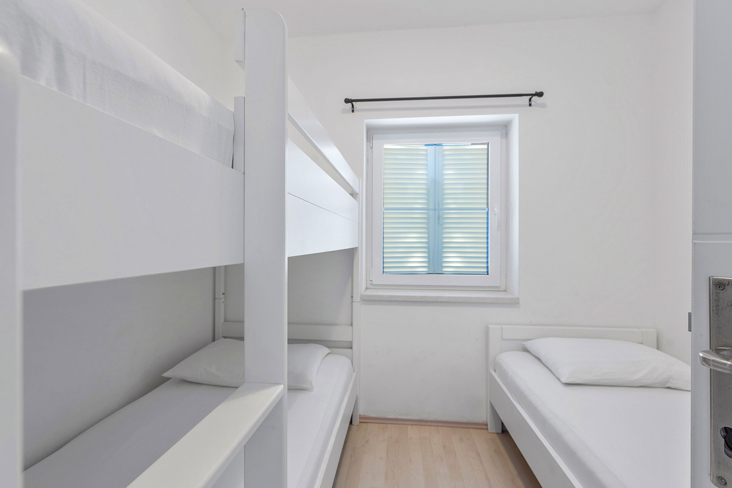 Superior apartment Tania 15 is located in the small Dalmatian town of Sv. Filip i Jakov. It is a small tourist resort in Zadar County, Croatia. It is located on the coast of the Pašman Channel, 25 km southeast of the city of Zadar and only 3 km northwest of the old royal town of Biograd na Moru. The main beach stretches along the entire center and is a perfect combination of sand, gravel and stone, which makes it ideal for enjoying the joys of the sea. In addition, Sveti Filip i Jakov can be an excellent starting point for sightseeing in the National Parks Krka, Kornati, Plitvice and Paklenica, as well as visiting beautiful cities such as Zadar, Biograd, Primošten and Šibenik. Superior apartment Tania is part of an apartment complex, located on the ground floor and is suitable for a maximum of 5 people. The apartment is air-conditioned and has a TV. There is also a kitchen, a table with chairs and 2 bedrooms. One room has 1 single bed and a bunk bed next to it. The second room has 1 double bed. The bathroom is equipped with a shower. This apartment also has a balcony with a seating area and a sea view, where you can drink your morning coffee in peace and quiet.