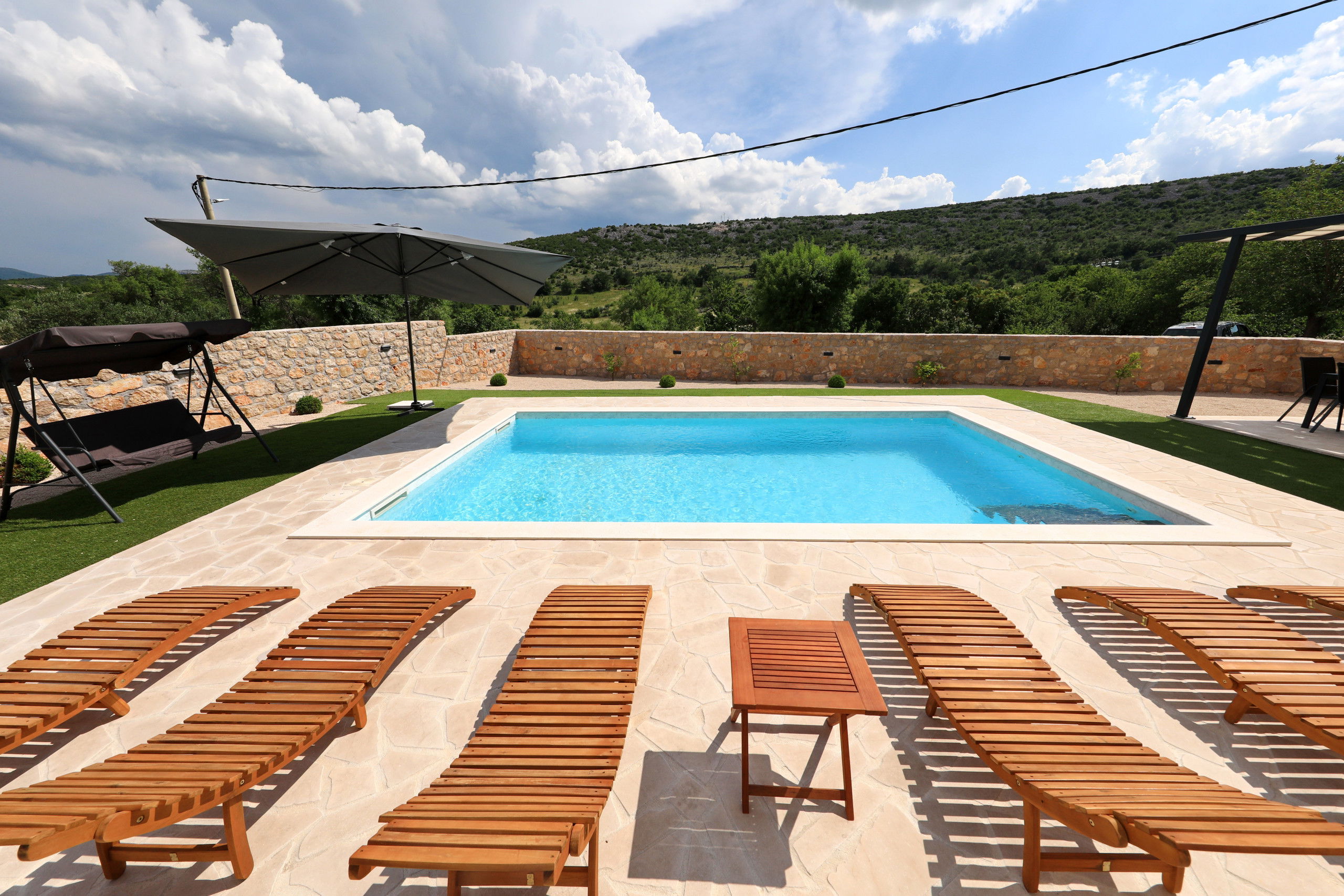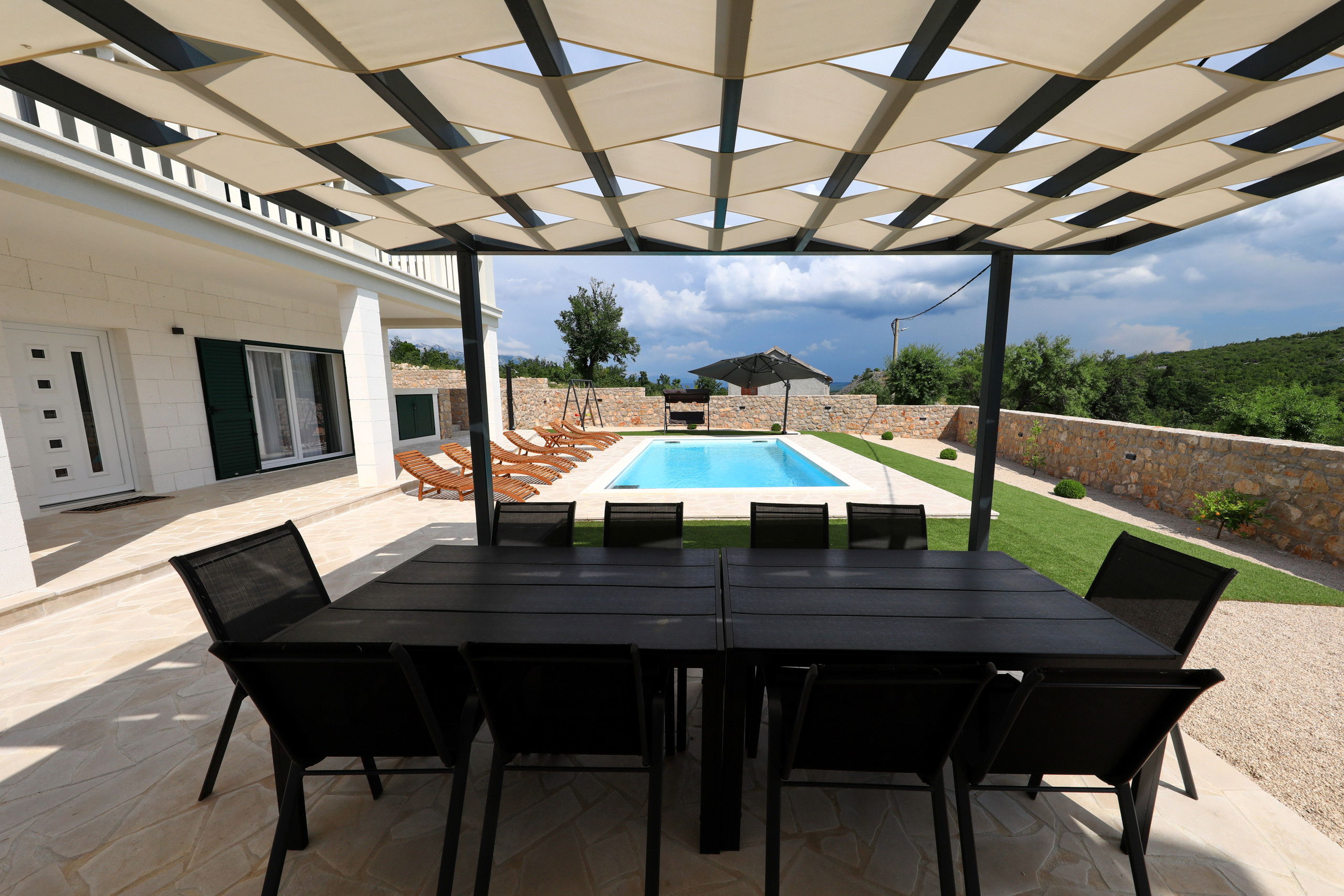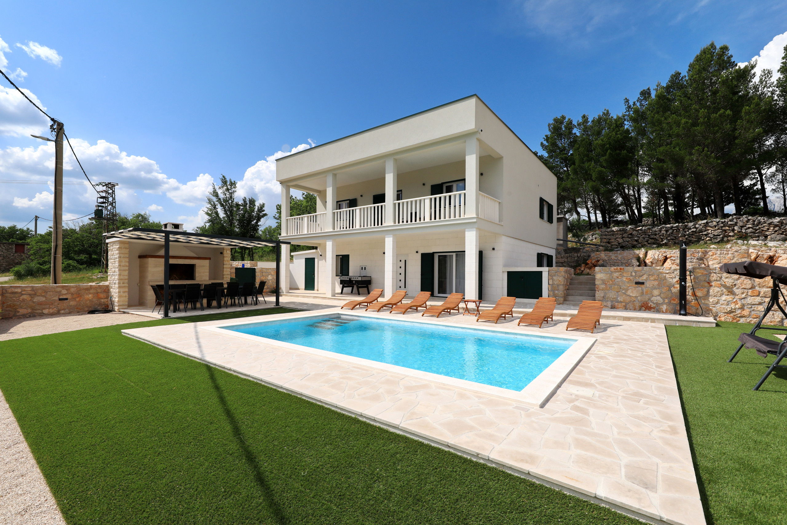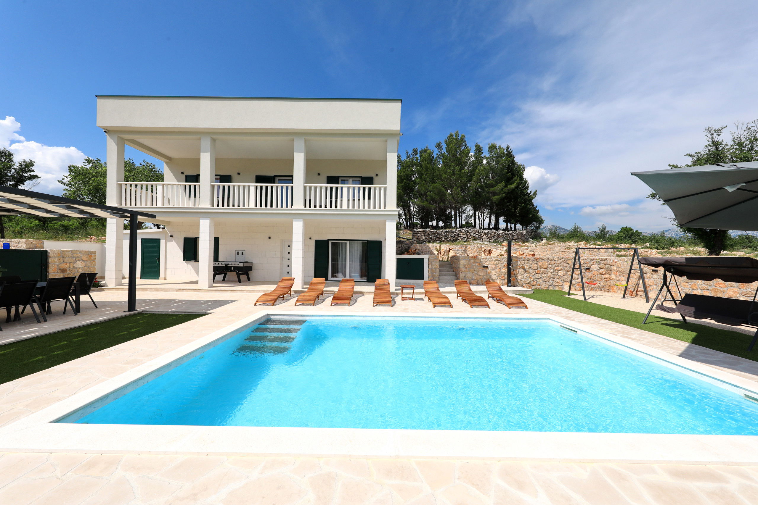 Outside, you will find a large heated swimming pool with sun loungers, parasols and a Hollywood swing that invites you to relax. A large dining table under the pergola and in front of the built-in barbecue offers the perfect setting for relaxed barbecue evenings by the pool, where you can try the preparation of Dalmatian specialties. In addition, there is a large balcony with a seating area, from which you can enjoy a beautiful view of the Velebit mountain range.