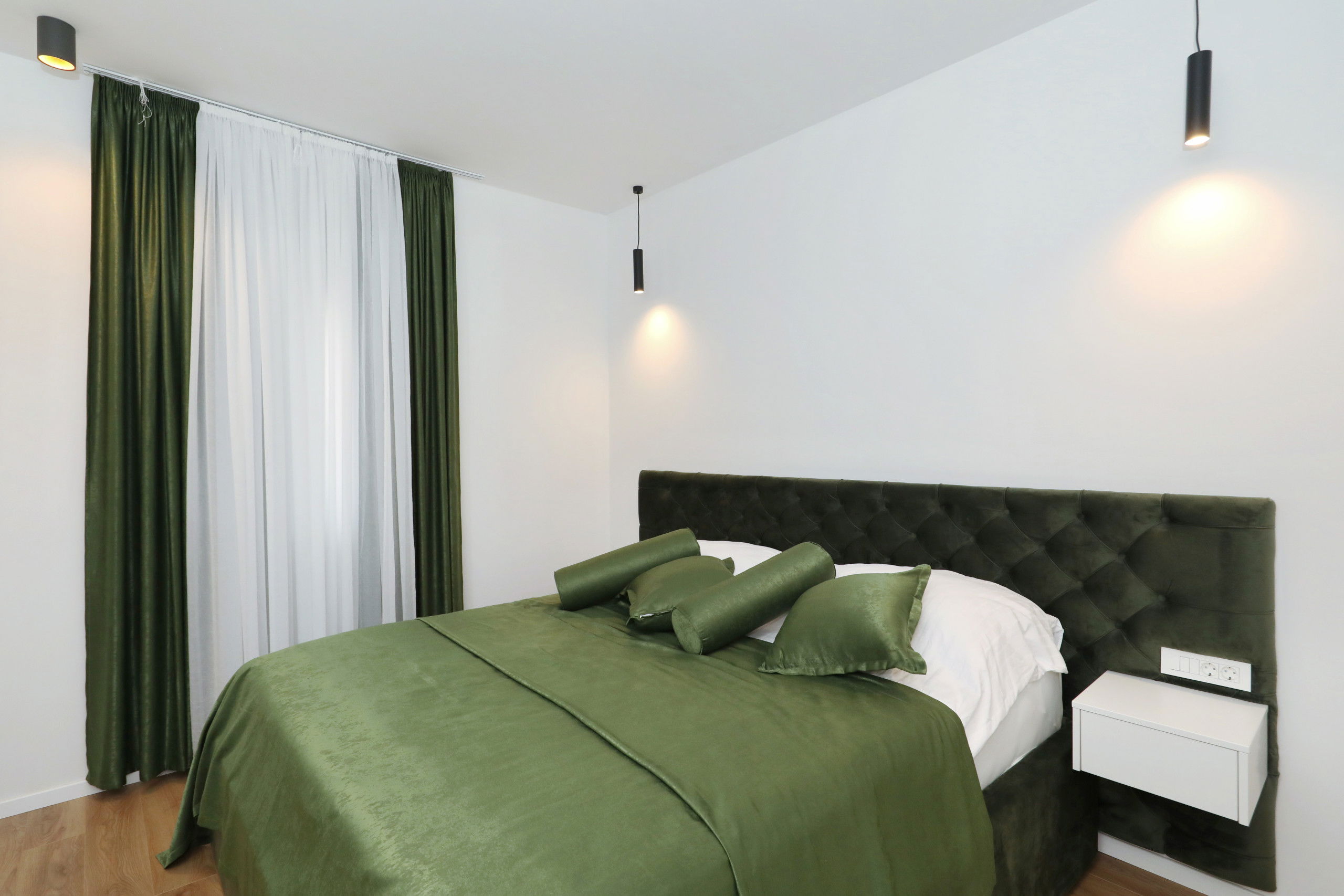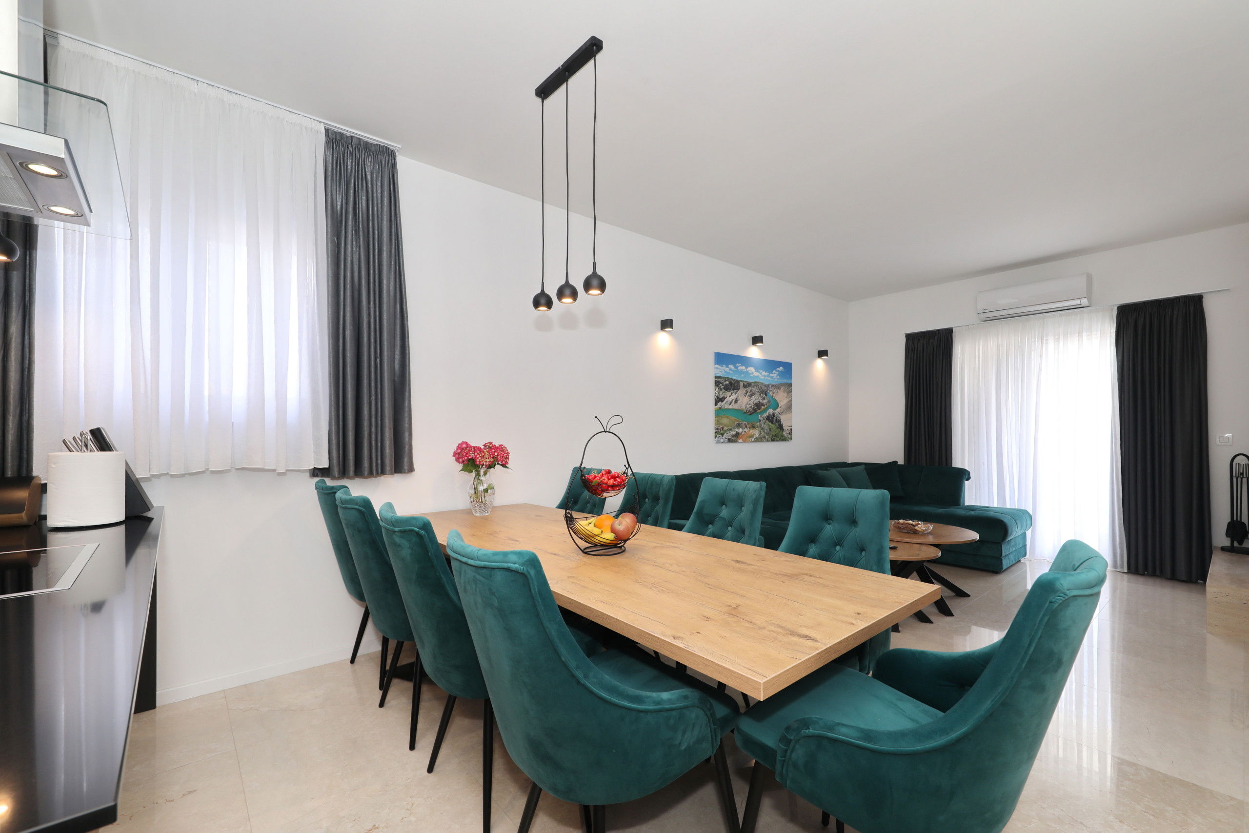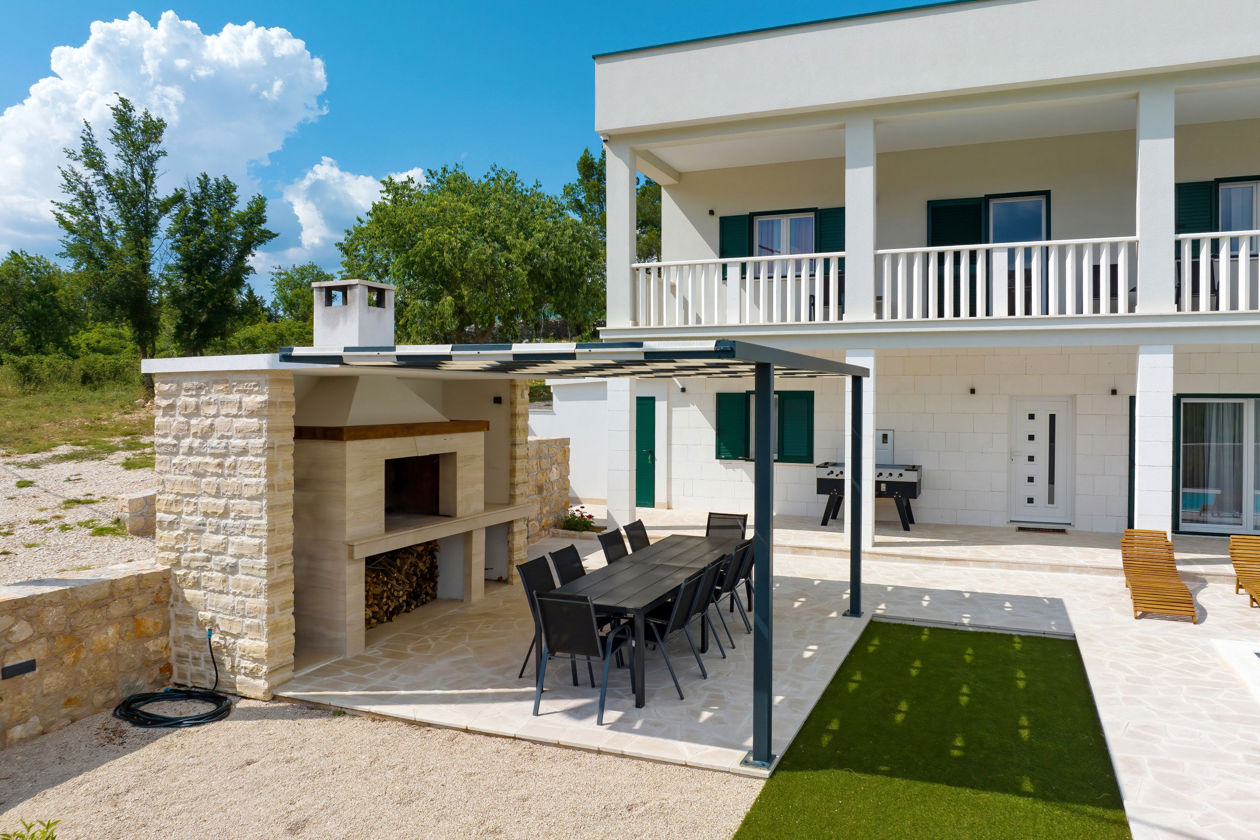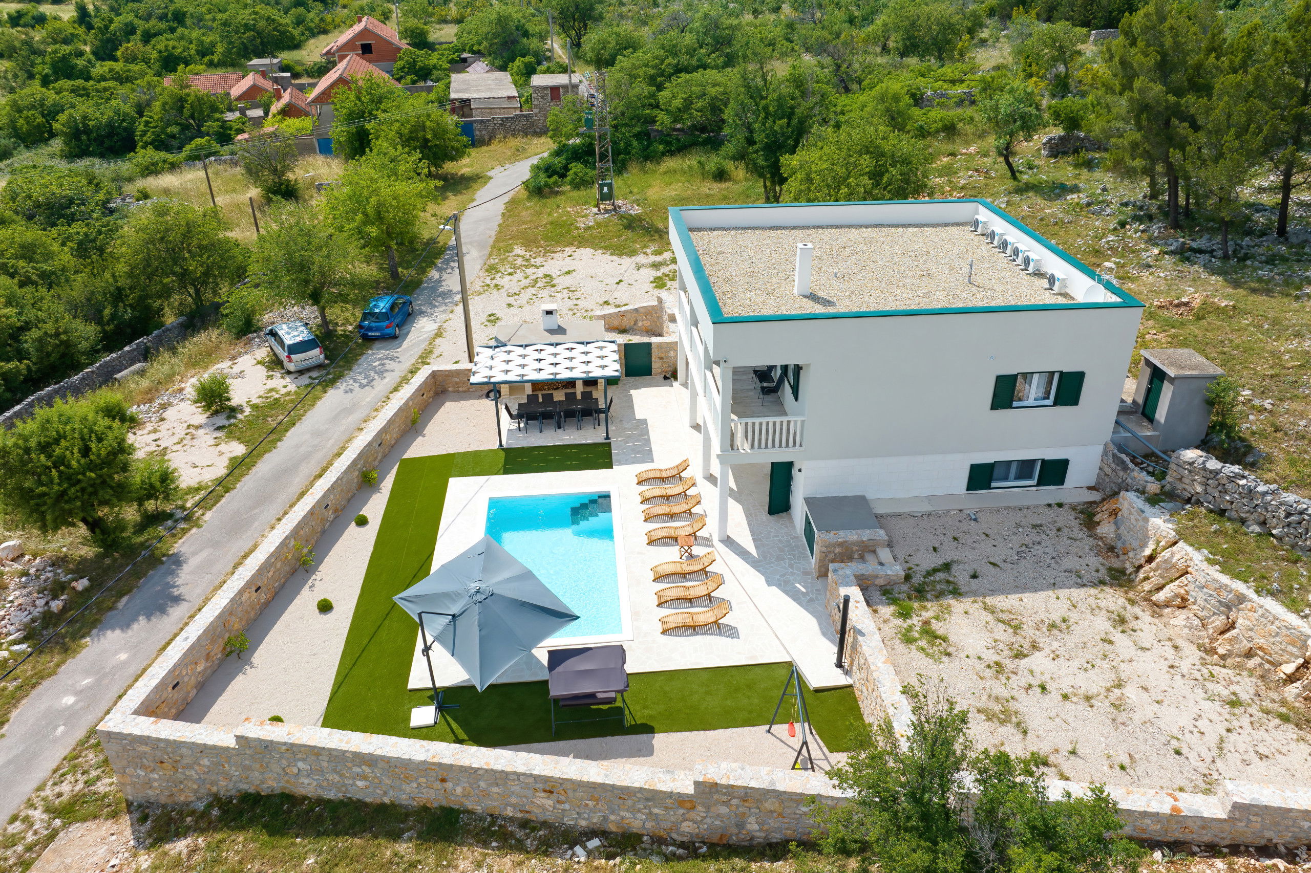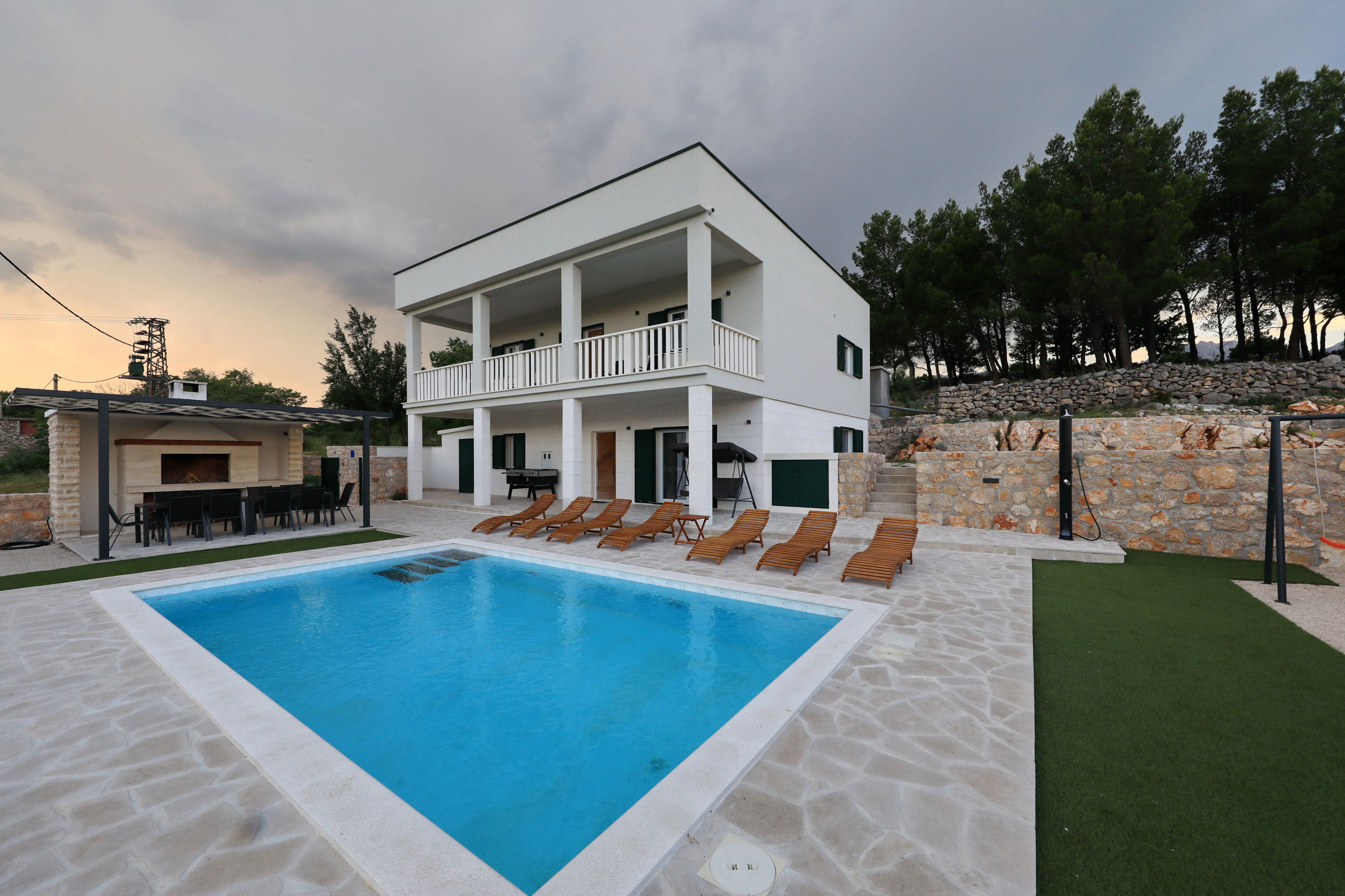 Outside, you will find a large heated swimming pool with sun loungers, parasols and a Hollywood swing that invites you to relax. A large dining table under the pergola and in front of the built-in barbecue offers the perfect setting for relaxed barbecue evenings by the pool, where you can try the preparation of Dalmatian specialties. In addition, there is a large balcony with a seating area, from which you can enjoy a beautiful view of the Velebit mountain range.