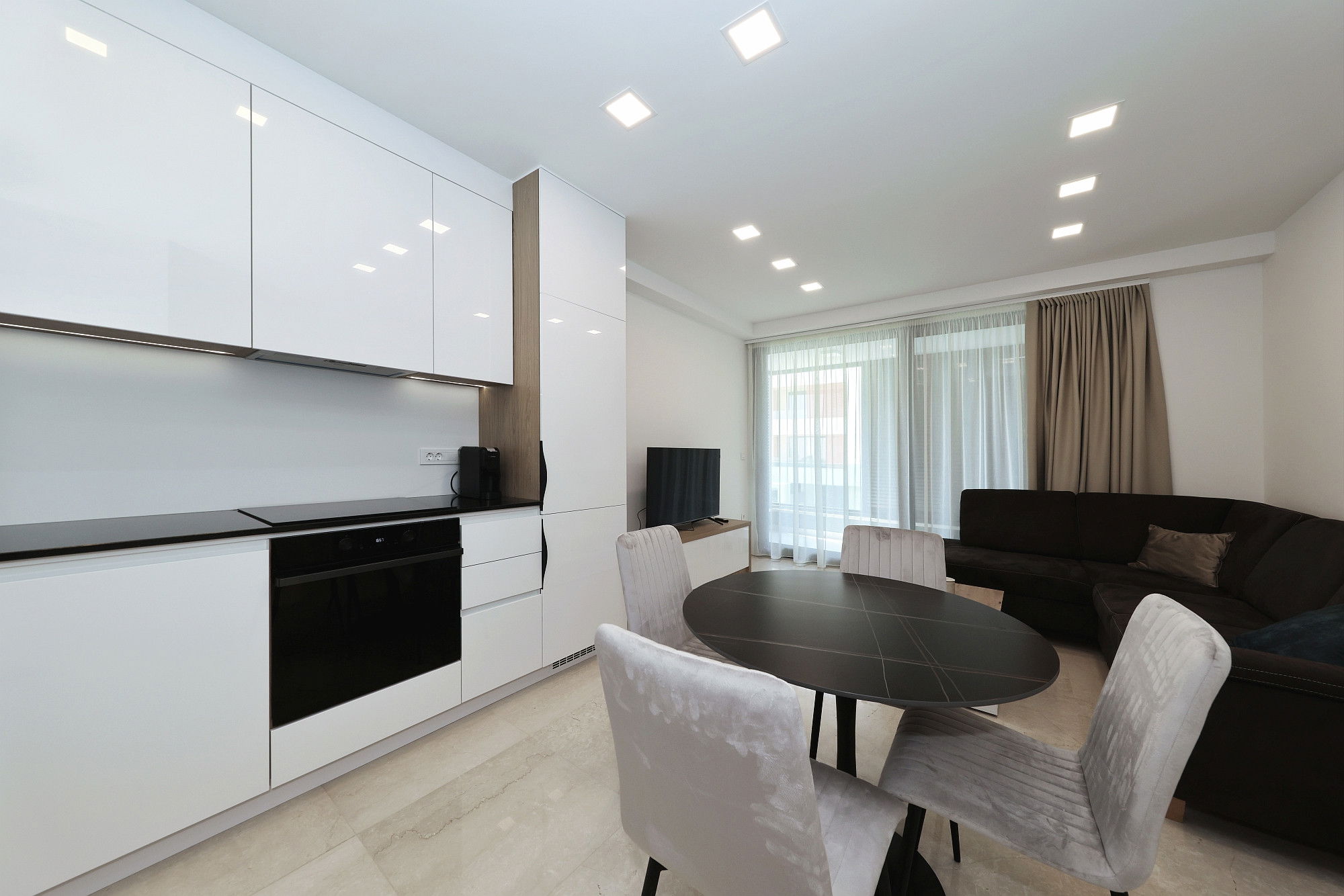 The modern kitchen is equipped with everything you need so that you can prepare your favorite dishes without any disturbances. The living room with a corner sofa will be the ideal place for evening socializing with your favorite movies and series. The dining room is located between the kitchen and the living room. If you are bringing 1 child with you, they can sleep on the couch.
