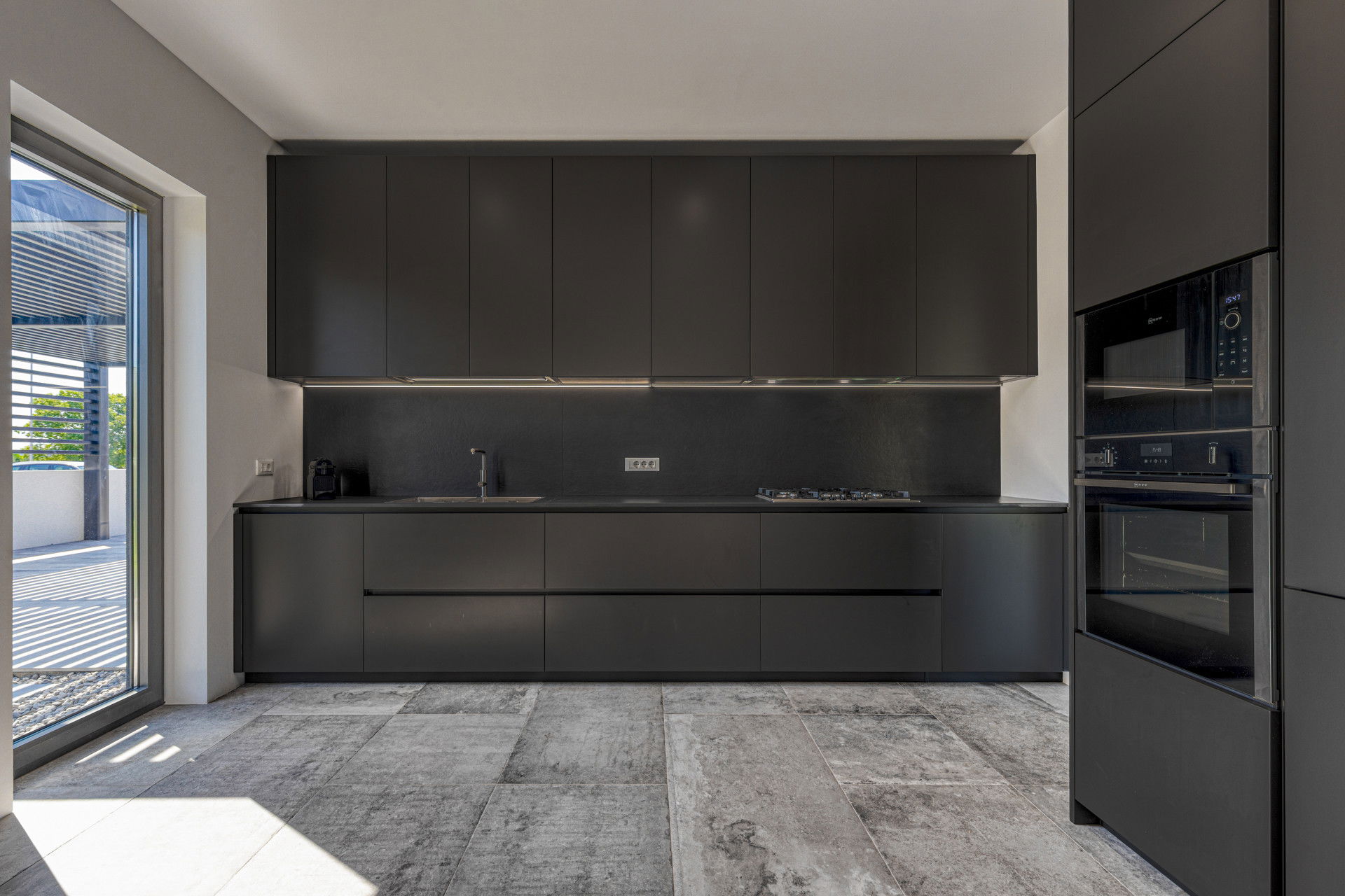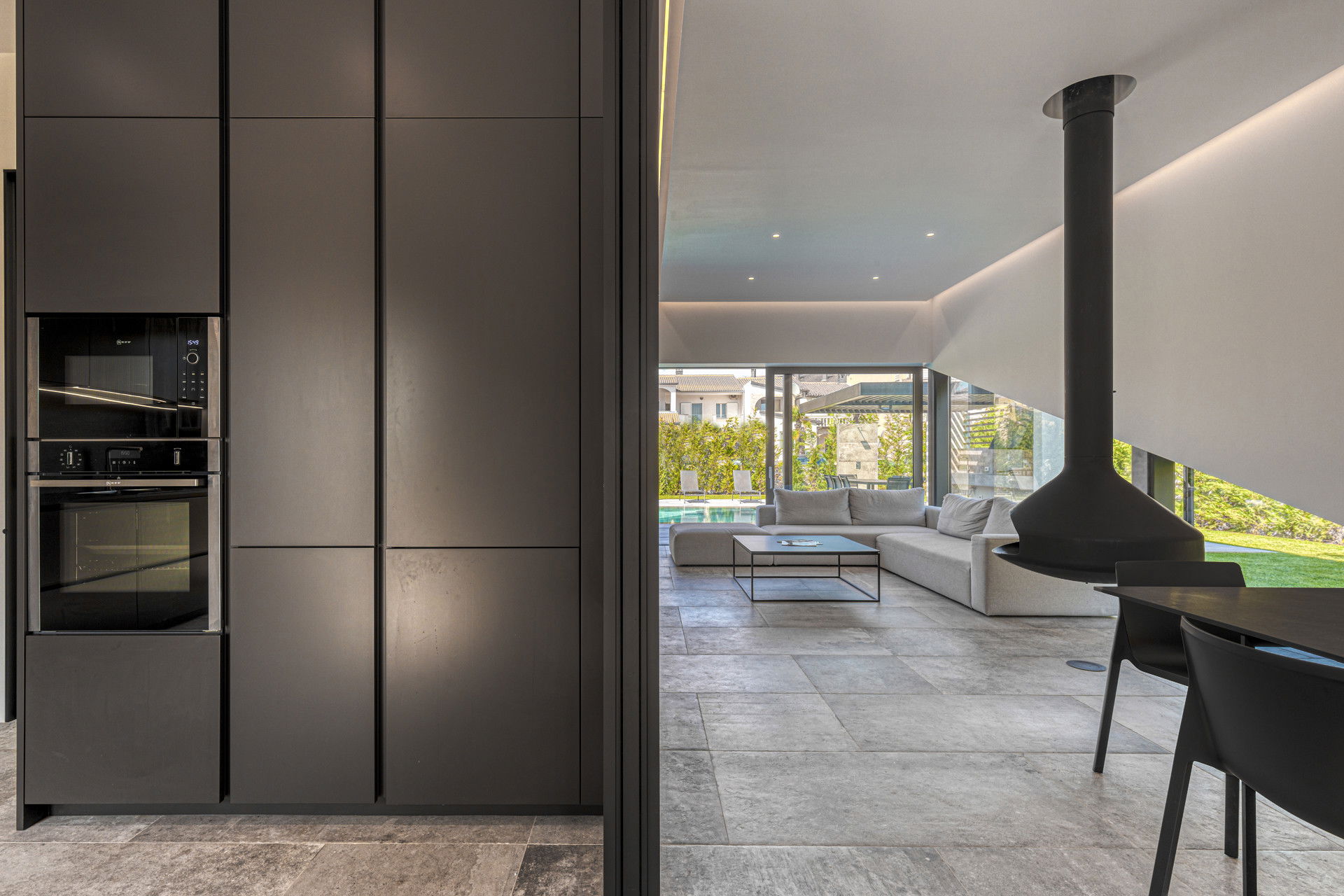 The airy living room surrounded by unusual windows is bathed in sunlight and equipped with a comfortable sofa and an interesting modern fireplace. The villa is fully air-conditioned and has Wifi. The modernly decorated kitchen contains everything you need to prepare your favorite dishes, and there is also a dining room with a dining table.