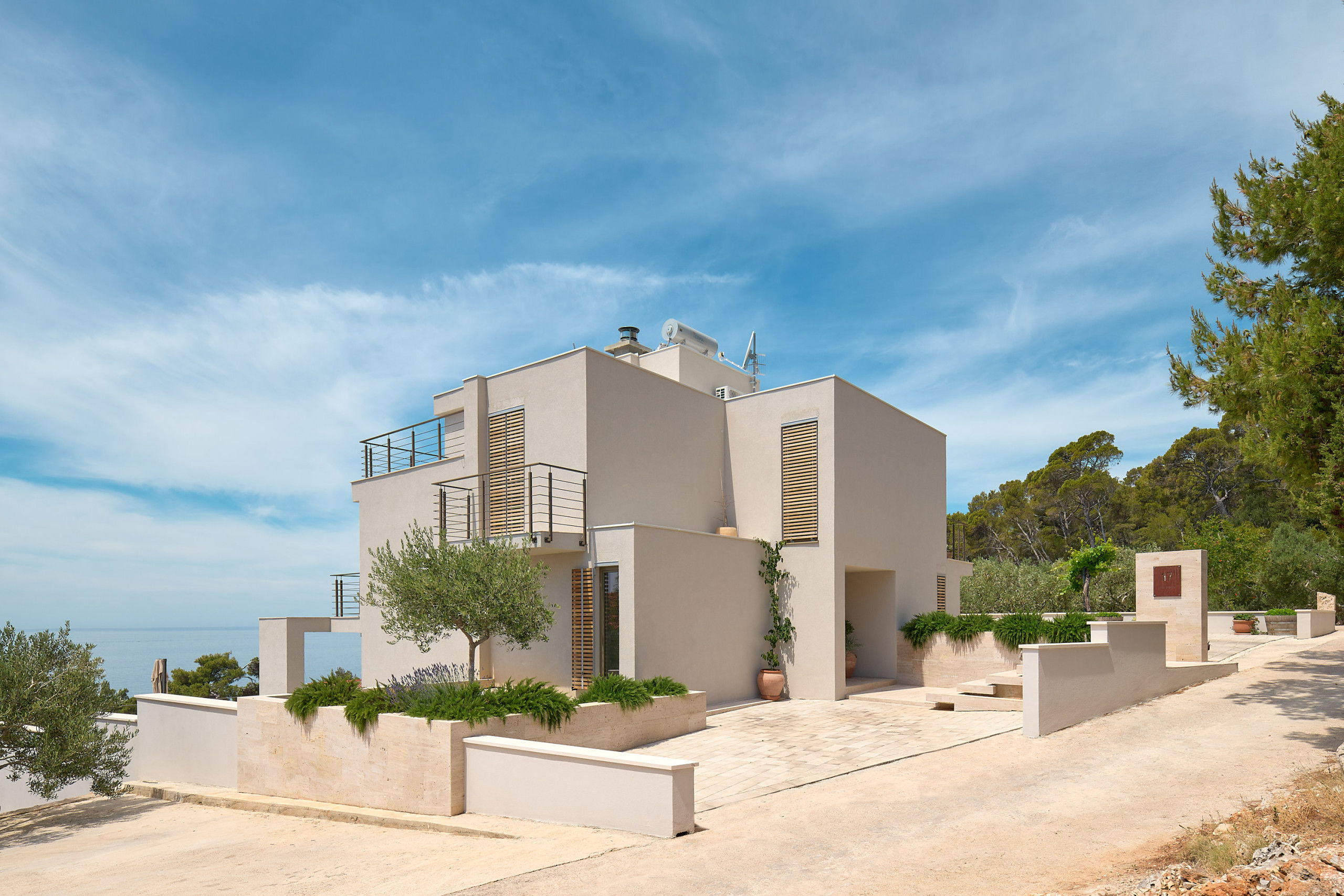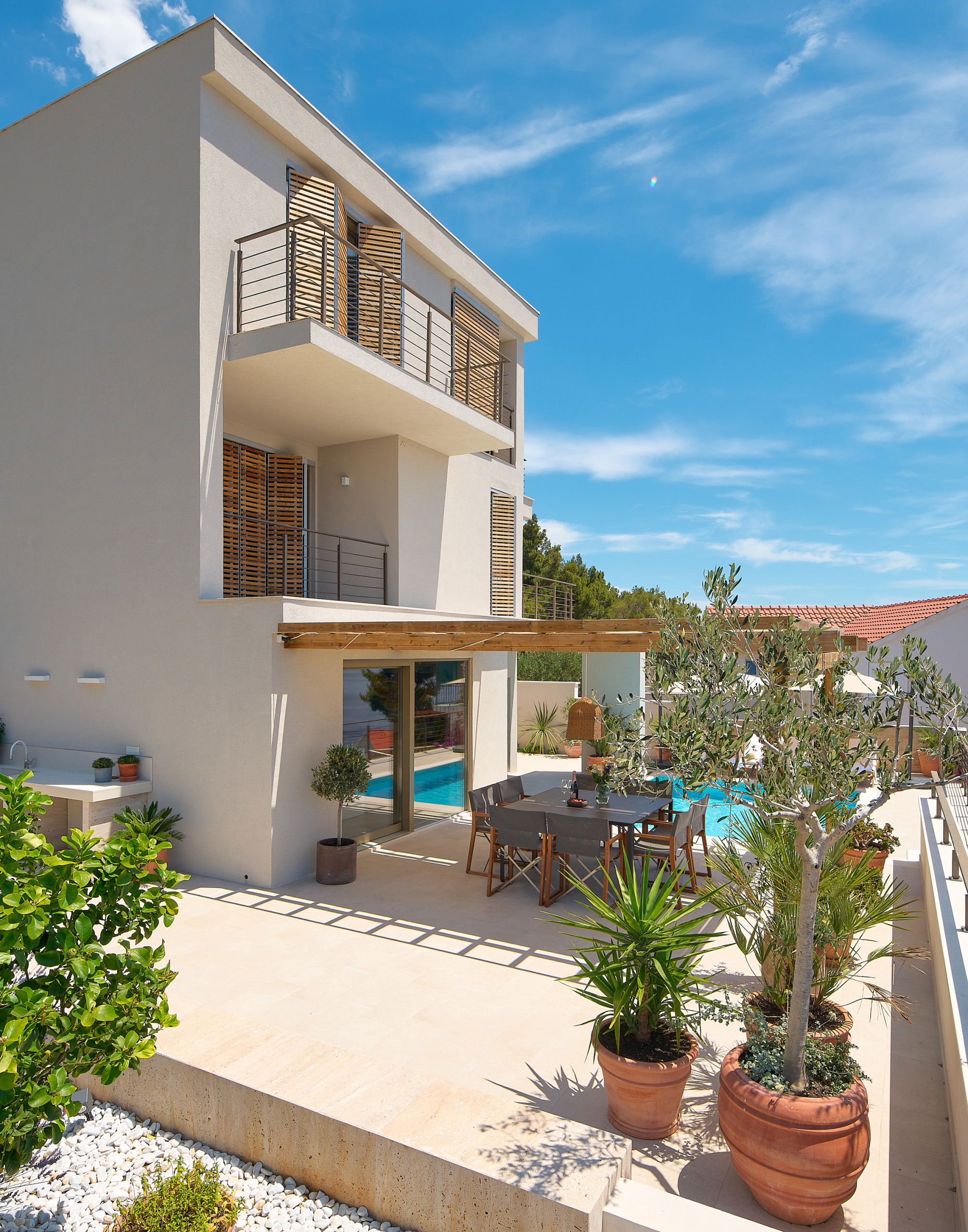 On the floor, there are two bright bedrooms with their own modern bathrooms and balconies, while the second floor features the third bedroom, also with a private bathroom and a beautiful balcony overlooking the pool, terrace, and sea.