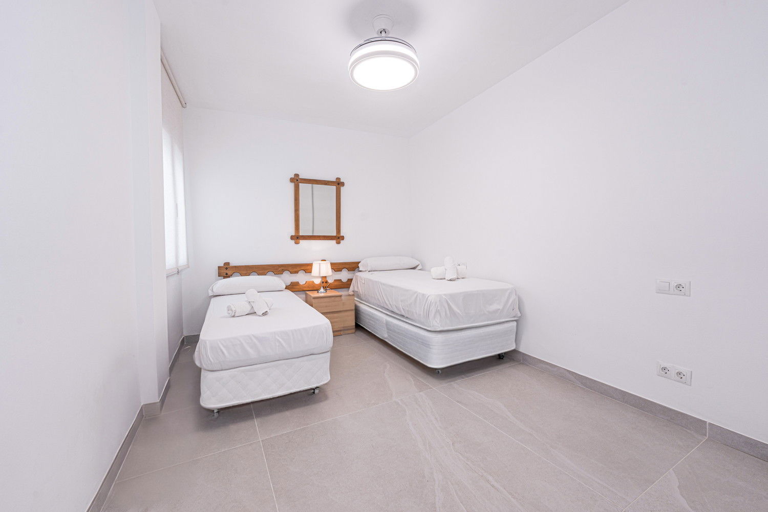 The Property: A spacious home designed for groups or families of up to 6 people. The layout features 3 bedrooms: a master bedroom with a queen-size bed and two additional bedrooms with two single beds each. There are 2 full bathrooms (one accessible from the hallway and one en suite from the master bedroom) and a hallway that stands out for its constant natural light thanks to its integrated skylights.