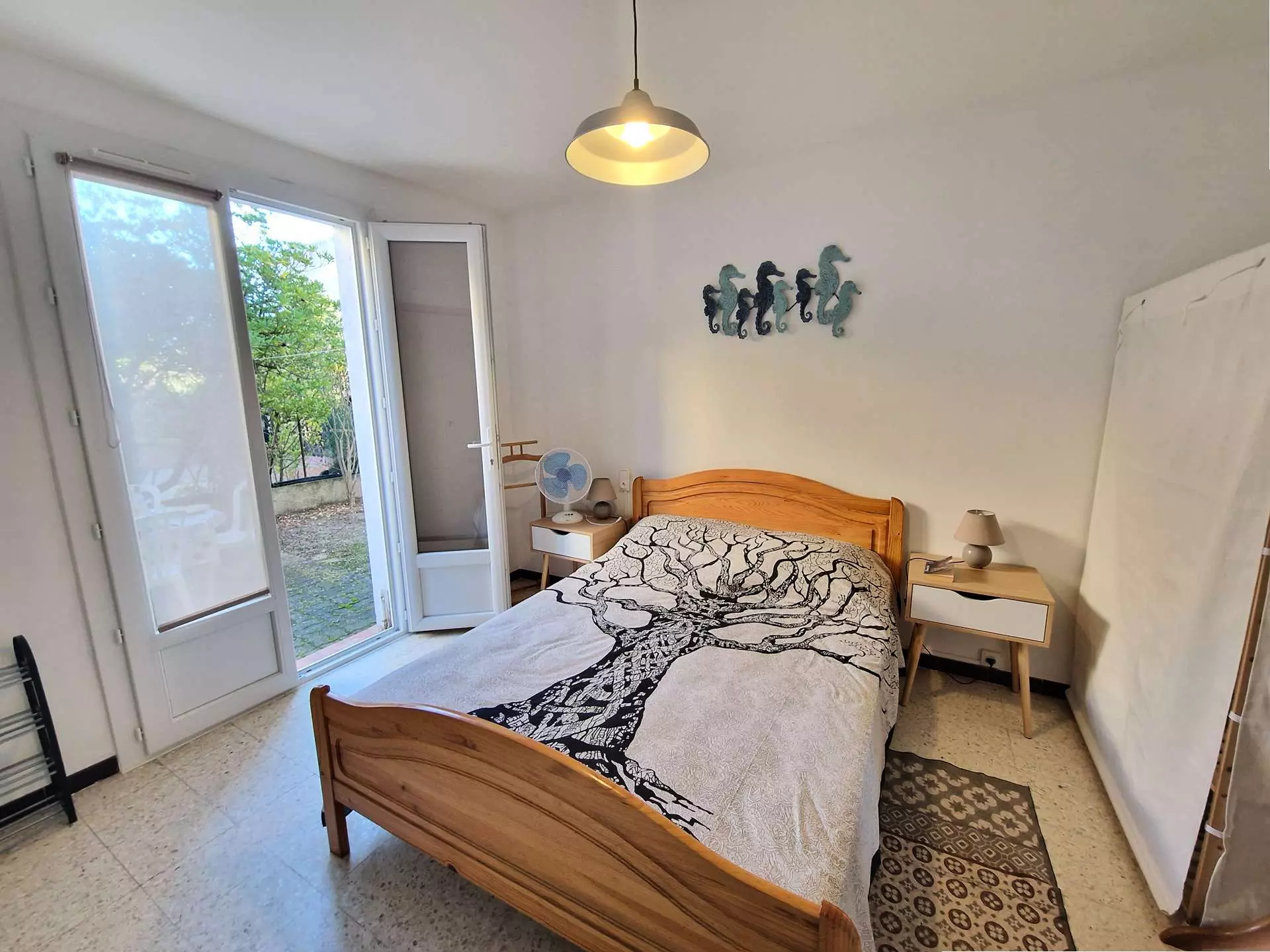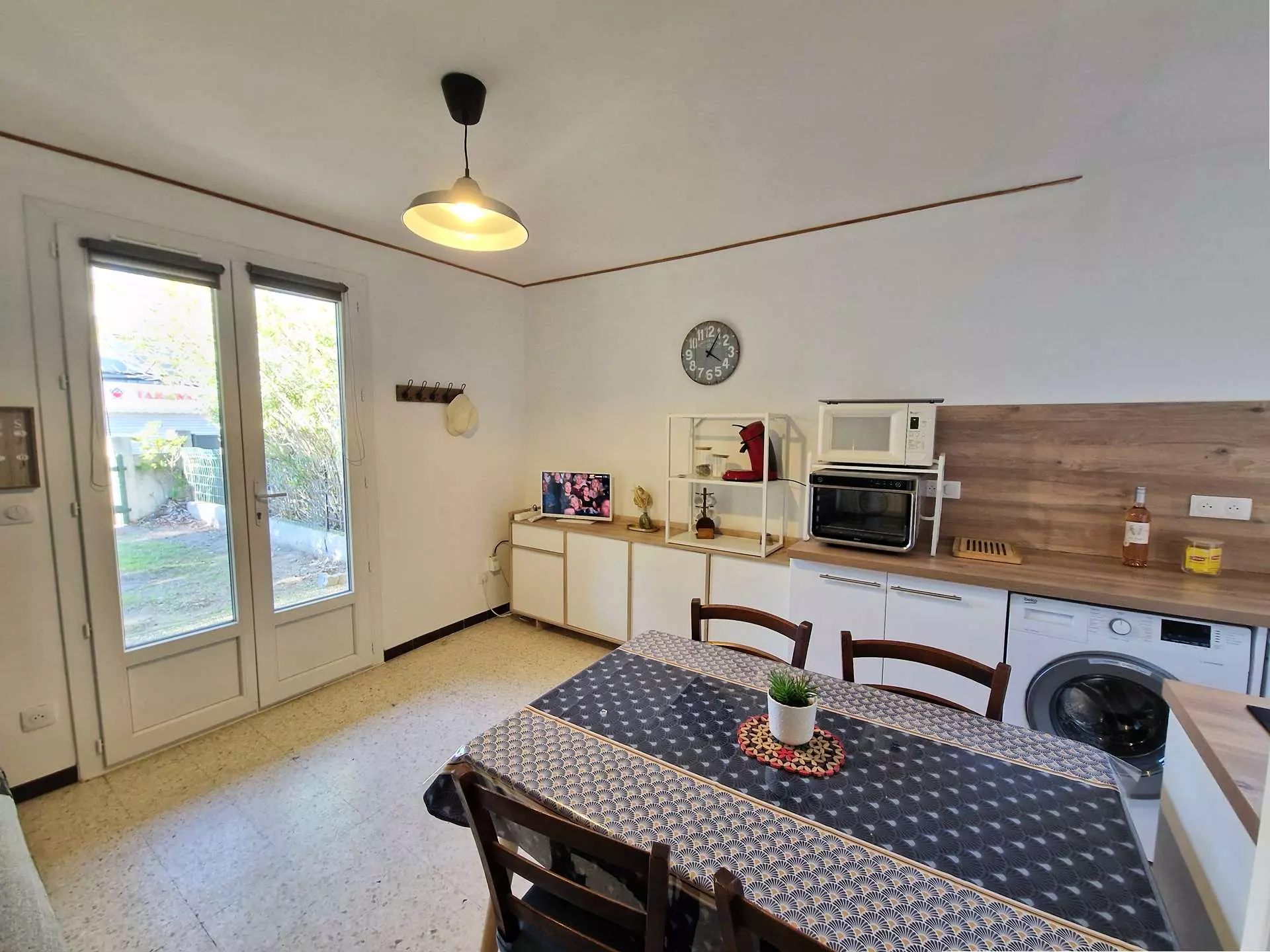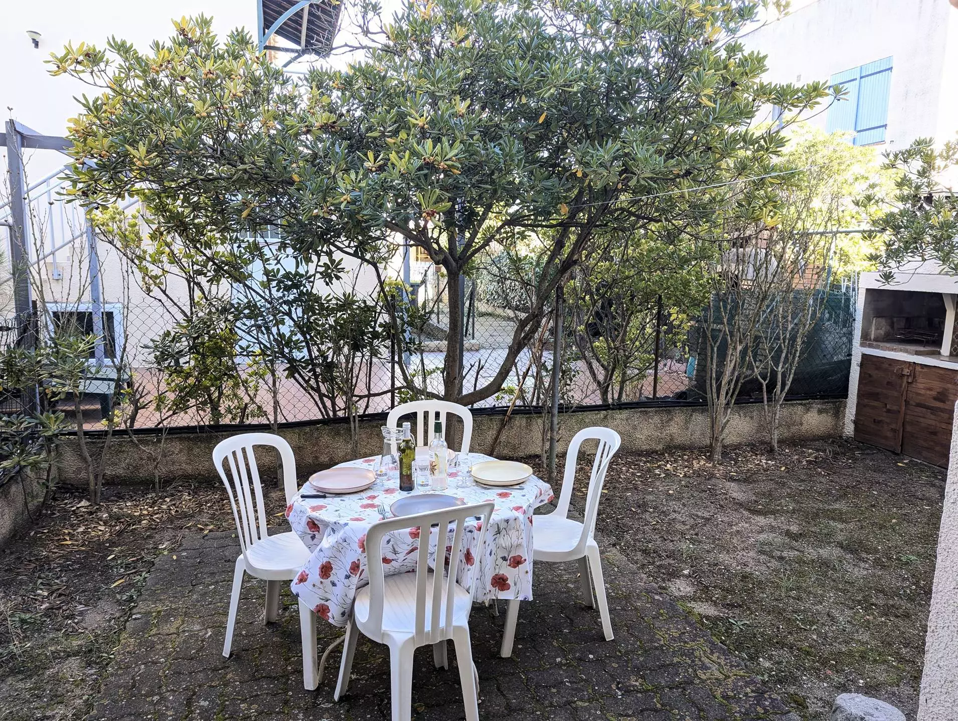 On the sleeping side, you'll find a cabin area with two bunk beds, a bedroom with a double bed, and storage space. This bedroom has French doors opening directly onto the back terrace, perfect for enjoying sunny days. The terrace is equipped with a barbecue for al fresco dining.