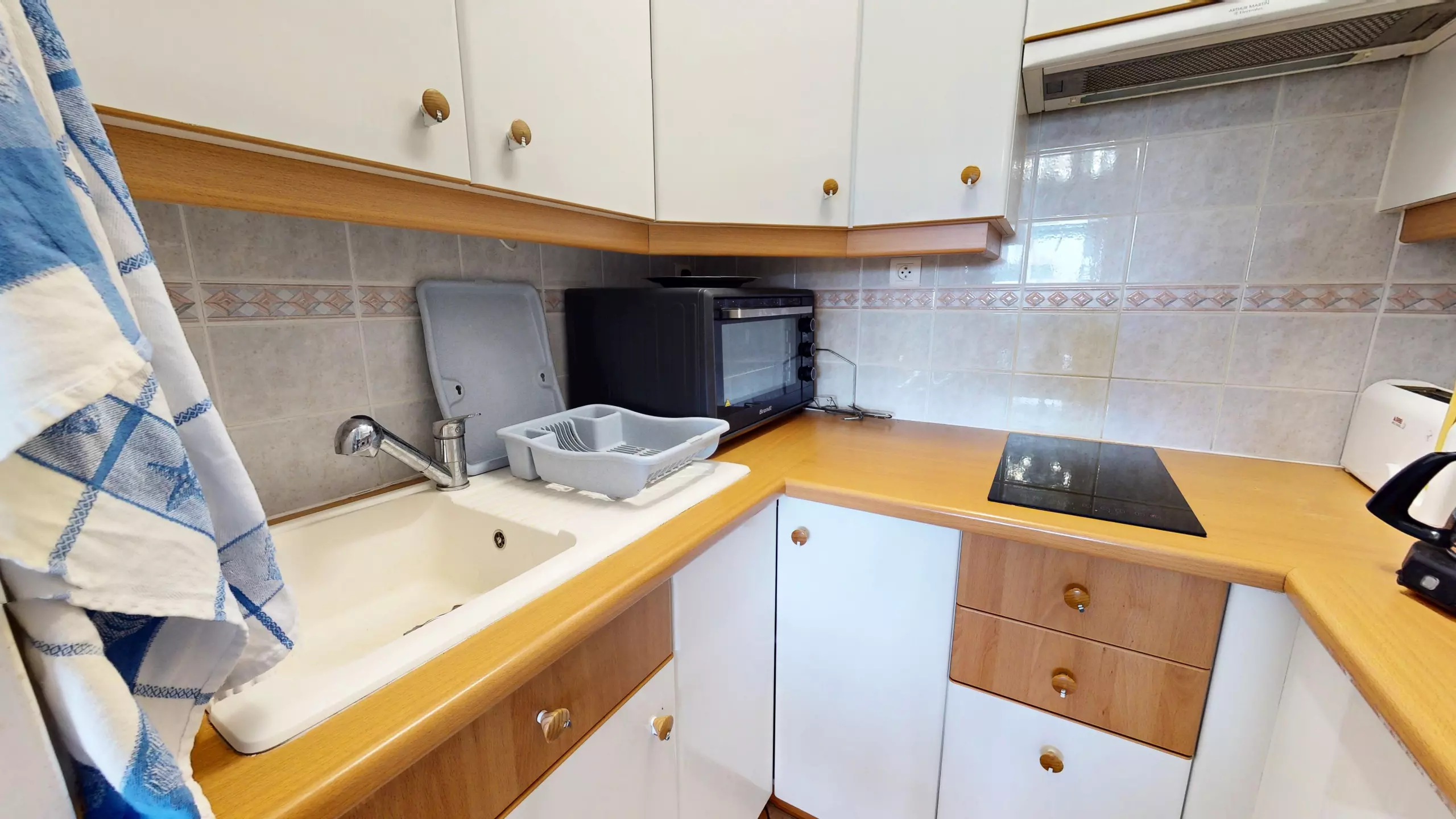 It consists of a cozy living room with a double sofa bed (140 x 190) and television, perfect for relaxing after a busy day.