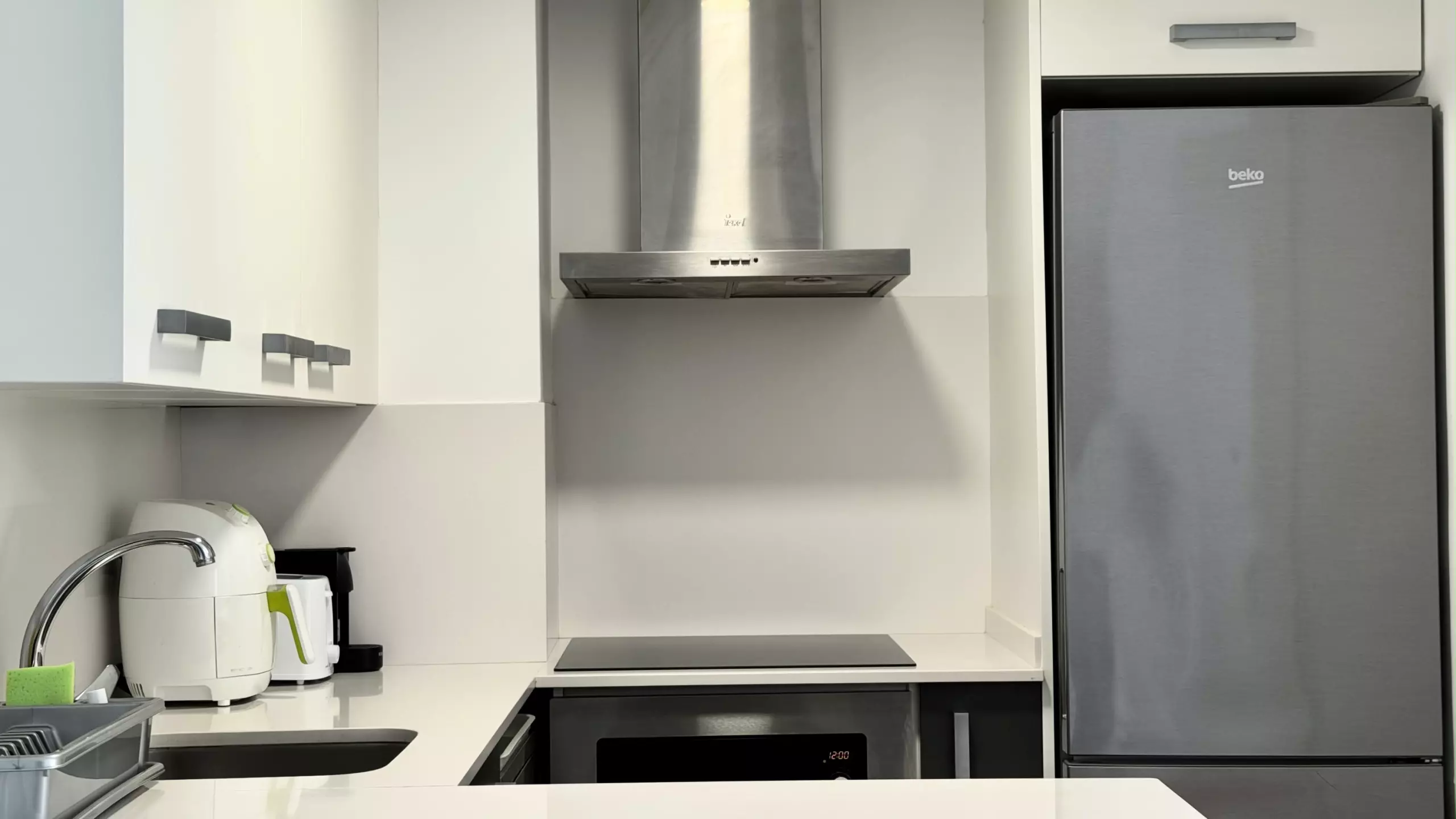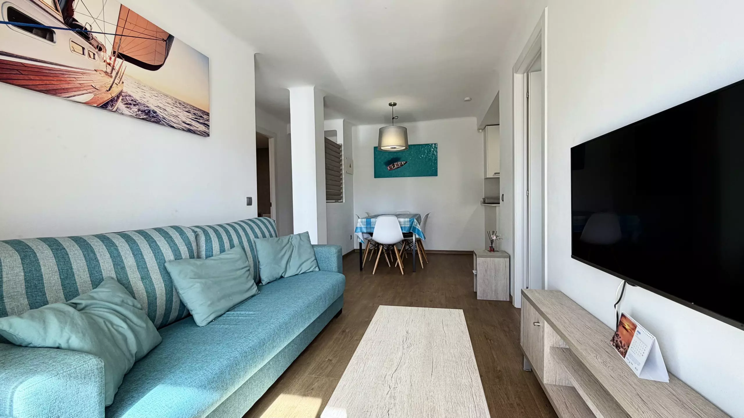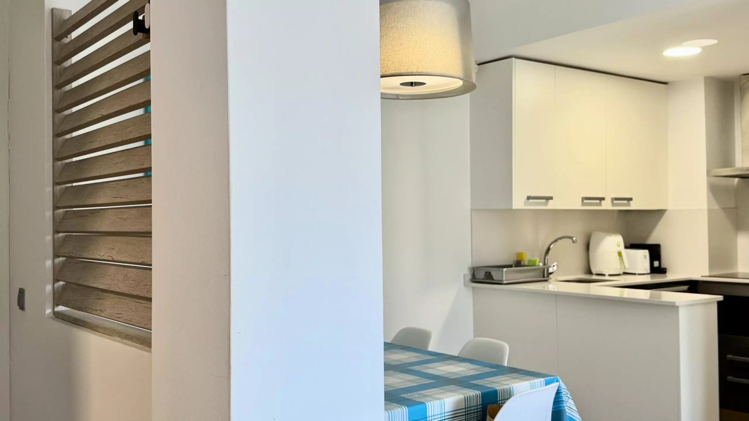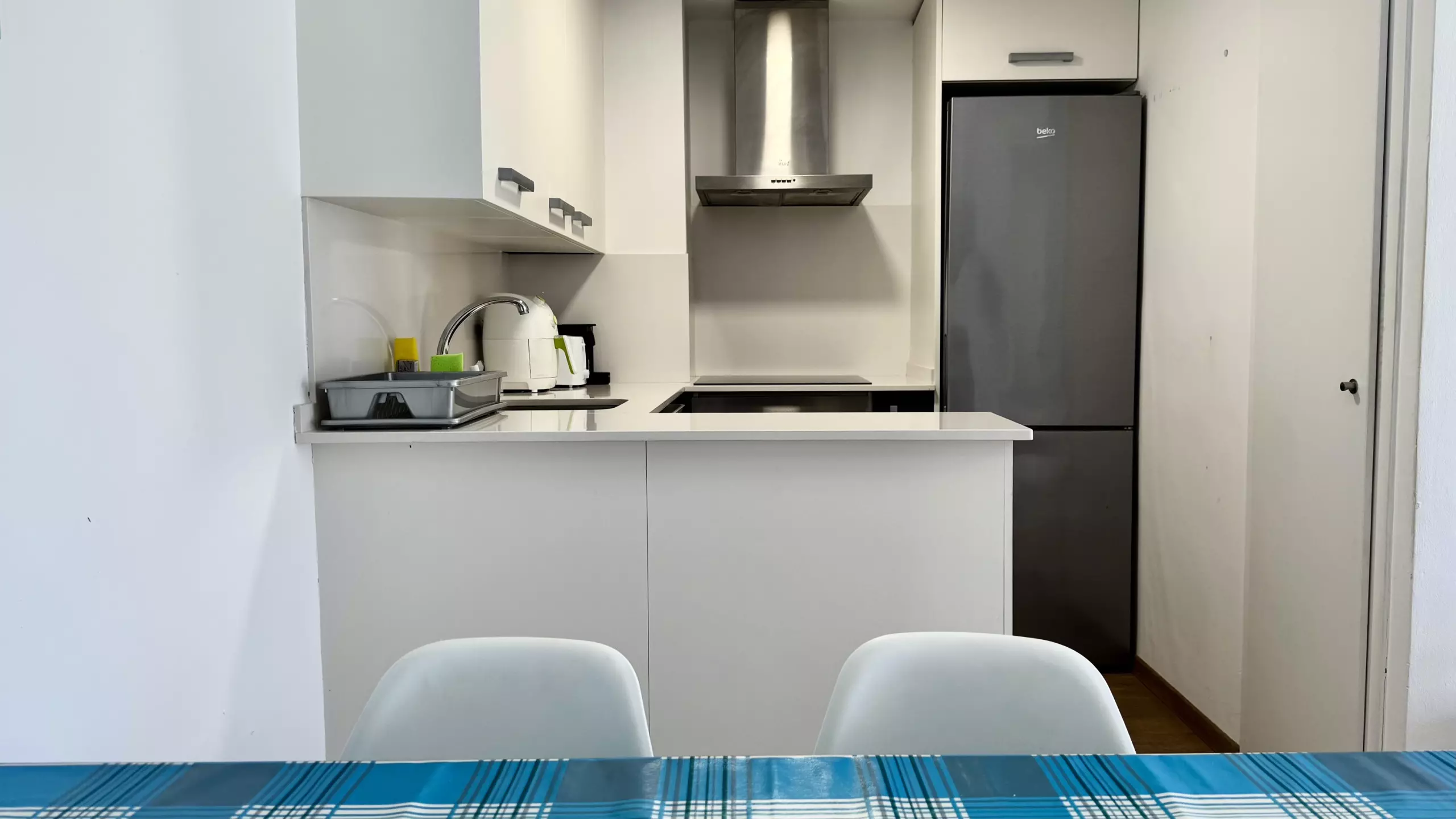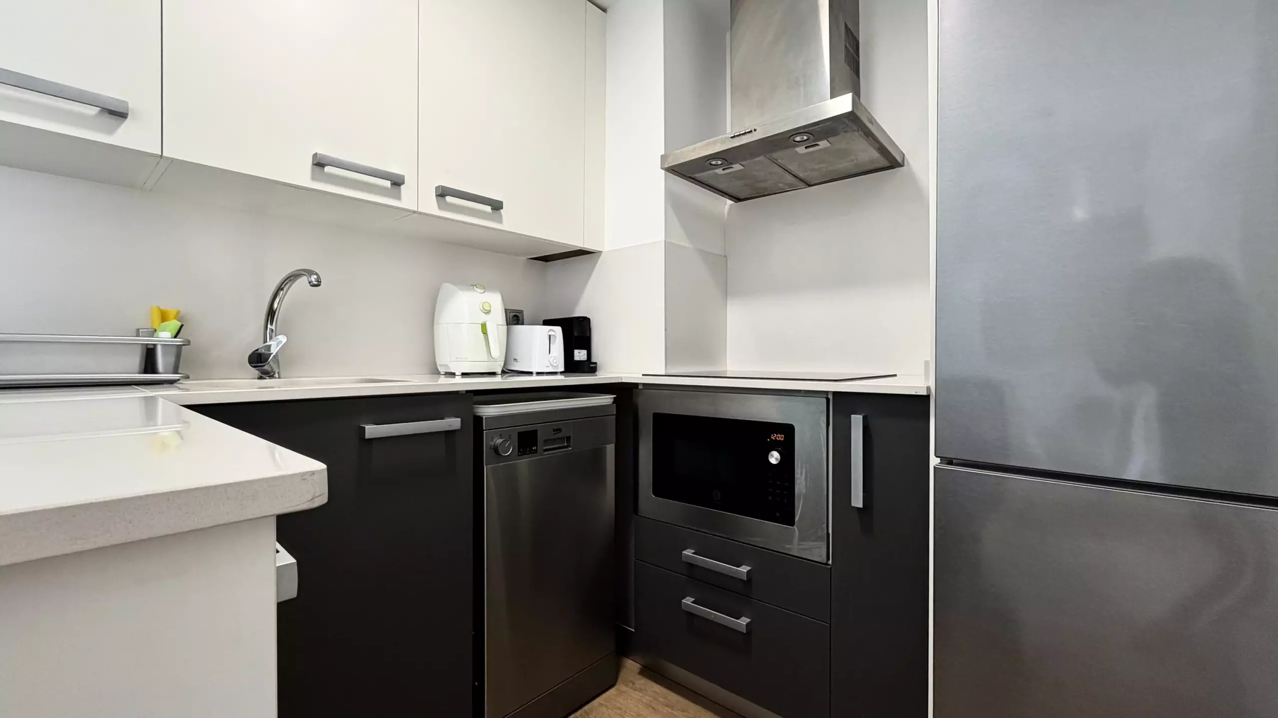 The apartment features a fully equipped open-plan kitchen, ideal for preparing family meals. It includes modern appliances such as a refrigerator, freezer, washing machine, dishwasher, oven, deep fryer, toaster, and coffee maker. The kitchen area is designed to facilitate meal preparation and provide a space for sharing time together.