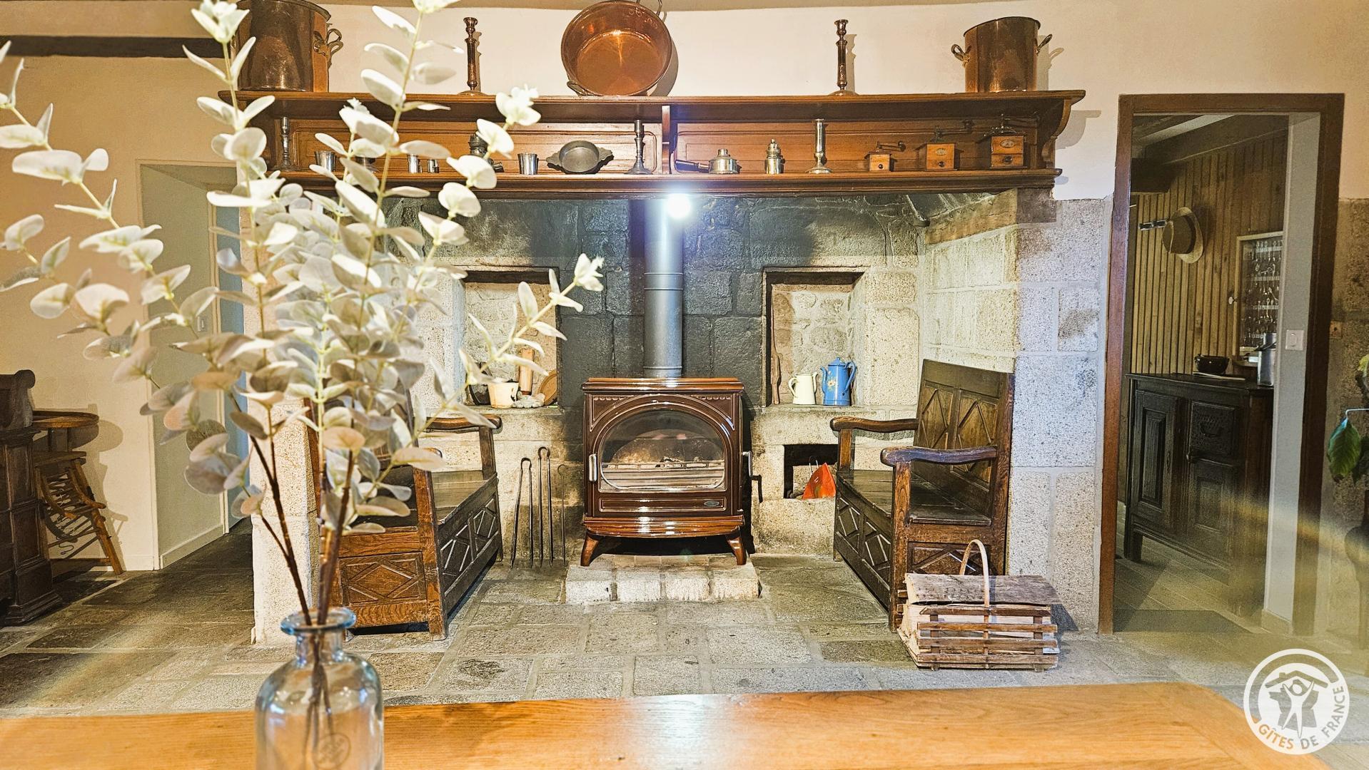 A warm living room with a wood-burning stove, a table with benches and a lounge area equipped with armchairs, a sofa and a television.
