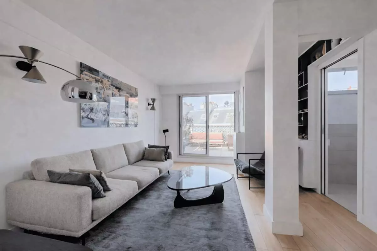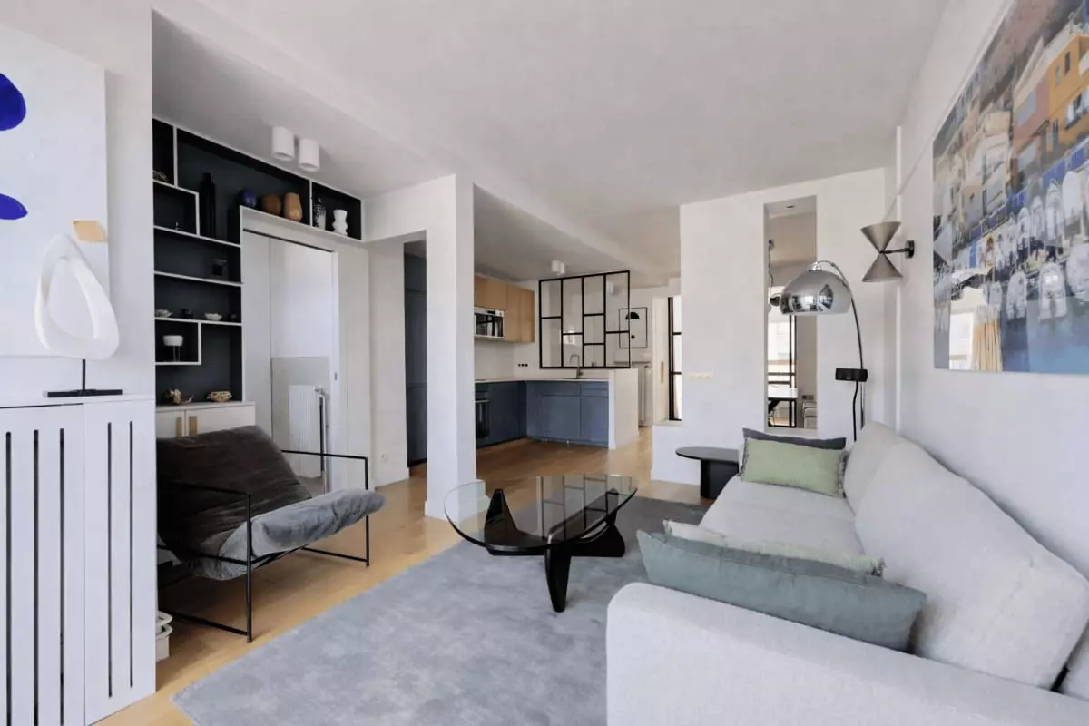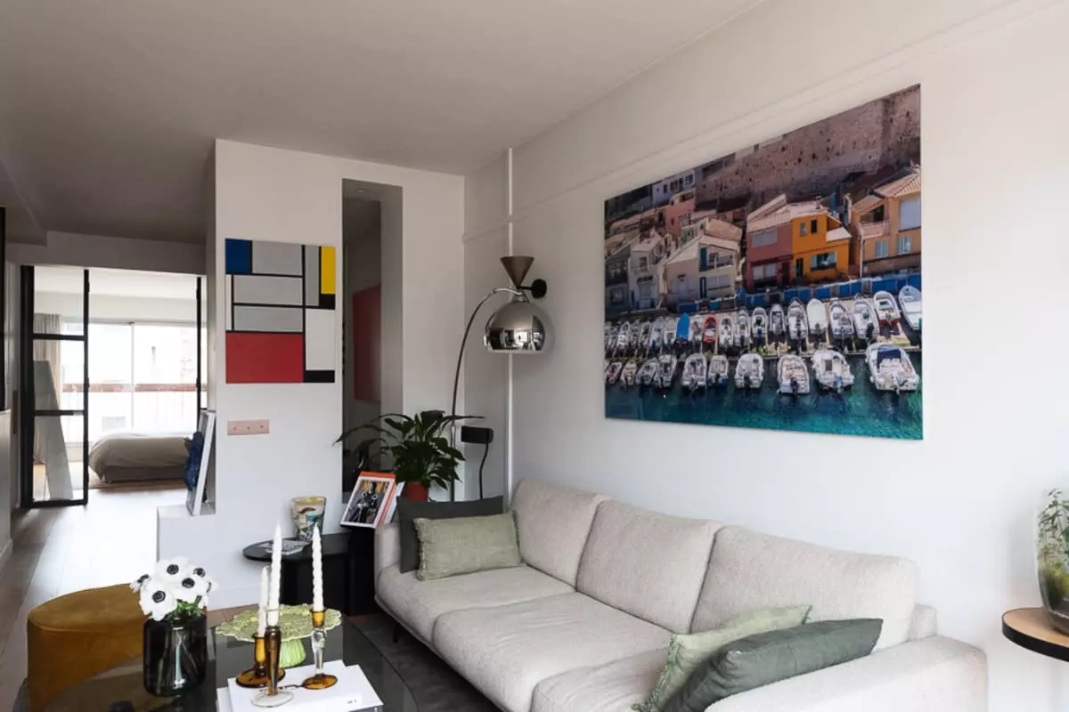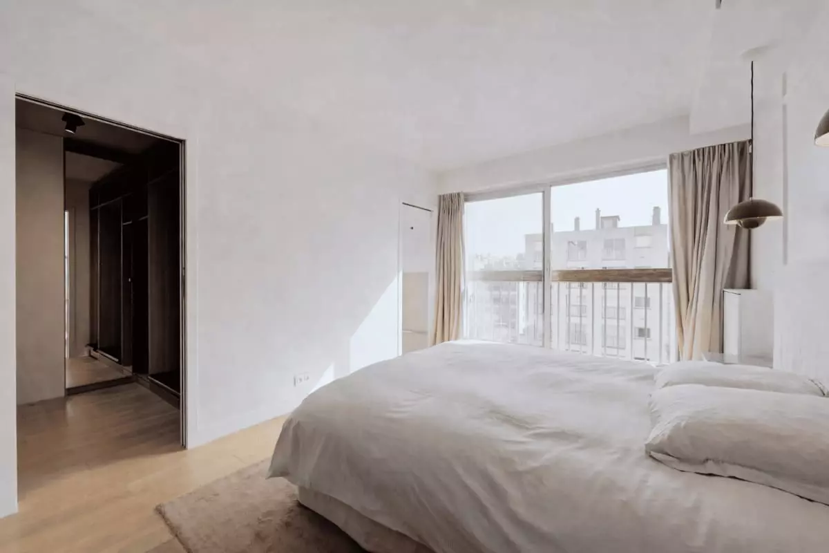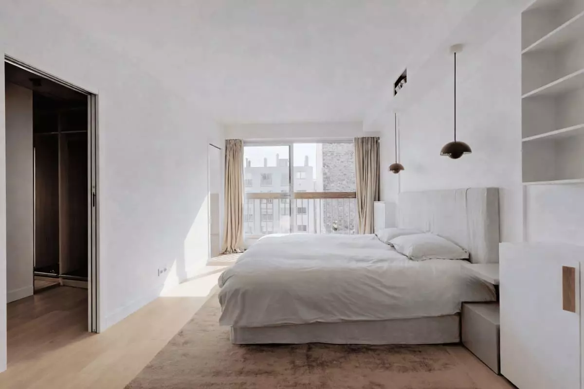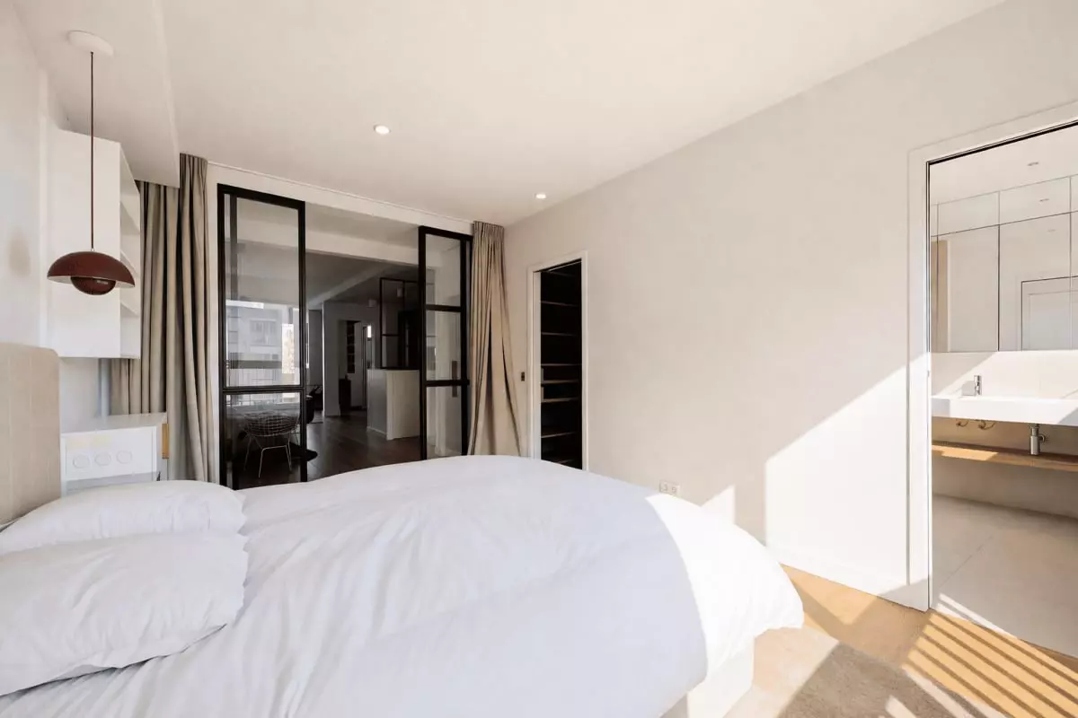 This apartment offers a bright and airy atmosphere, with floor-to-ceiling windows that flood the space with natural light.