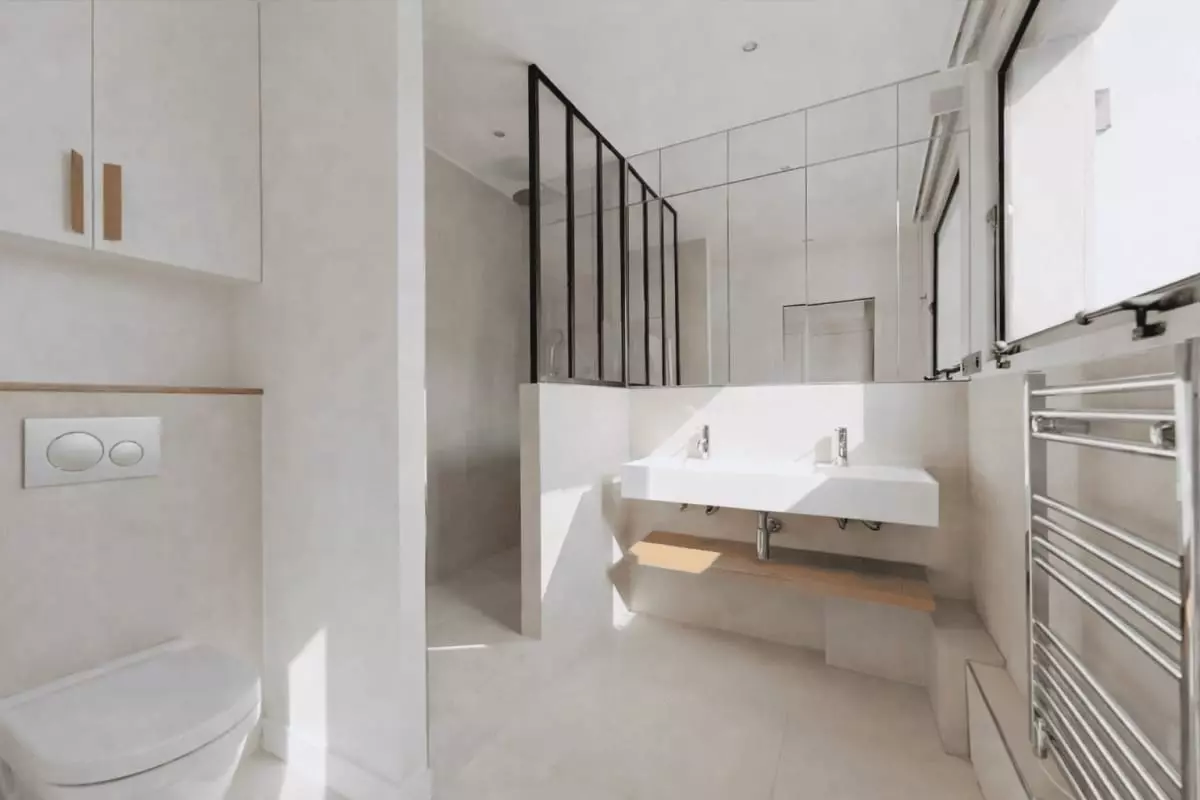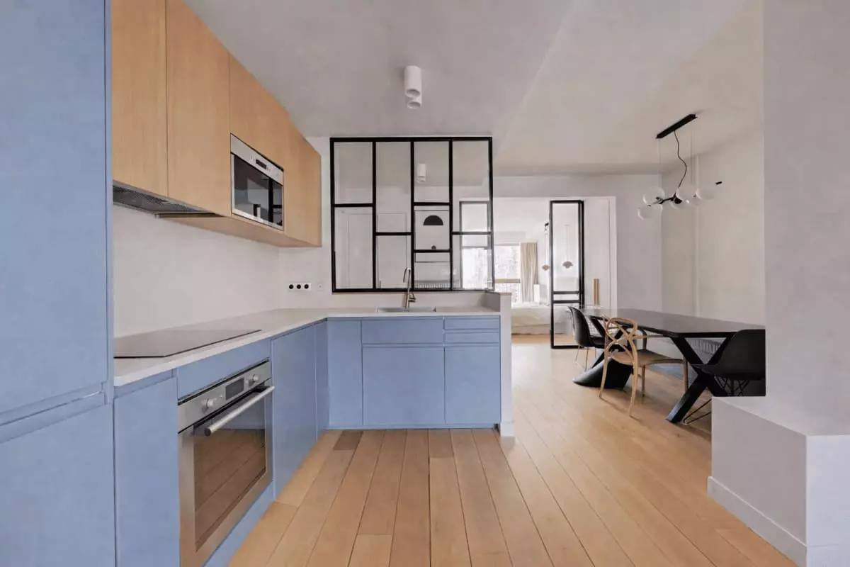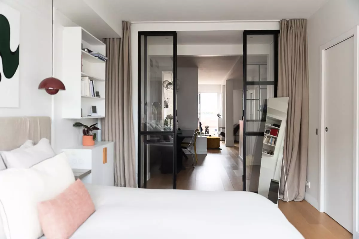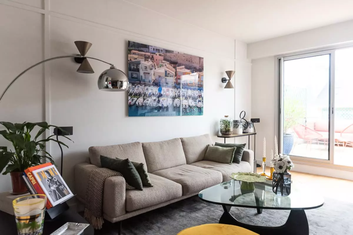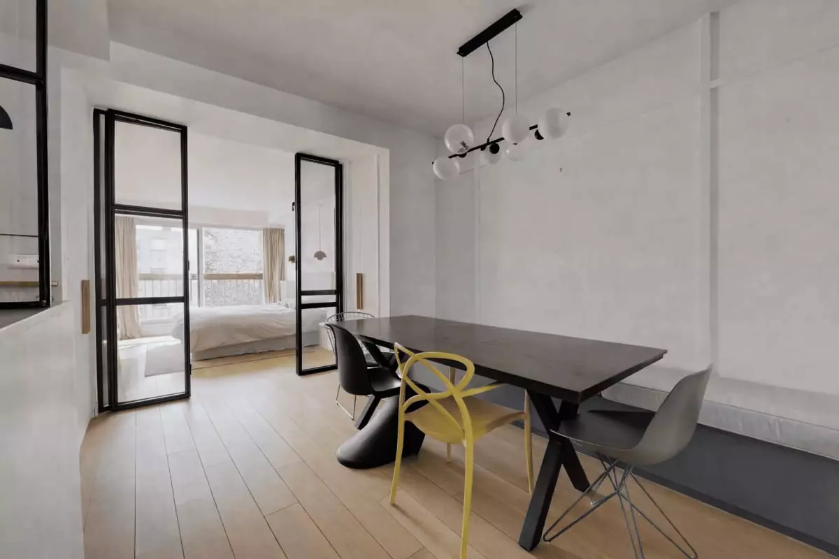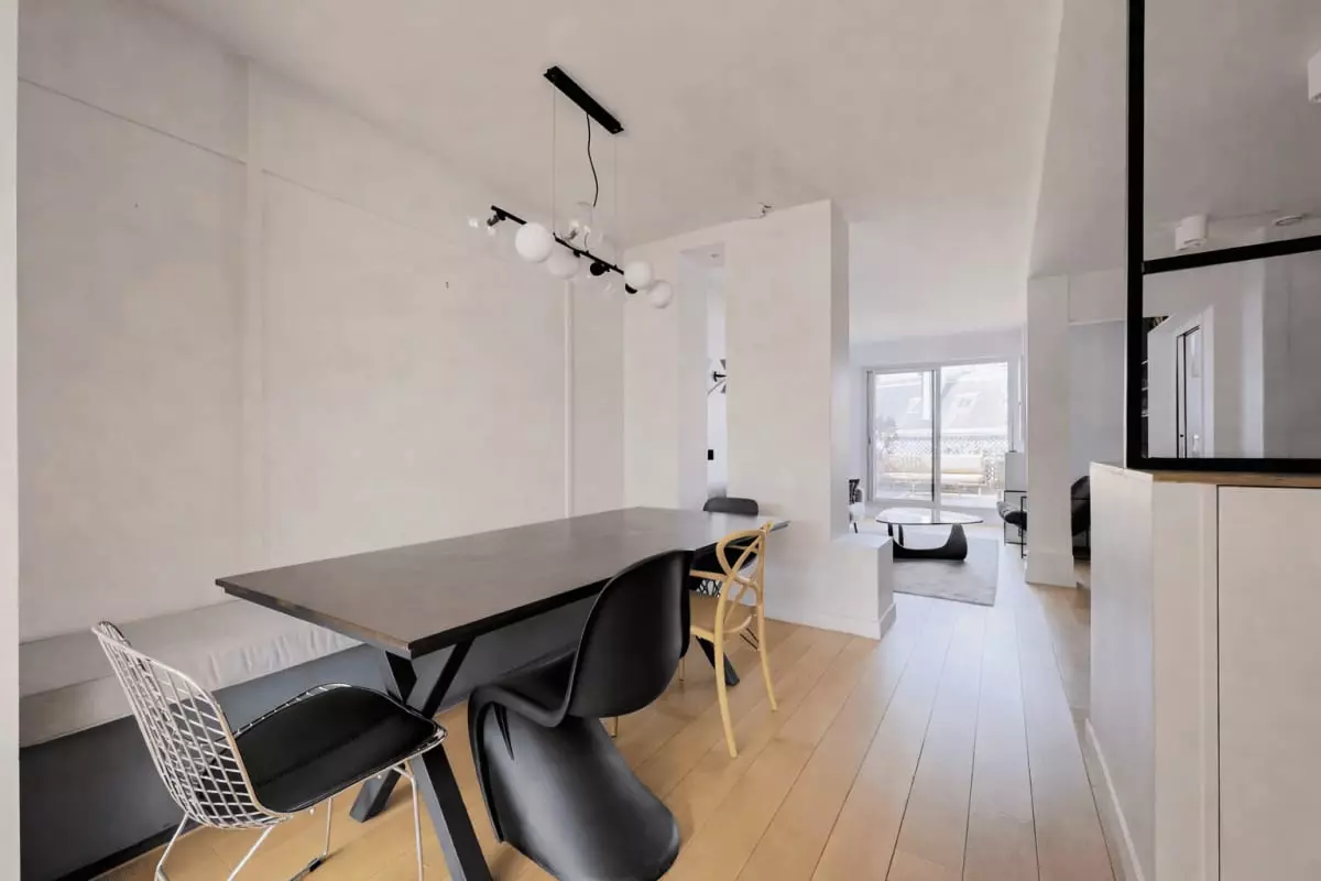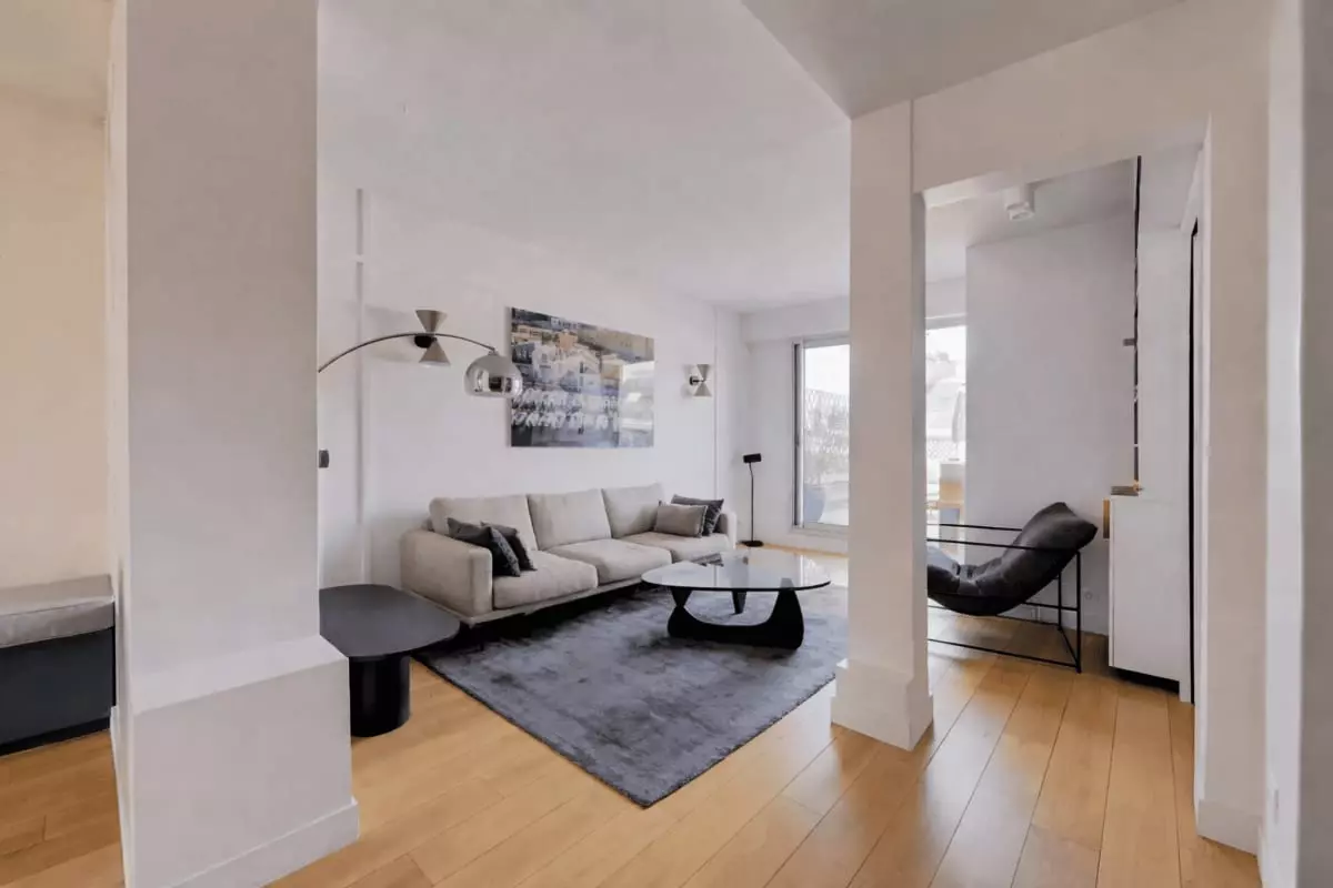 This apartment offers a bright and airy atmosphere, with floor-to-ceiling windows that flood the space with natural light.