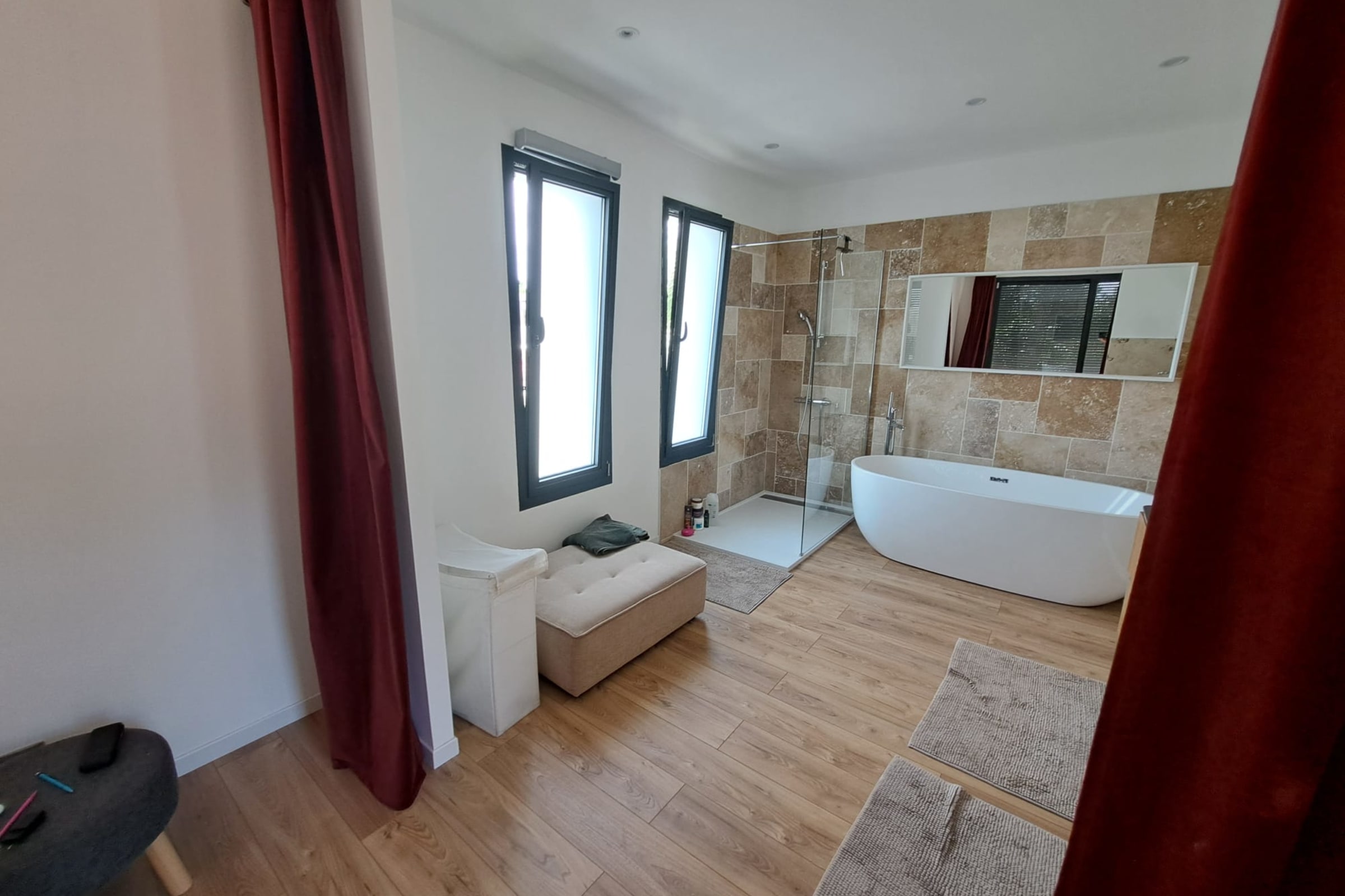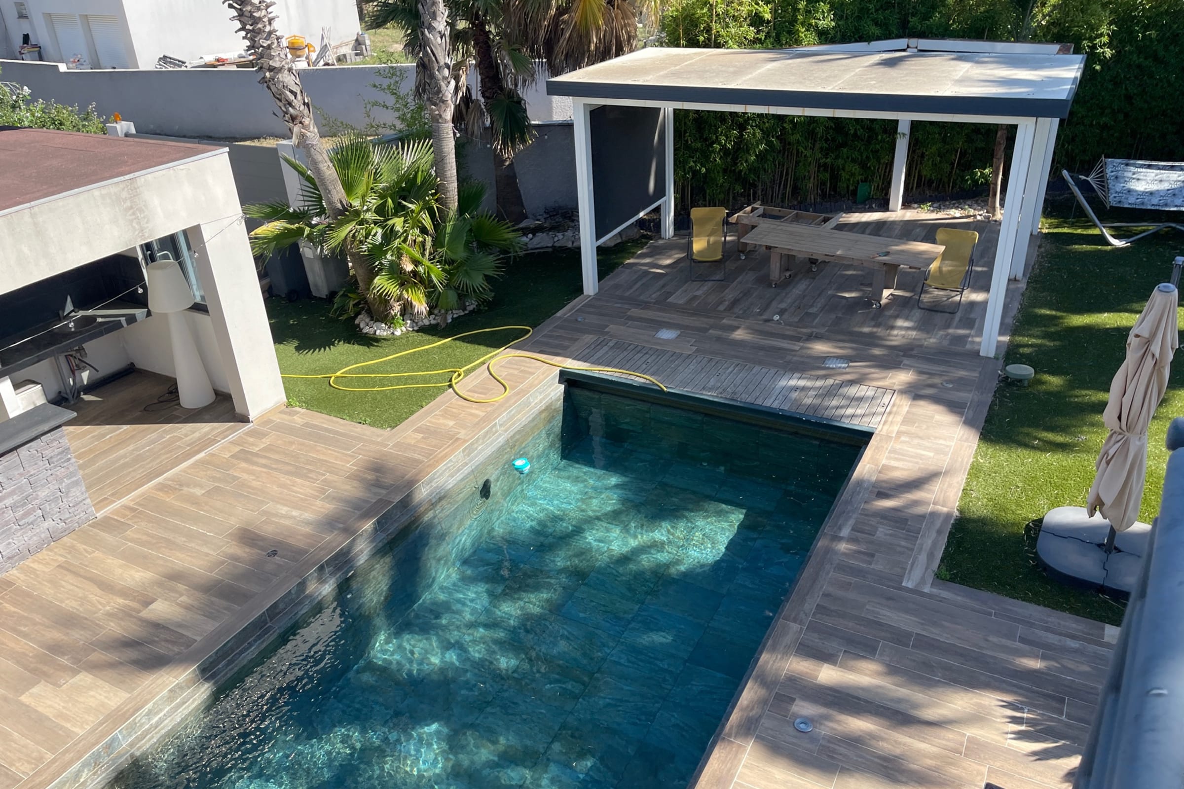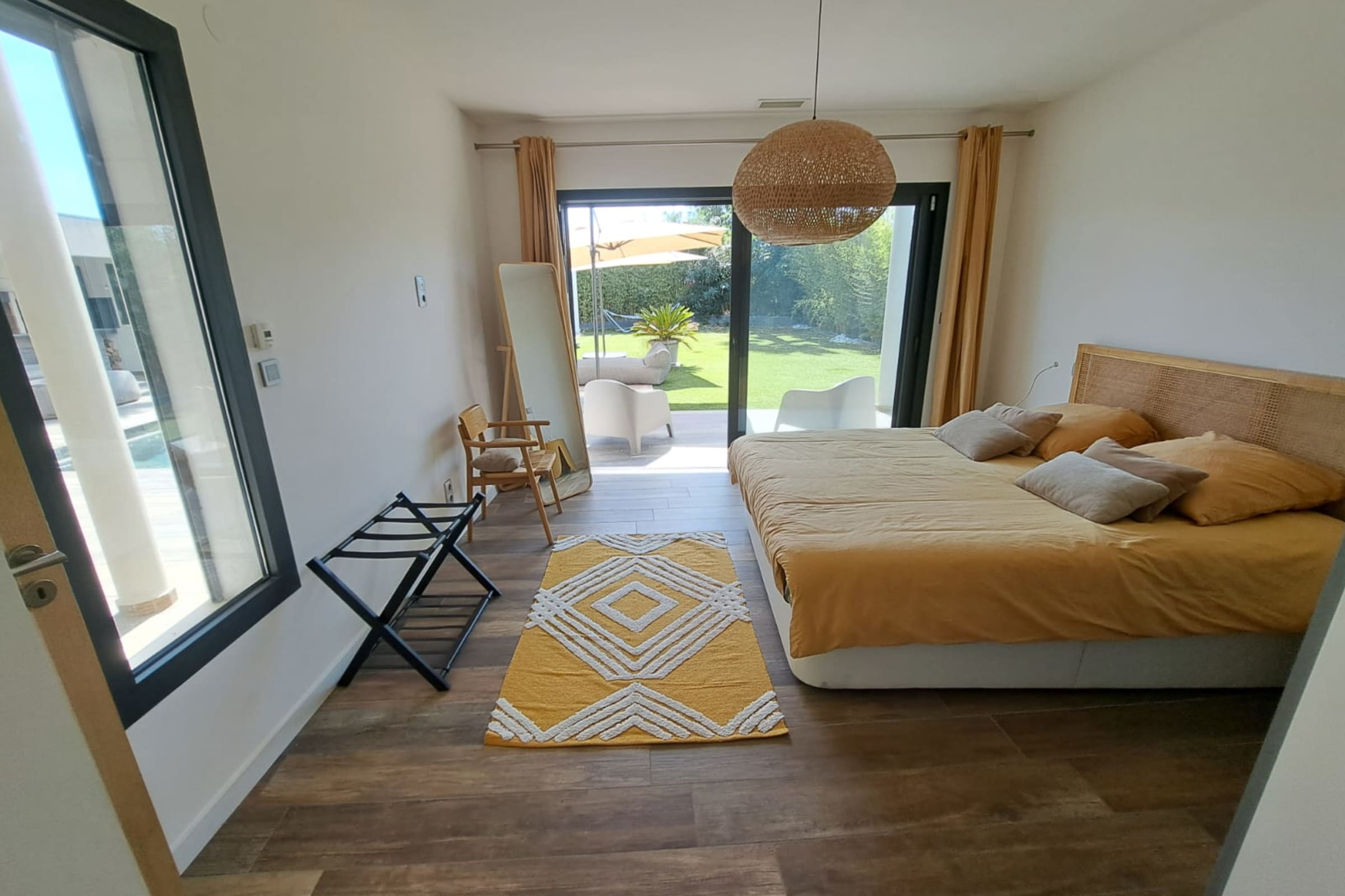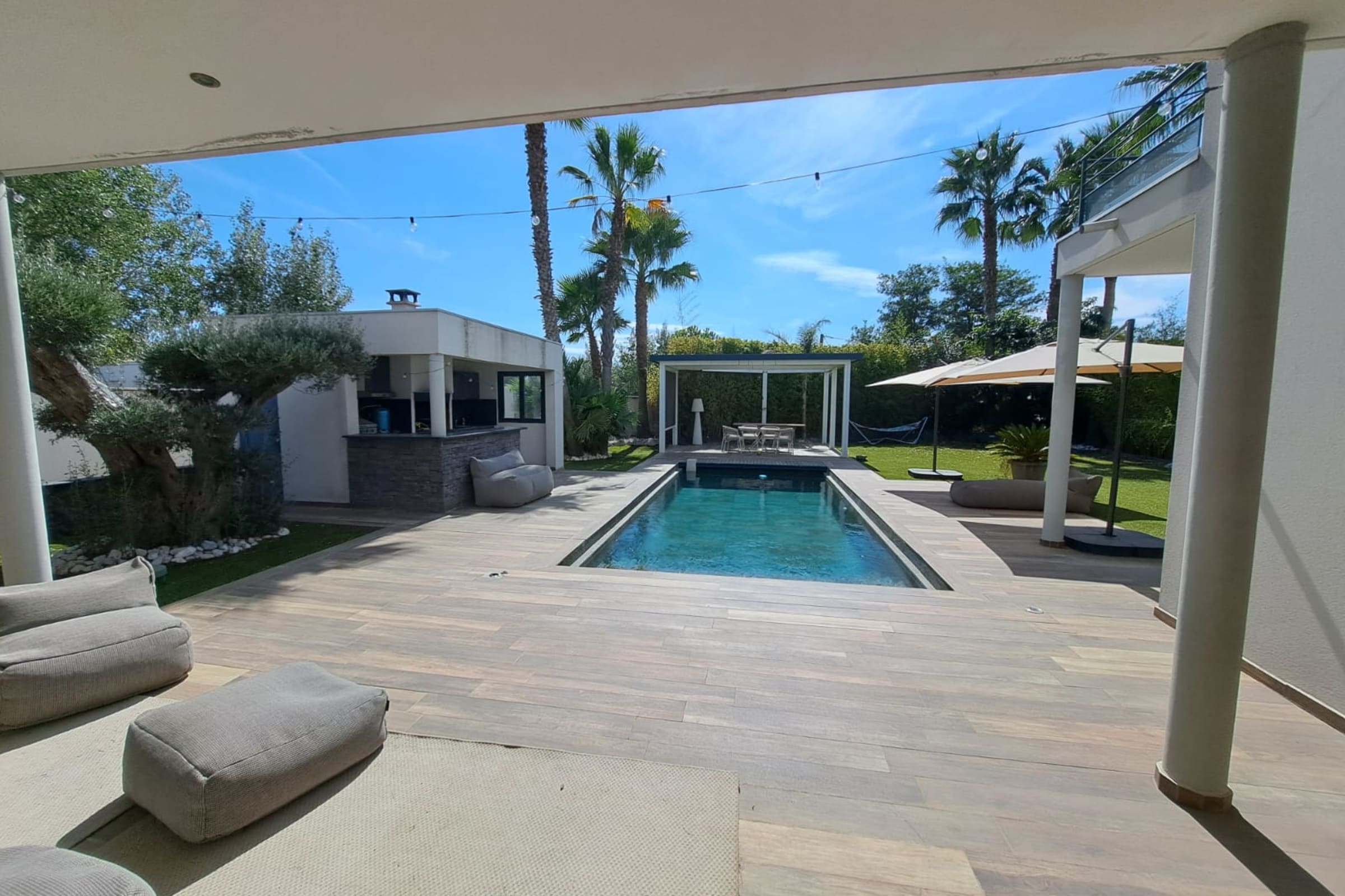 Outside, the villa reveals its true art of living: an 11 x 4 m Bali stone pool, 1.5 m deep, surrounded by sun loungers and extended by a stylish pool house with summer bar. Perfect for alternating swims, aperitifs and dinners under the stars in a chic, relaxed atmosphere.