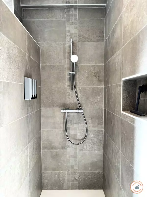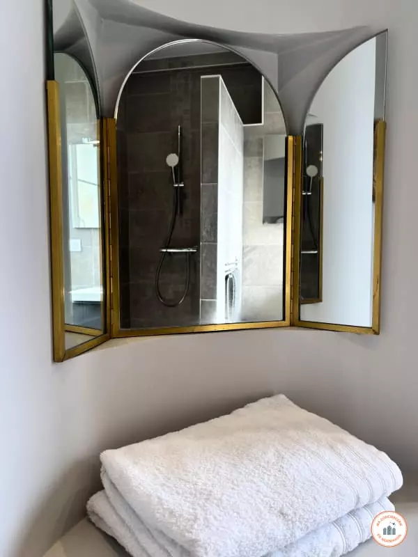 - A modern bathroom, including a large walk-in shower, a toilet and a dressing area with stool and mirror;