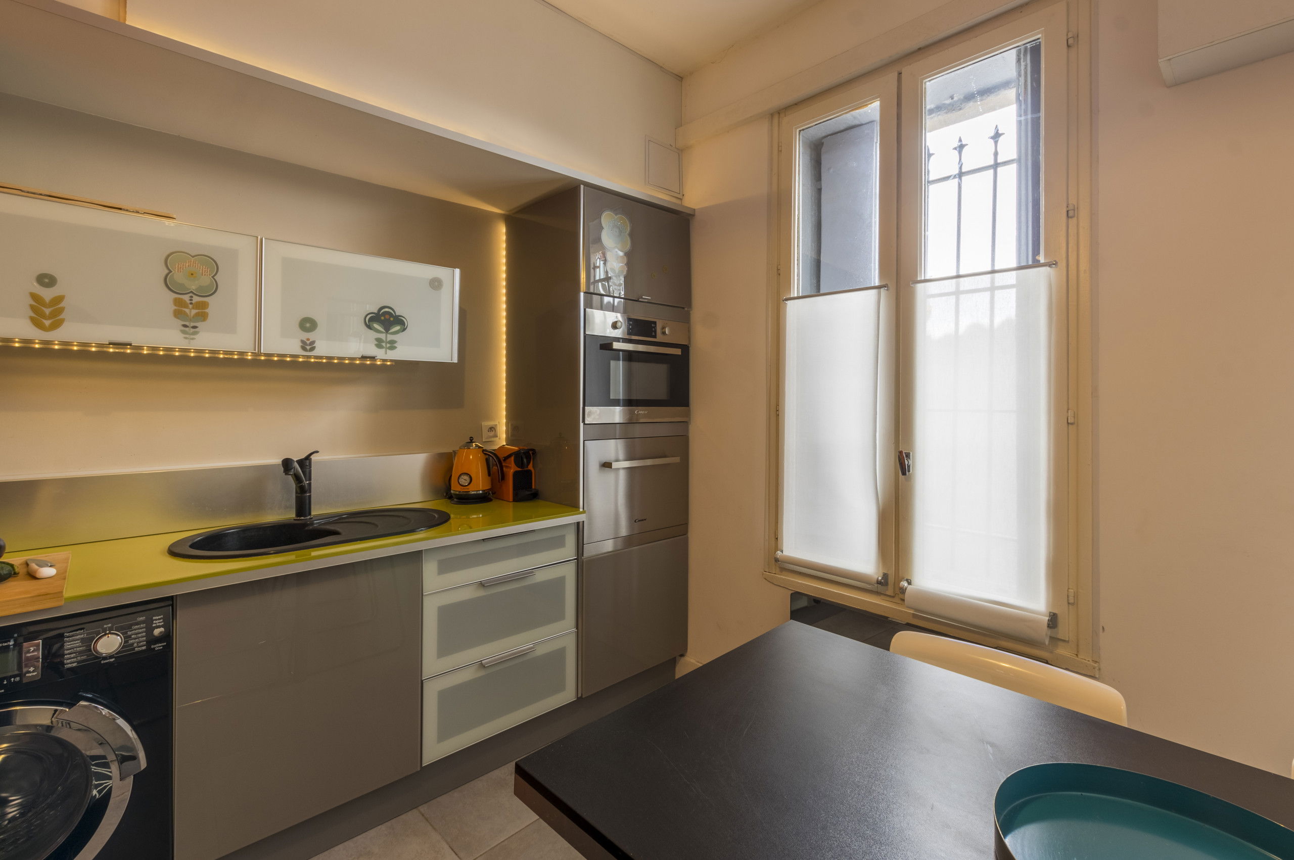 The apartment features a fully equipped kitchen and a cozy living room with a TV. Both the living room and the bedroom open onto a quiet terrace through French windows, allowing plenty of natural light into the space.