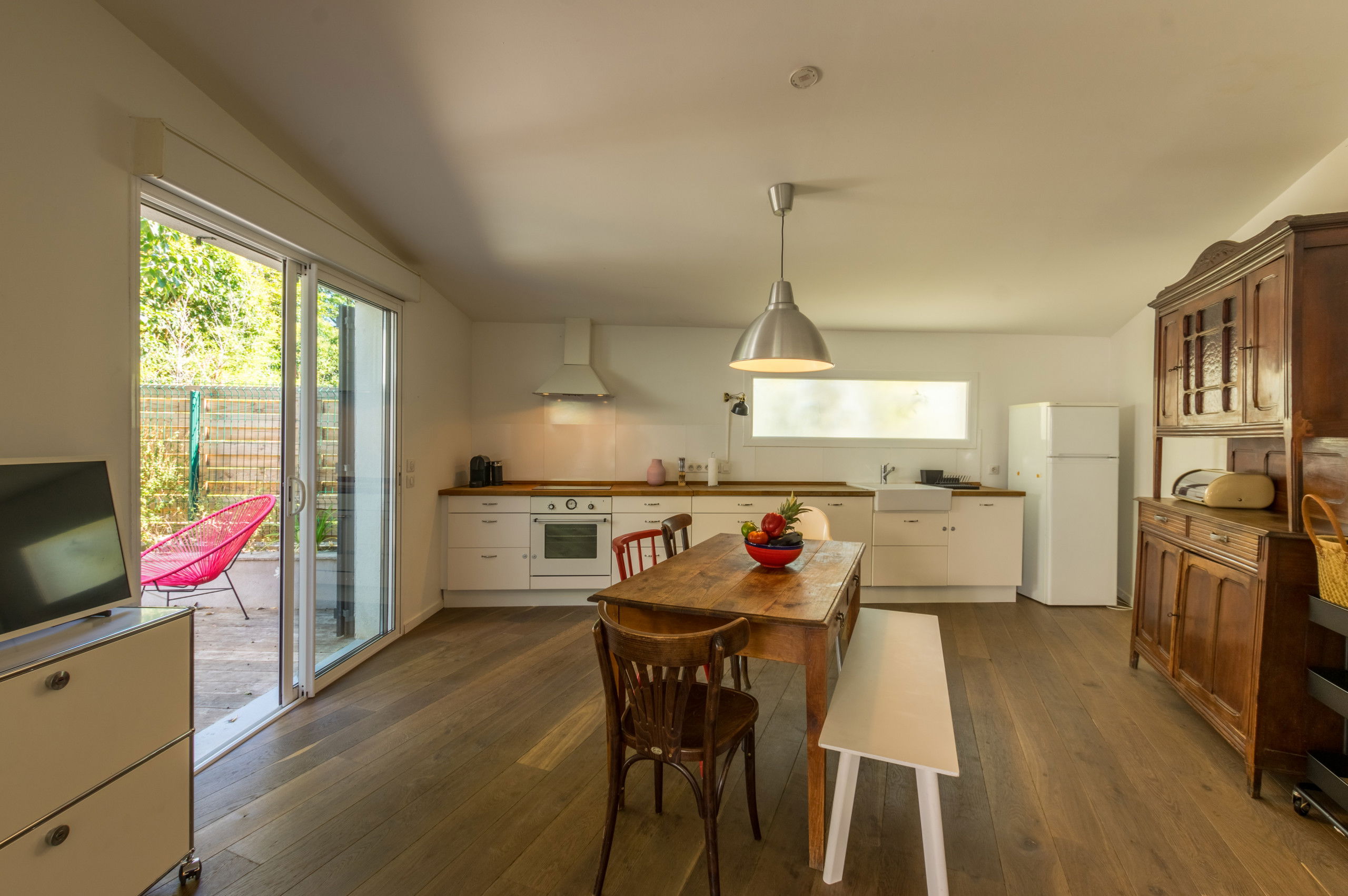 The open plan kitchen, of hotplate of glass ceramics, is equipped with refrigerator, microwave, oven, freezer, dishwasher, dishes/cutlery, kitchen utensils, coffee machine and kettle.