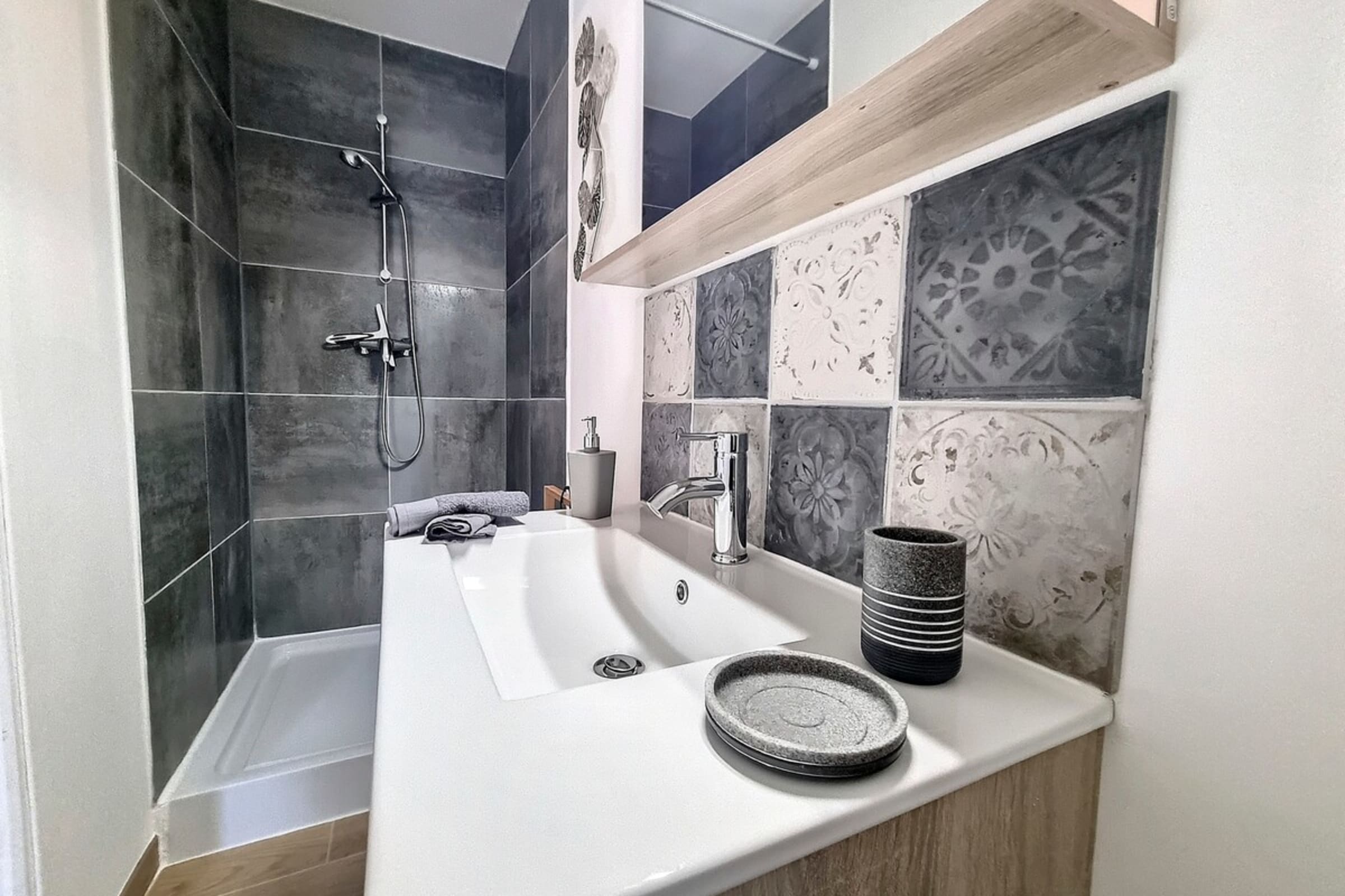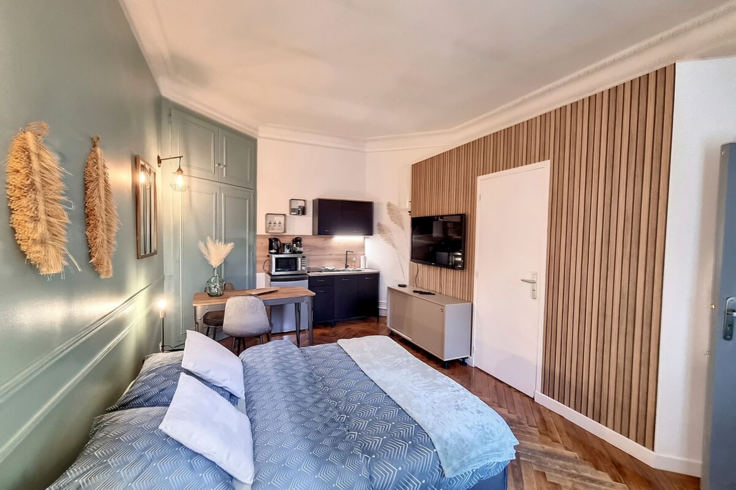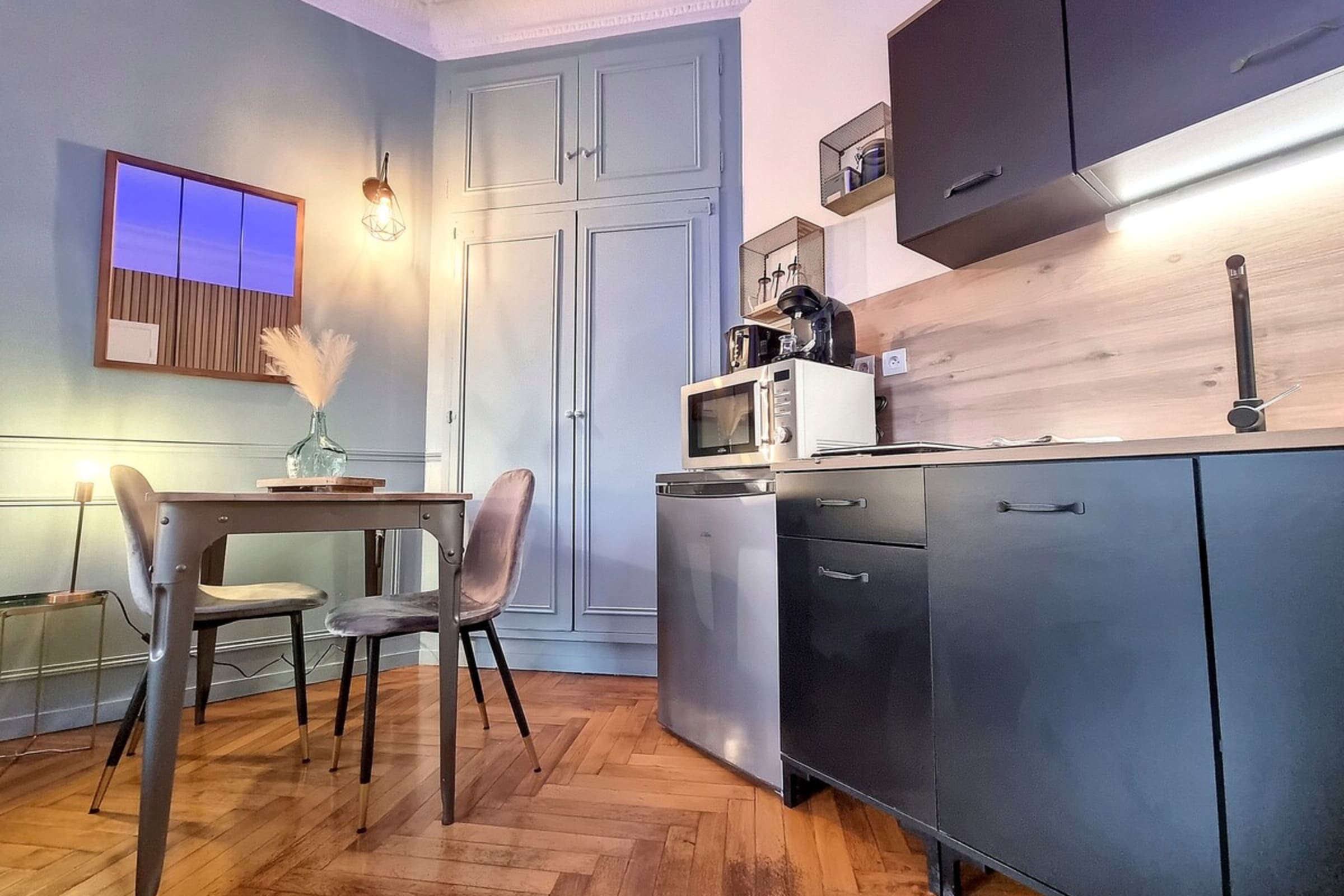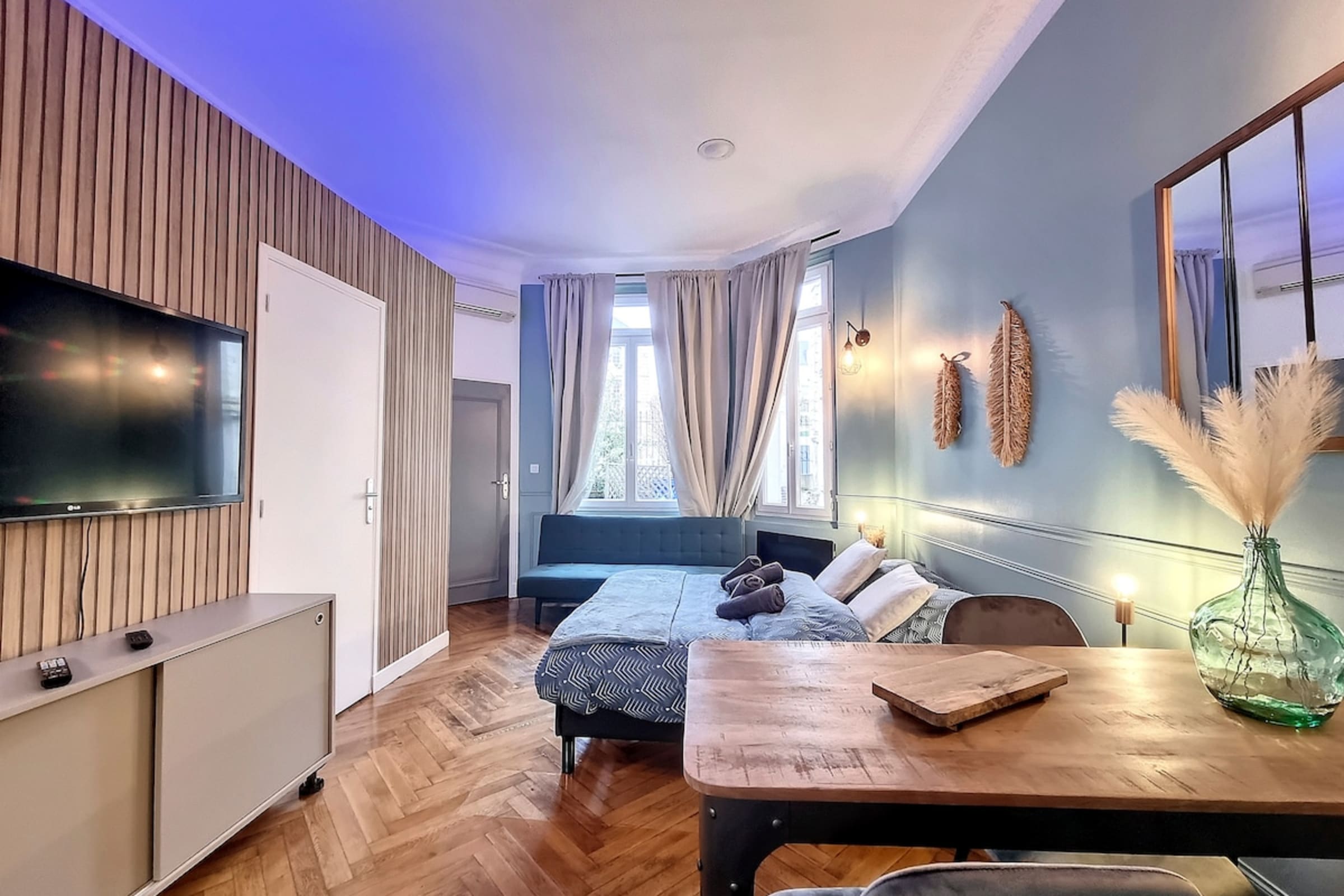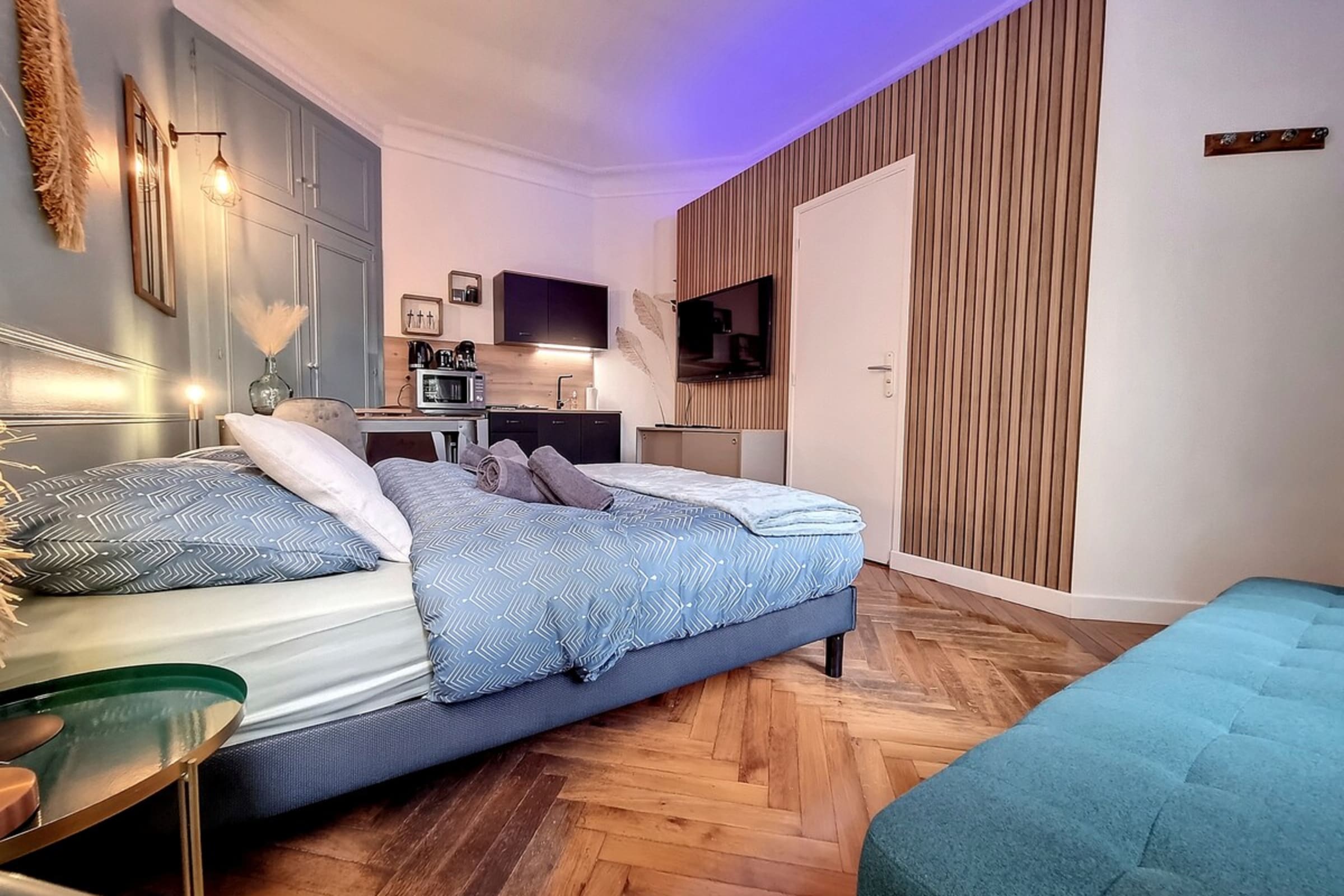 As soon as you enter, you will discover an elegant apartment with modern and tasteful décor, designed for a comfortable stay, whether for a weekend of discovery, a business trip or a few days with your loved one. The living room invites you to relax, with a cosy lounge area, ideal for unwinding after a day in the city.