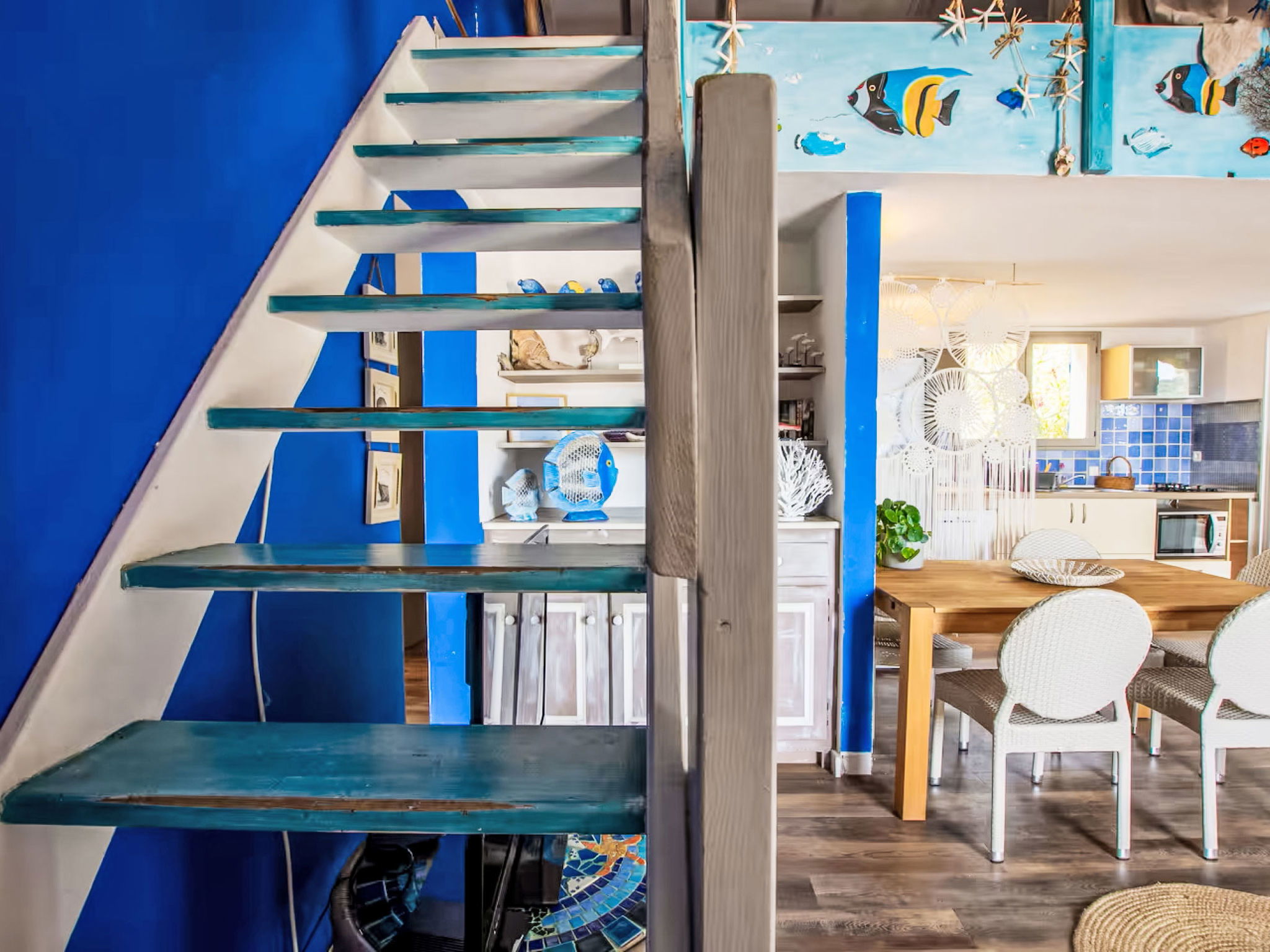"Casa Blue", 7-room villa 130 m2 on 2 levels. Comfortable furnishings: living/dining room with dining table and TV (flat screen). Exit to the terrace. 1 room with 1 french bed (180 cm, length 200 cm). 1 room with 1 french bed (160 cm, length 200 cm). Open kitchen (oven, dishwasher, 2 induction hot plates, 2 gas rings, toaster, kettle, microwave, electric coffee machine). Shower, shower/WC, sep. WC. Electric heating. On the lower ground floor: (exterior staircase) living/dining room with dining table and TV (flat screen). Exit to the terrace. 2 rooms, each room with 1 french bed (140 cm, length 200 cm), shower/WC. Exit to the terrace. Open kitchen (mini-oven, oven, dishwasher, 4 gas rings, toaster, kettle, microwave, electric coffee machine). No heating option. Upper floor: gallery with sloping ceilings with 1 bed (90 cm, length 200 cm), 1 french bed (160 cm, length 200 cm). Sep. WC. Air-conditioning. 2 terraces partly covered. Terrace furniture, barbecue. Very beautiful view of the sea and the countryside. Facilities: washing machine, iron, baby cot, hair dryer. Internet (WiFi, free). Parking at the house. Please note: non-smokers only. Maximum 1 pet/ dog allowed. Smoke alarm. No internal connecting door between the floors. Offer by a private individual according to Art. 155, IV of CGI.