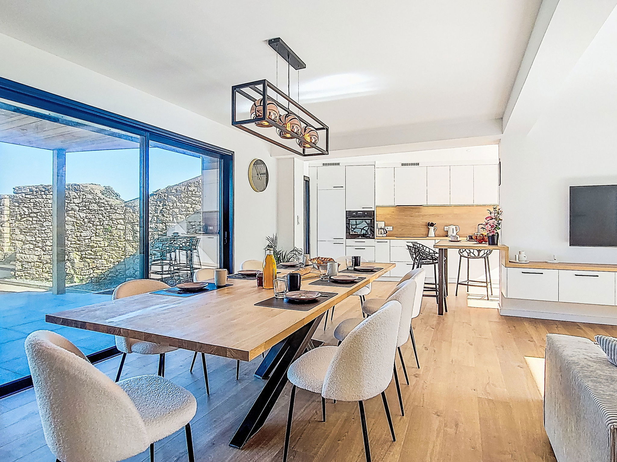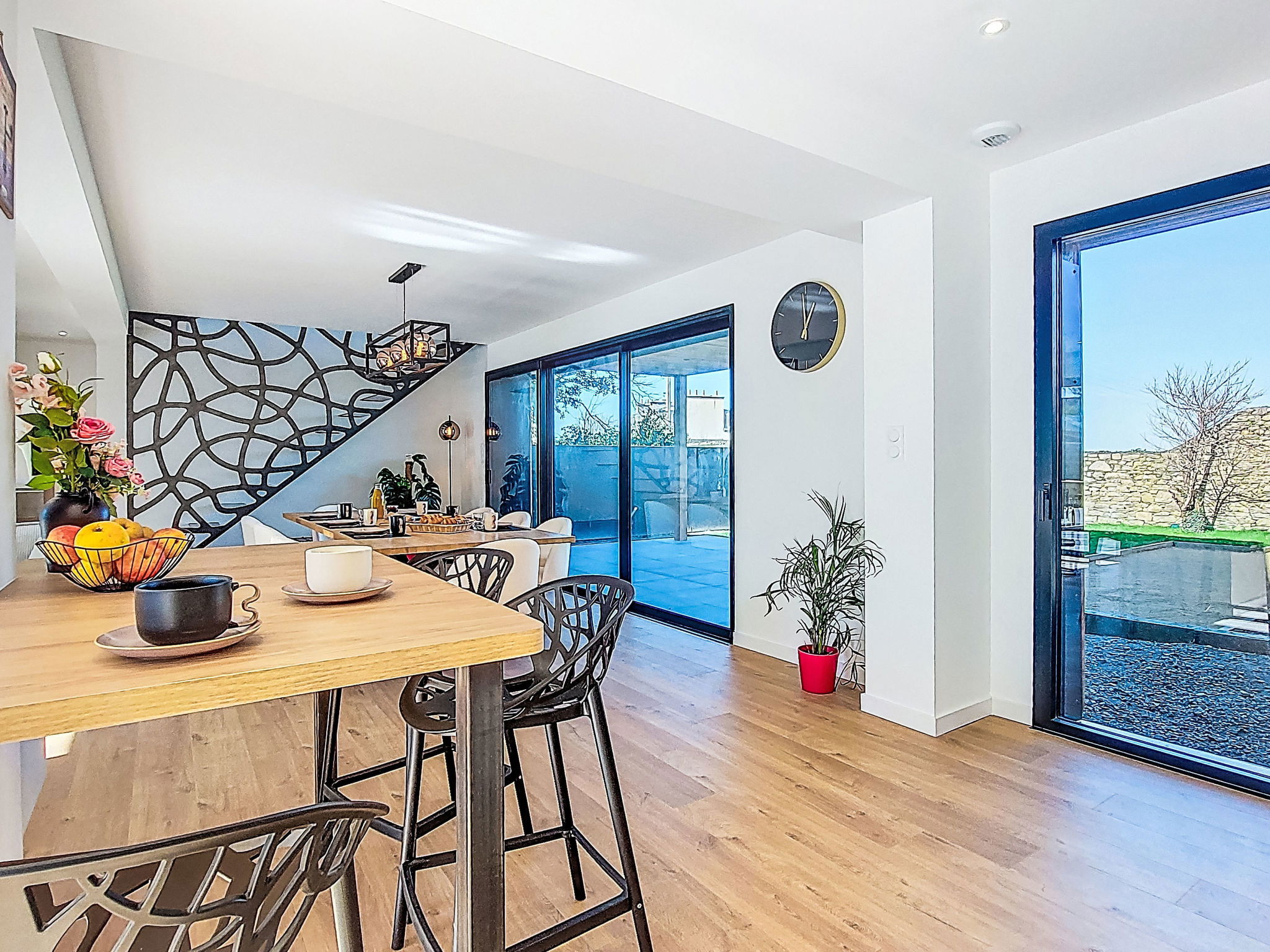 "Ty Béthanie", 5-room house 130 m2. Spacious and bright, comfortable and tasteful furnishings: open large living/dining room 40 m2 with digital TV and flat screen. Exit to the garden, to the terrace. 1 room 15 m2 with 2 beds (90 cm, length 200 cm). Large, open kitchen (oven, dishwasher, 4 induction hot plates, toaster, kettle, microwave, freezer, electric coffee machine, Capsules for coffee machine (Senseo) extra) with bar. Shower/WC. Upper floor: open living room 12 m2. 1 room 12 m2 with 2 beds (90 cm, length 200 cm). 1 room 12 m2 with 1 french bed (160 cm, length 200 cm). Shower, sep. WC. Heating, air-conditioning. Large terrace 60 m2, south facing position, large terrace 30 m2, north facing position. Terrace furniture, barbecue, deck chairs. Partial view of the sea. Facilities: washing machine, dryer, iron, children's high chair, baby cot for up to 2 year olds, hair dryer. Internet (WiFi, free). Please note: non-smoking house. Maximum 1 small pet/ dog allowed. Smoke alarm. The ground floor of the house is adapted for people with reduced mobility. Offer by a private individual according to Art. 155, IV of CGI.