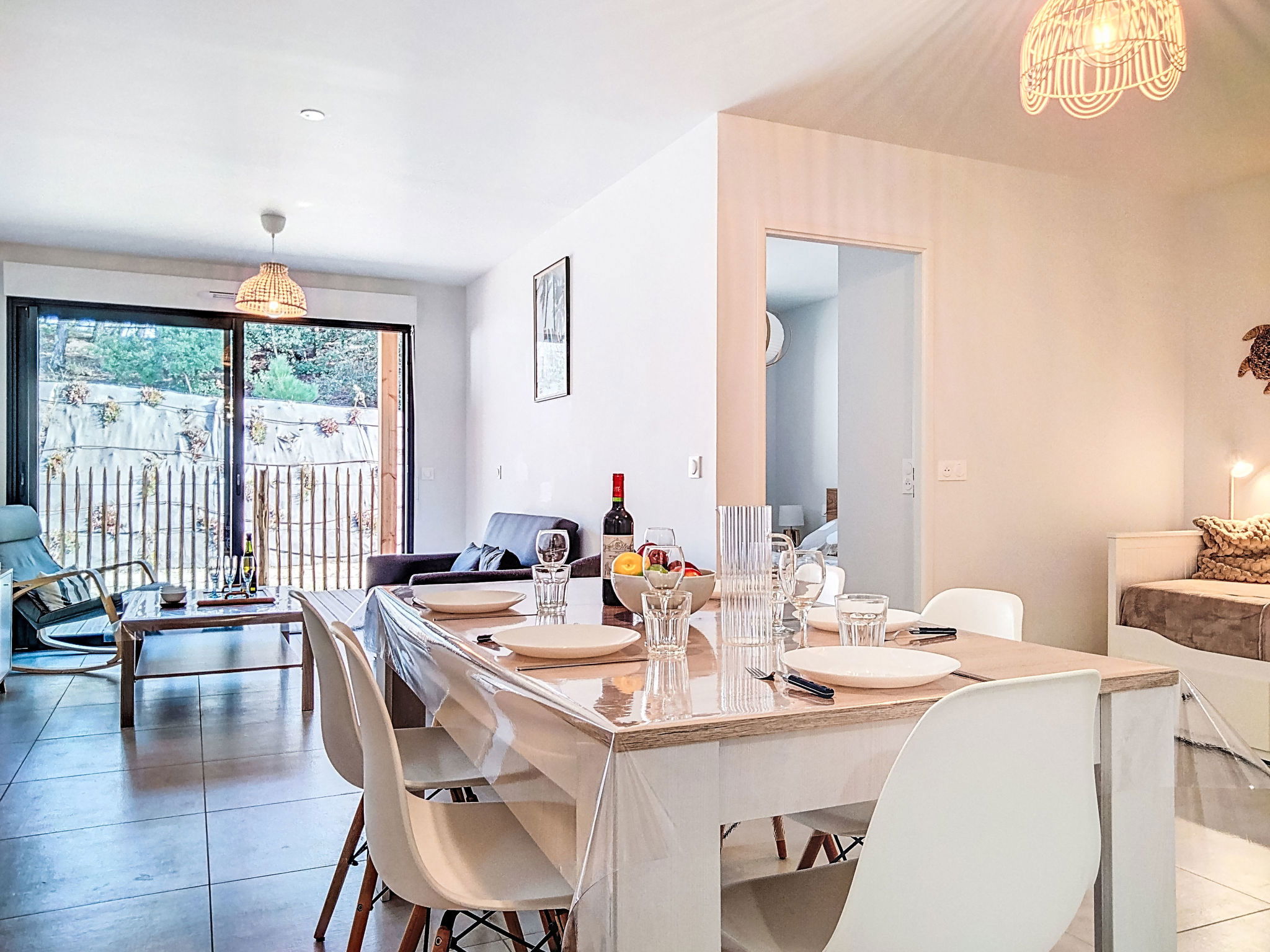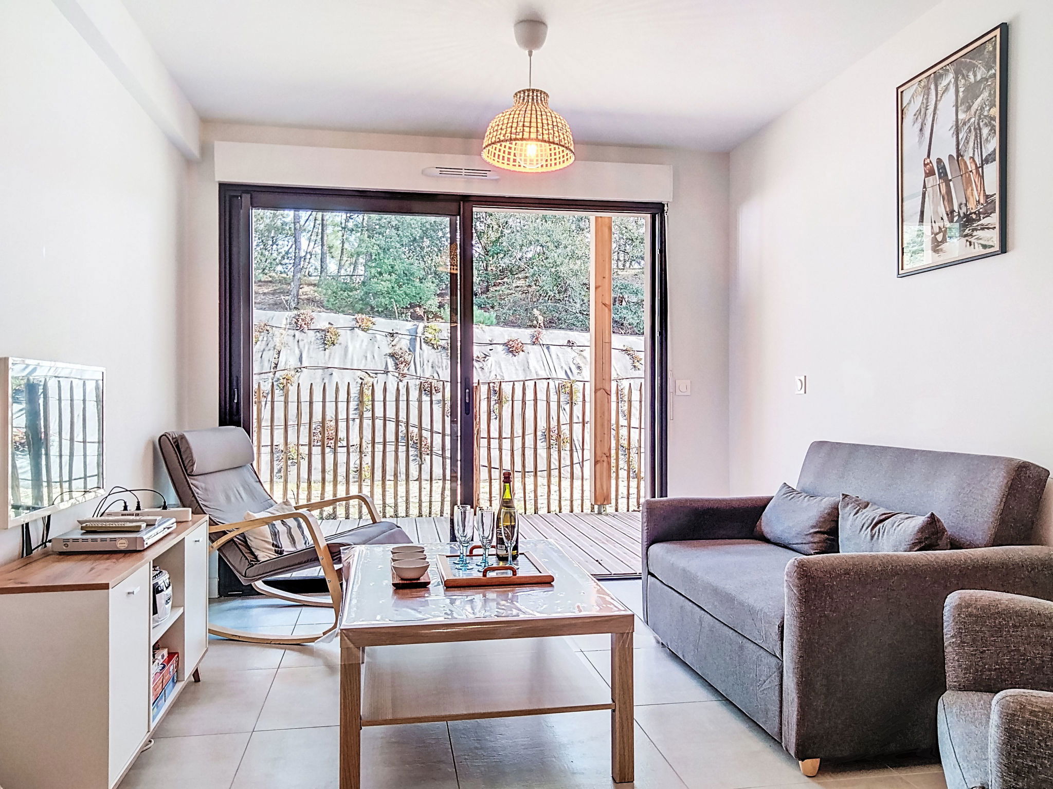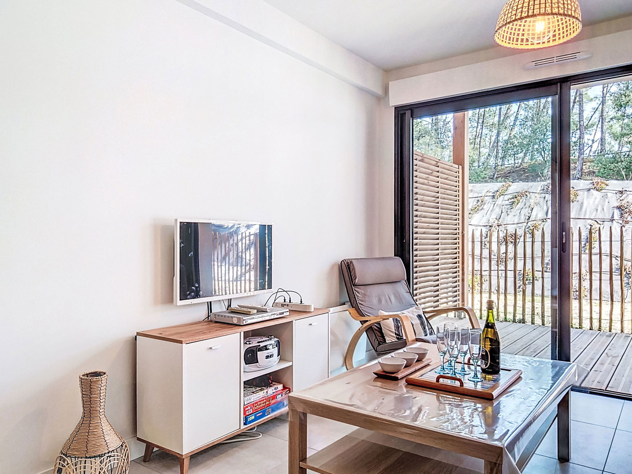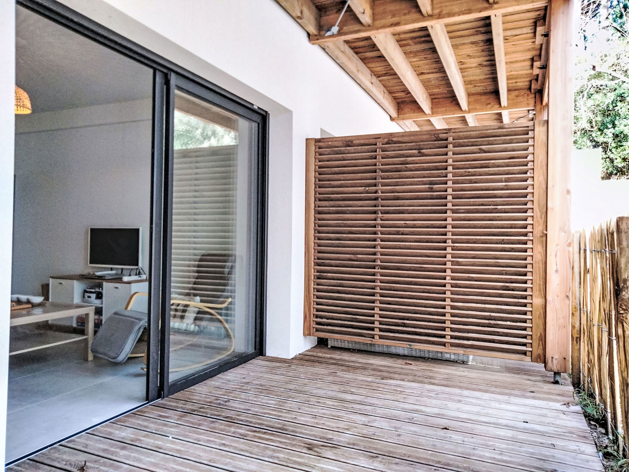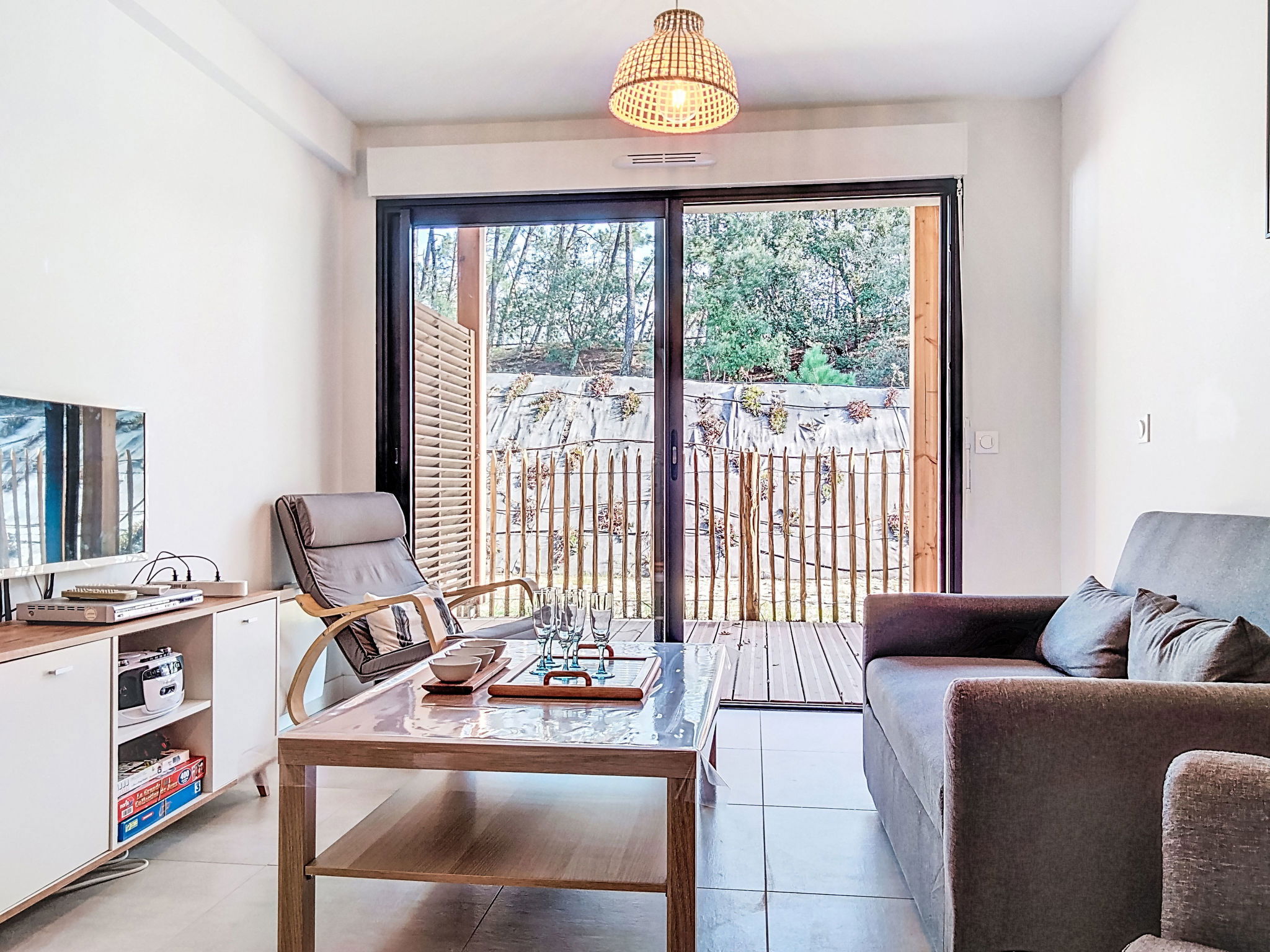 Maubuisson: Beautiful residence "Résidence le Lac", built in 2025. In a quiet position, along the wooded area, 2 km from the sea, 50 m from the lake, 300 m from the beach. For shared use: natural state property with trees. In the house: solarium. Parking at the house. Shop, supermarket, restaurant, bakery 200 m, pedestrian zone, bicycle rental 50 m, 3 minute walk to the centre, bus stop 100 m, sandy beach "Lac de Carcans-Maubuisson", natural swimming pond 300 m. Sports harbour 300 m, surf school 2 km, sailing school 400 m, tennis 1 km, cycle lane 50 m. Nearby attractions: Carcans plage 2 km. Well-known lakes can easily be reached: lac d'Hourtin 50 m. Please note: fishing [permit required]. The keys‘ handover takes place by the agency lacanau 13 km.