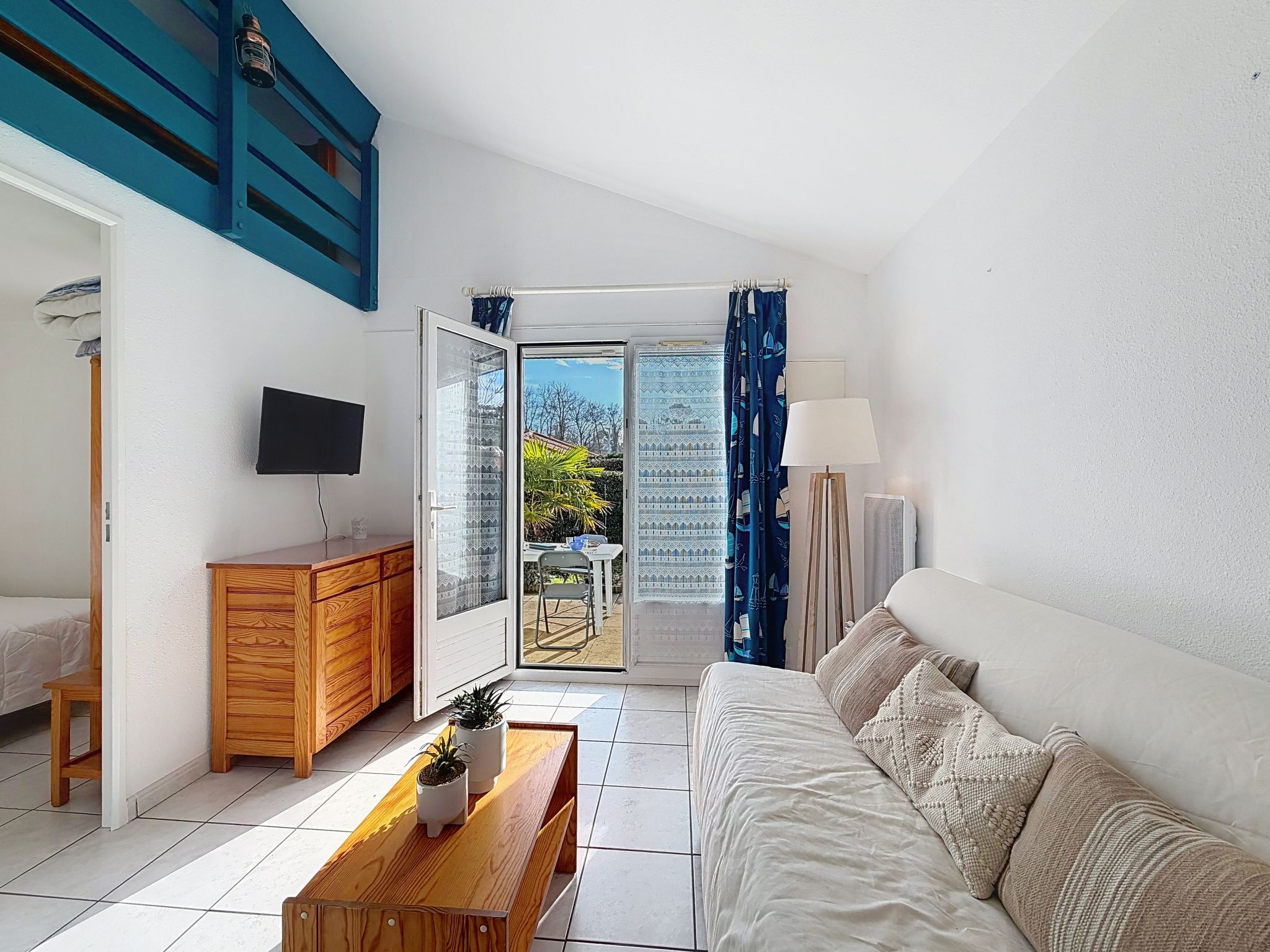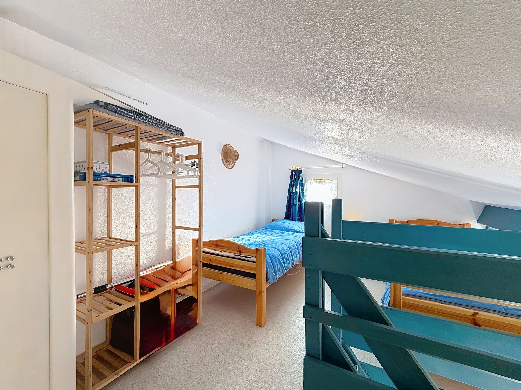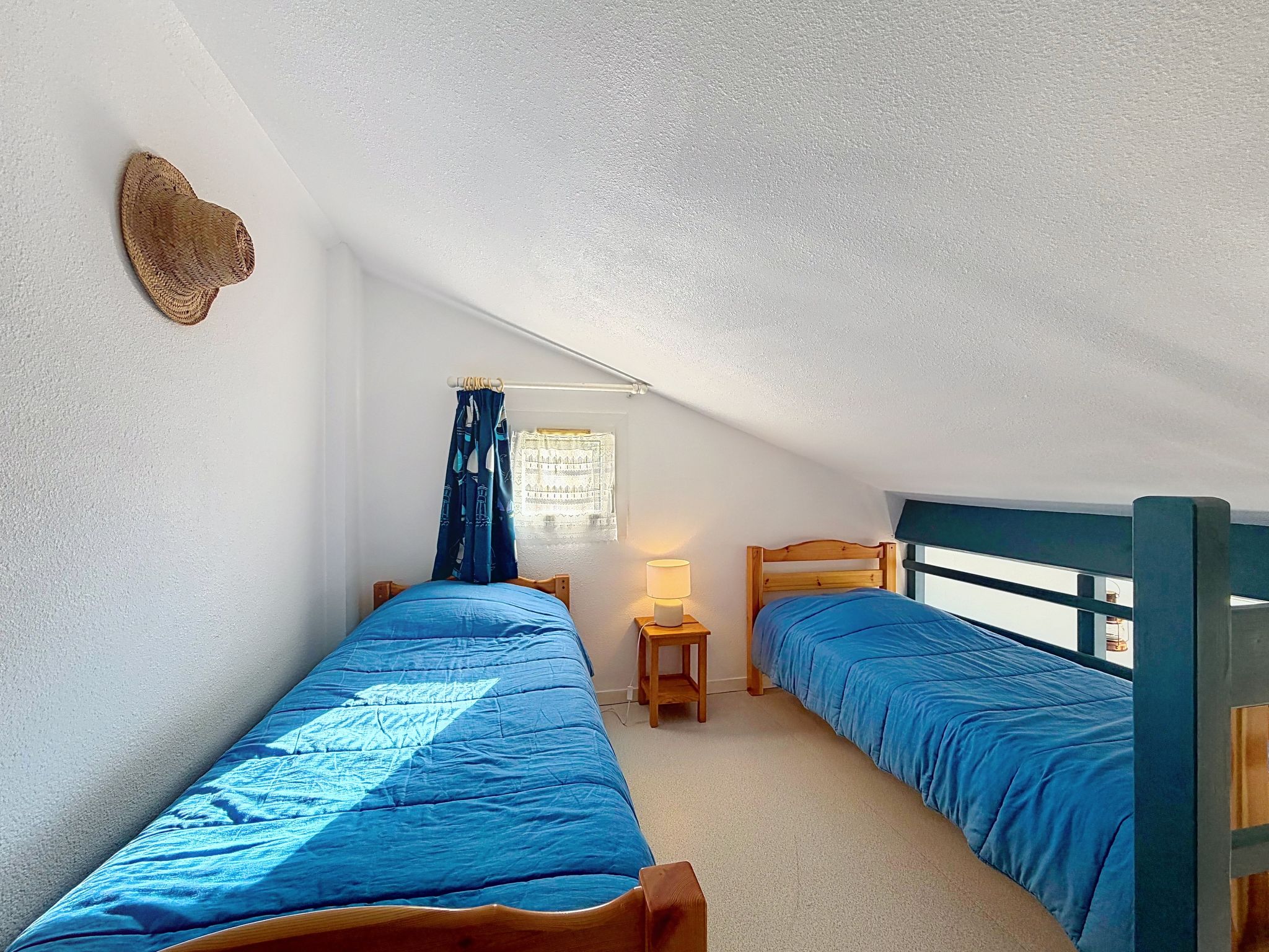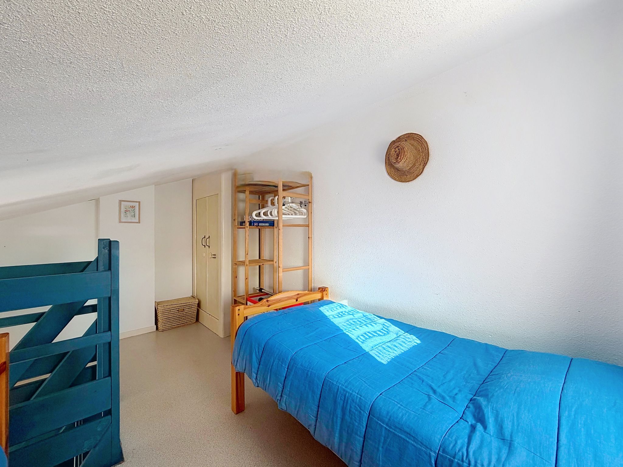 2-room terraced house 34 m2 on 2 levels, south-east facing position. Living/dining room with TV (flat screen), fan. Exit to the garden. 1 room with 1 french bed (1 x 140 cm, length 190 cm). Kitchenette (2 hot plates, toaster, kettle, freezer, electric coffee machine, combination microwave). Shower/WC. Electric heating. Upper floor: 1 open room with sloping ceilings with 2 beds (90 cm, length 190 cm). Patio 45 m2, south facing position and, east facing position. Terrace furniture, box-room. Facilities: Internet (WiFi, extra). Parking space n 118 (1 car). Please note: maximum 1 pet/ dog allowed. Smoke alarm. Offer by a private individual according to Art. 155, IV of CGI.