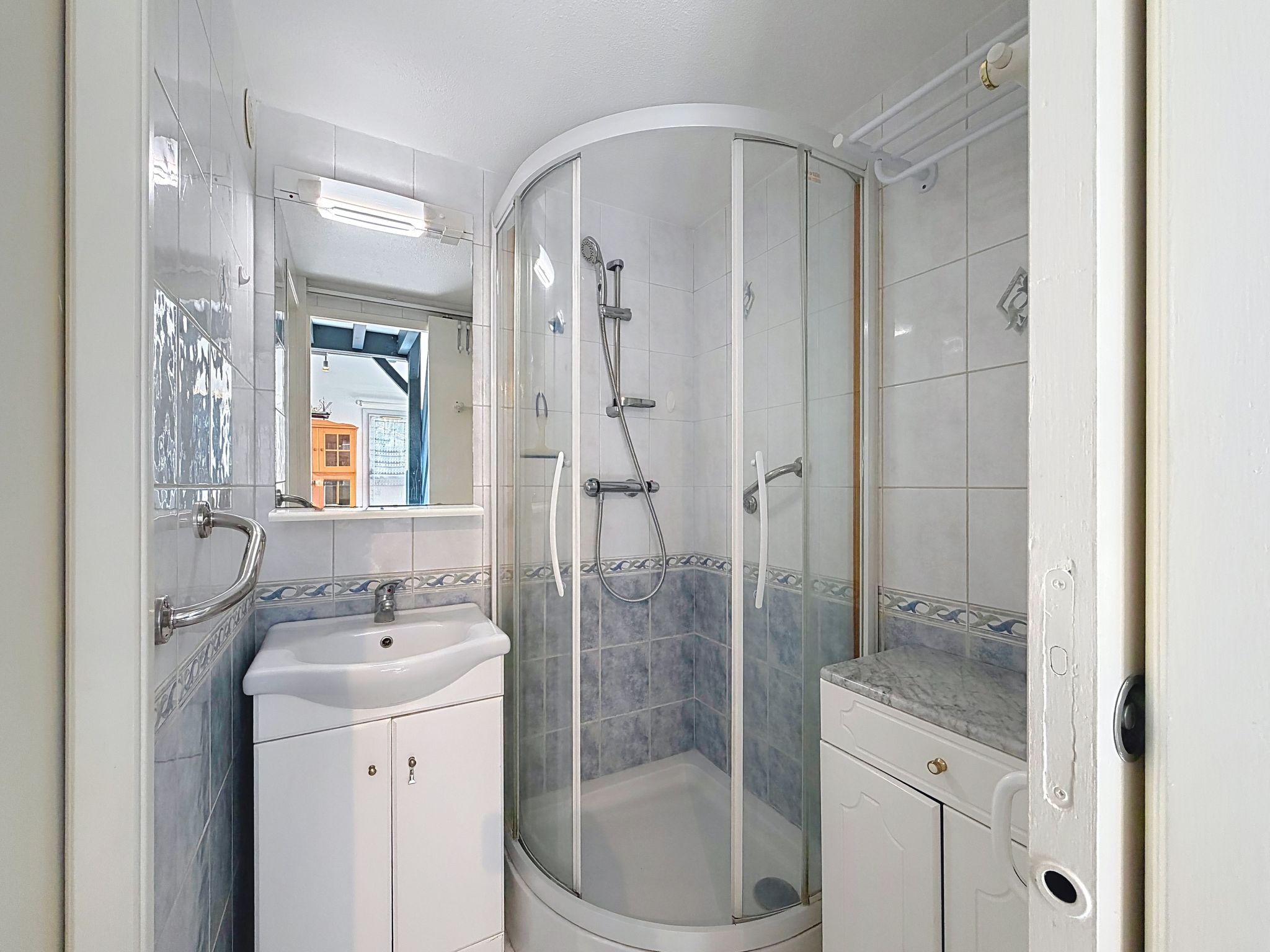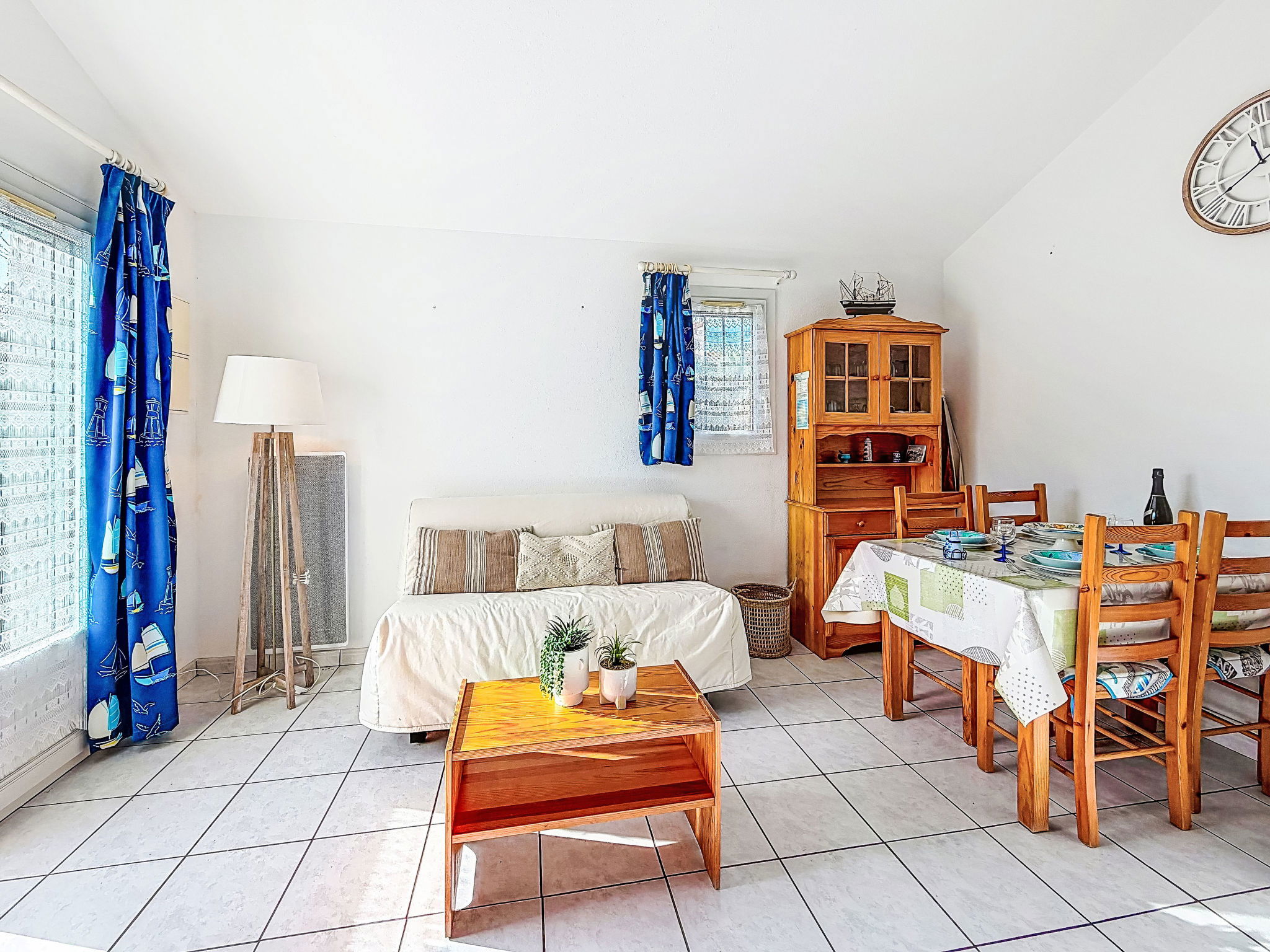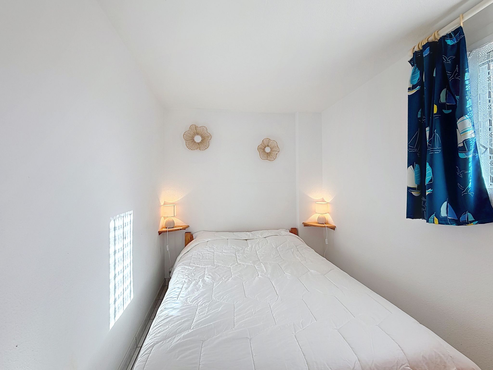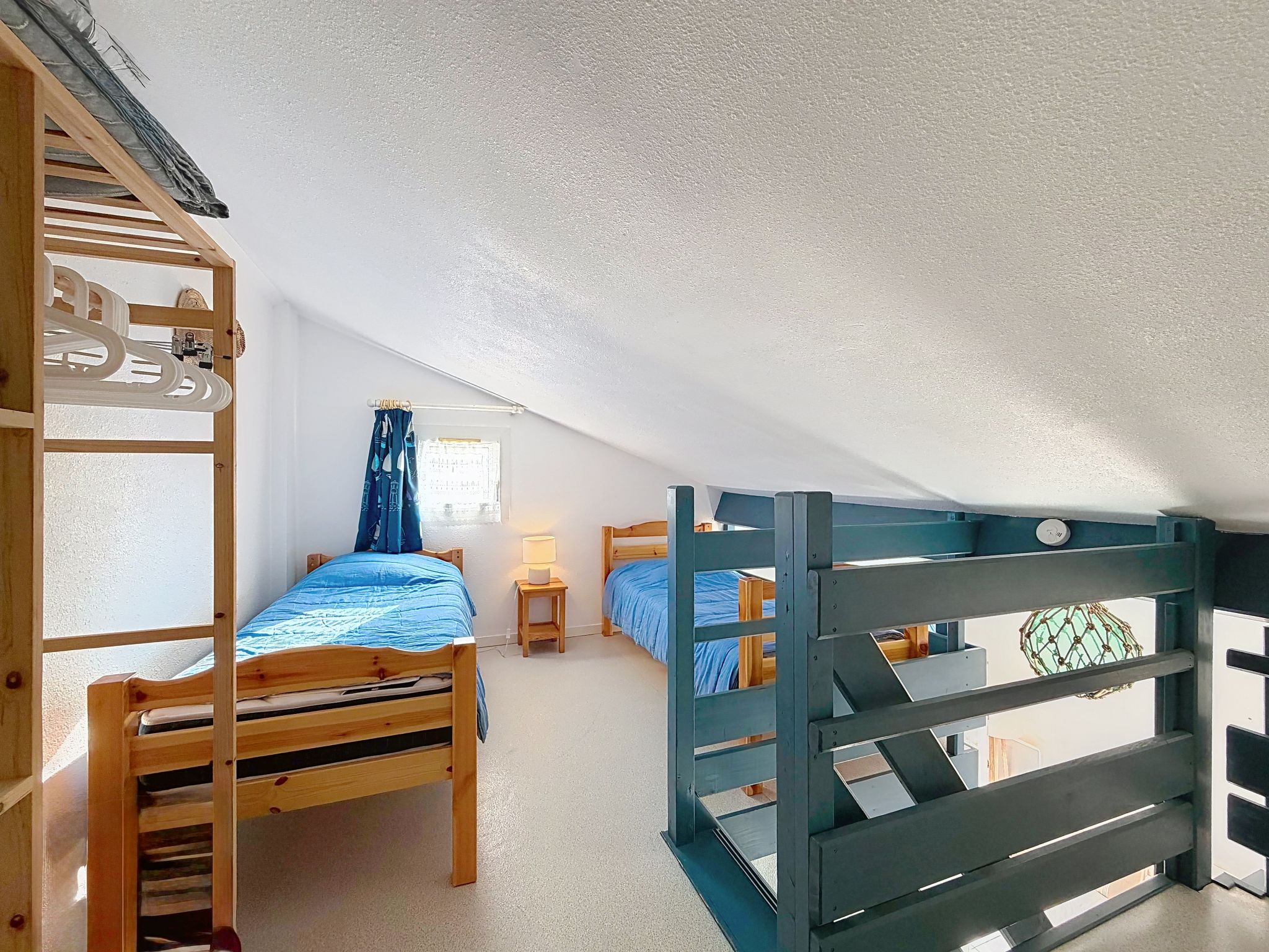 2-room terraced house 34 m2 on 2 levels, south-east facing position. Living/dining room with TV (flat screen), fan. Exit to the garden. 1 room with 1 french bed (1 x 140 cm, length 190 cm). Kitchenette (2 hot plates, toaster, kettle, freezer, electric coffee machine, combination microwave). Shower/WC. Electric heating. Upper floor: 1 open room with sloping ceilings with 2 beds (90 cm, length 190 cm). Patio 45 m2, south facing position and, east facing position. Terrace furniture, box-room. Facilities: Internet (WiFi, extra). Parking space n 118 (1 car). Please note: maximum 1 pet/ dog allowed. Smoke alarm. Offer by a private individual according to Art. 155, IV of CGI.
