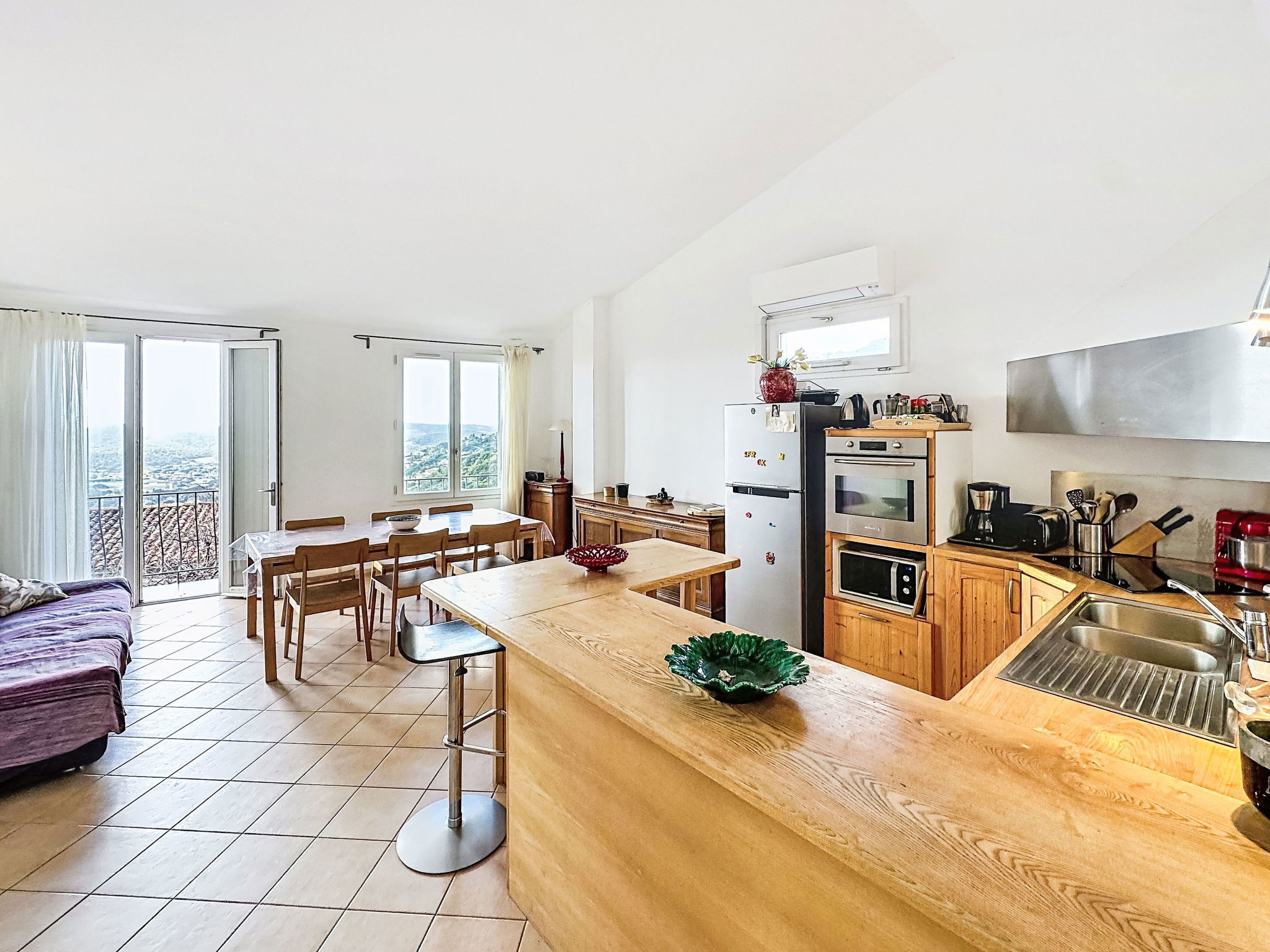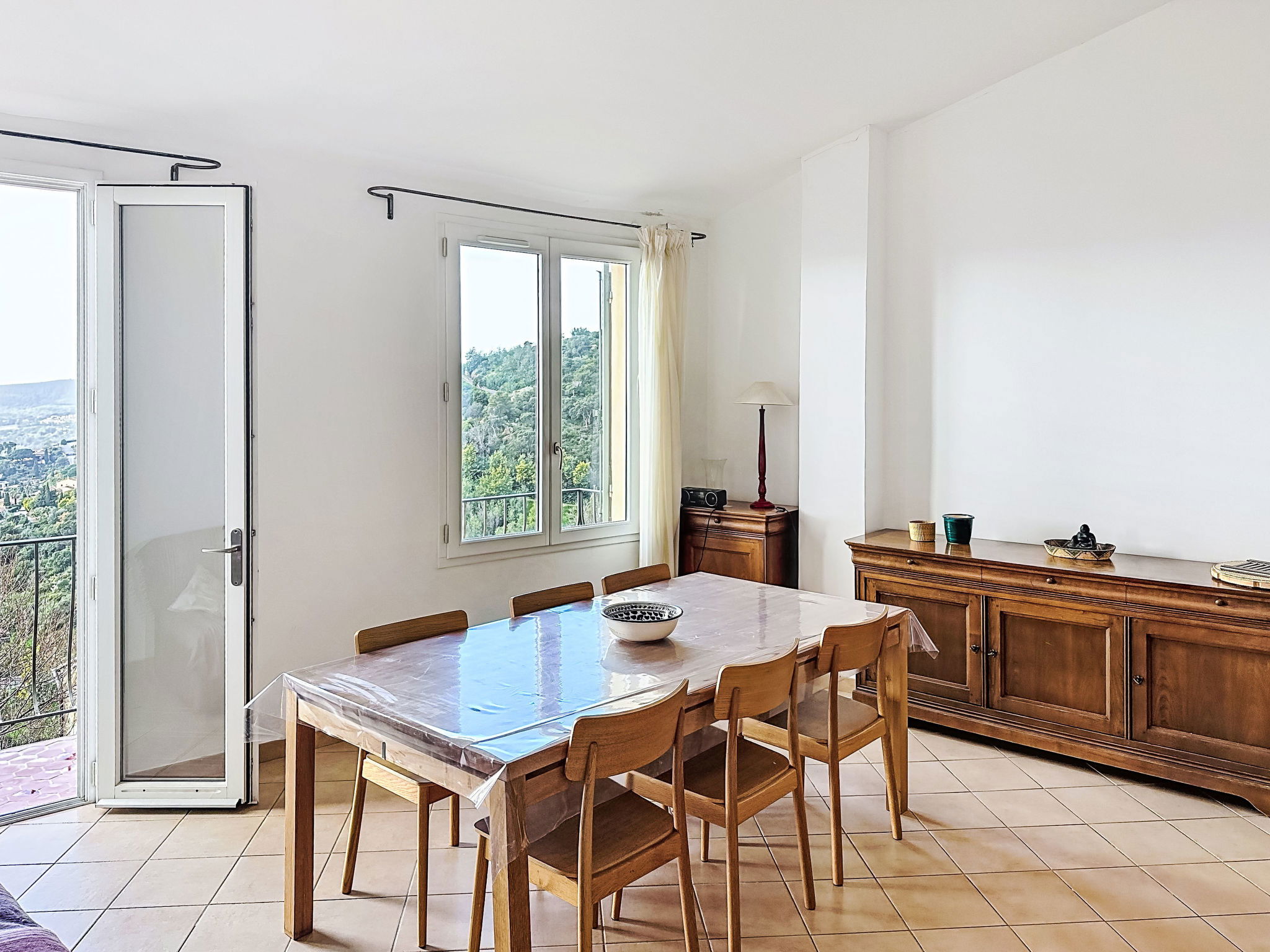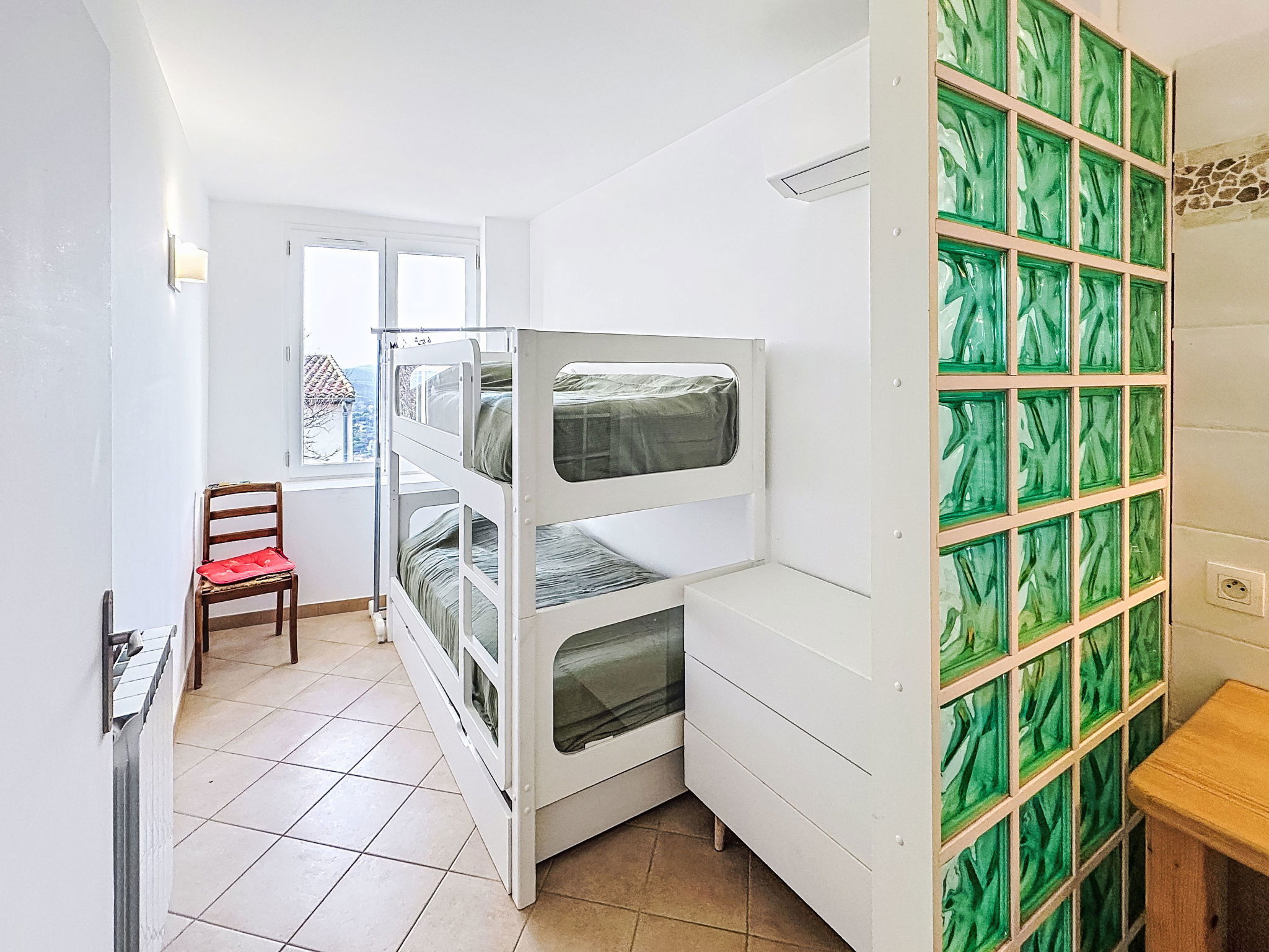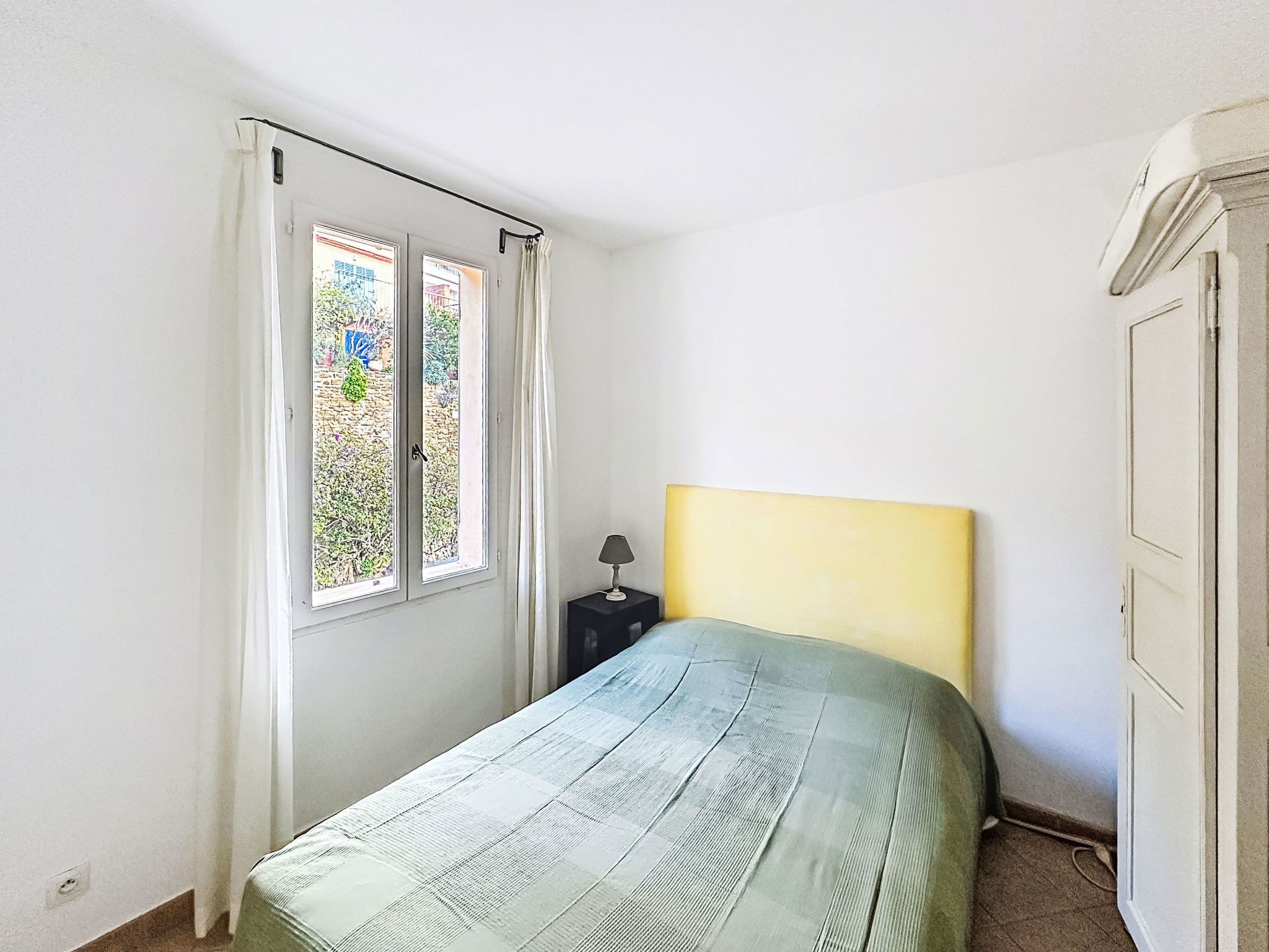 4-room house 110 m2 on 3 levels. Spacious and bright, comfortable furnishings: entrance hall. On the lower ground floor: 1 room with 1 french bed (140 cm, length 190 cm), shower. 1 room with 1 x 2 bunk beds (80 cm, length 190 cm), shower and air conditioning. Sep. WC. Upper floor: living room with veranda with TV (flat screen), air conditioning. Exit to the balcony. 1 room with 1 french bed (140 cm, length 190 cm), fan. Open kitchen (oven, dishwasher, 4 ceramic glass hob hotplates, toaster, kettle, microwave, freezer, electric coffee machine) with dining table. Bath/WC, double hand-basin. Balcony 10 m2, south-east facing position. Side view of the sea. Facilities: washing machine, iron, hair dryer. Internet (WiFi, free). Please note: not suitable for small children. Non-smoking house, no parking. Maximum 1 small pet/ dog allowed. Smoke alarm. Offer by a private individual according to Art. 155, IV of CGI. 83019001520KN