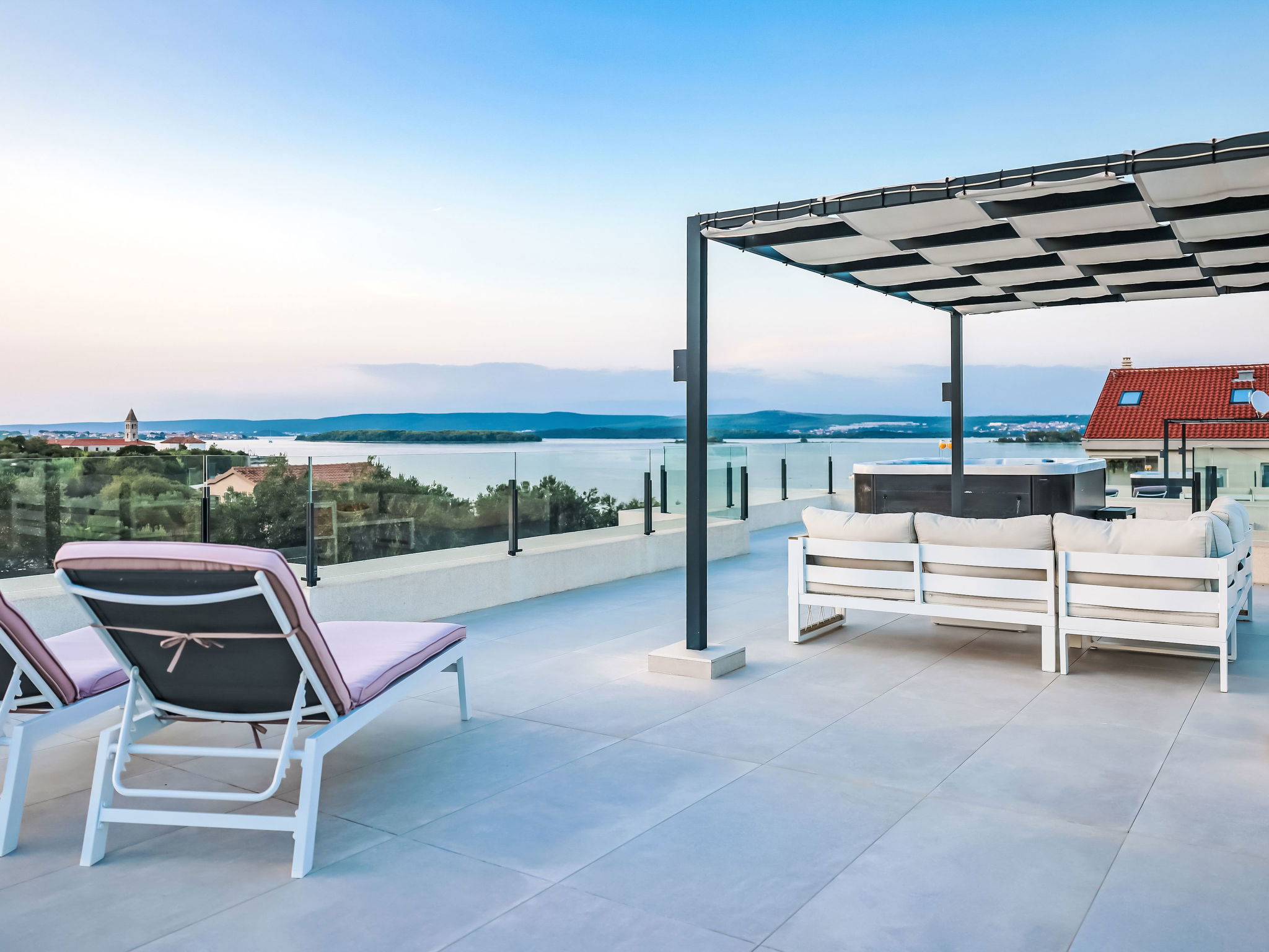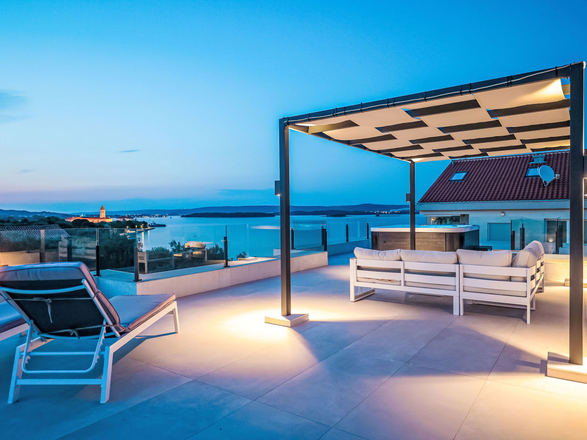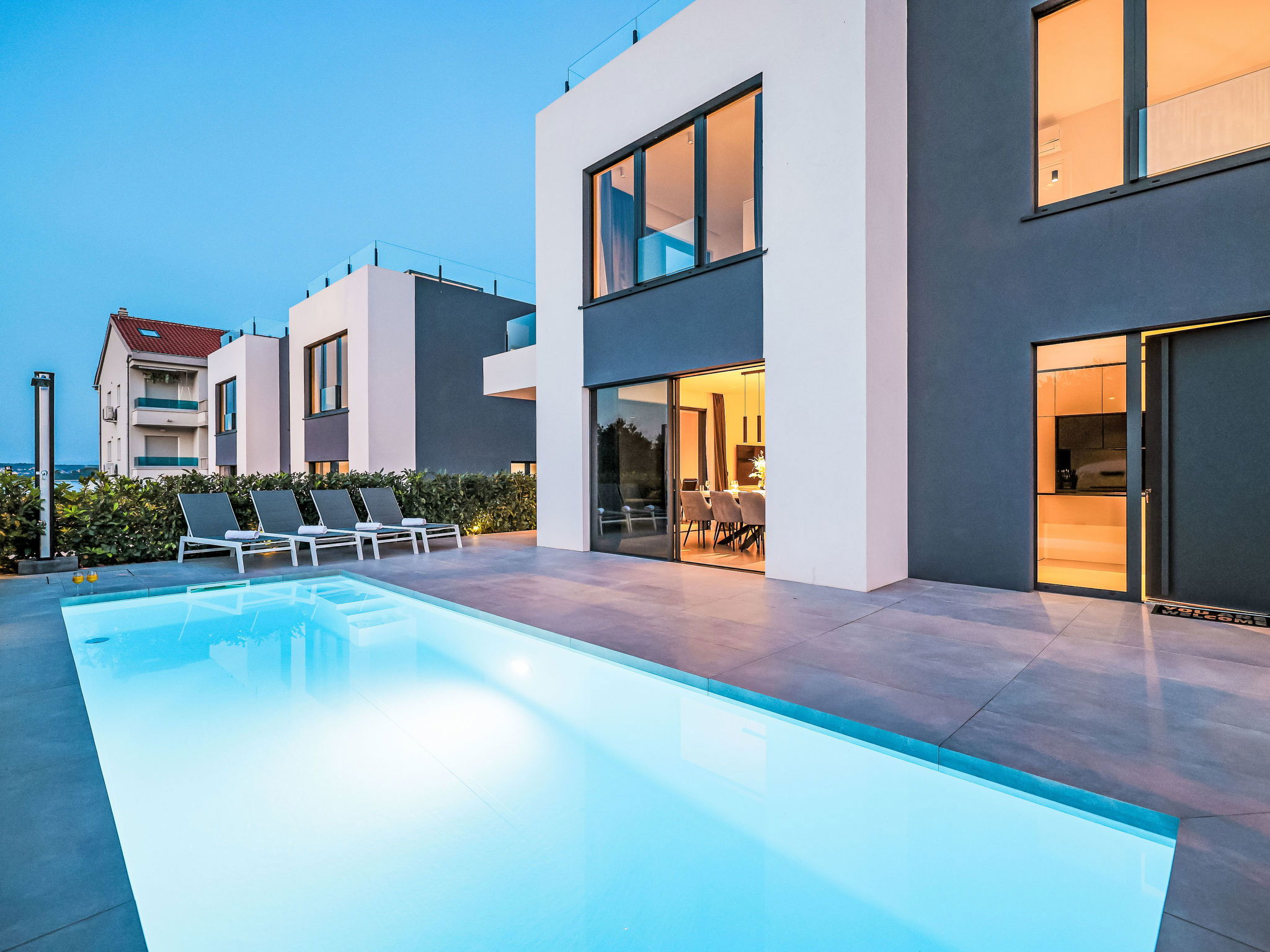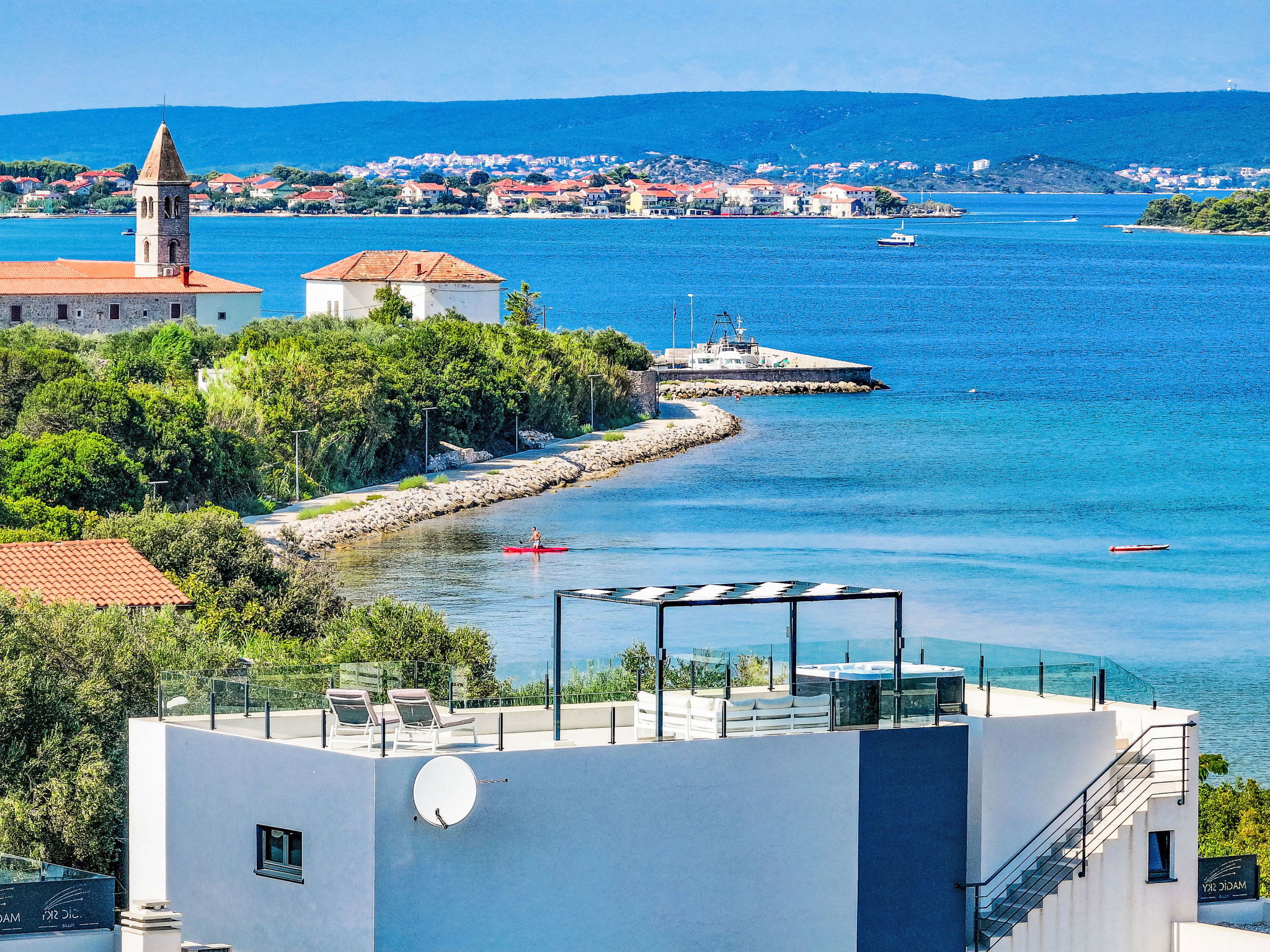 Modern villa "Magic Sky 2", 2 storeys. In a quiet, sunny position, 50 m from the sea, 50 m from the beach. Private: property 360 m2 (fenced), swimming pool angular (7 x 3 m, depth 140 cm, seasonal availability: 15.May. - 15.Sep.) with internal staircase. WC in the pool area, outdoor shower, hot tub, garden furniture (slide), pool maintenance by the owner/gardener. In the house: internet access, fitness room, trampoline, roof terrace, washing machine. Parking (for 3 cars) at the house on the premises. Supermarket 2 km, restaurant 2.5 km, bus stop 900 m, sandy beach 50 m. Marina 2.4 km, walking paths from the house 300 m.