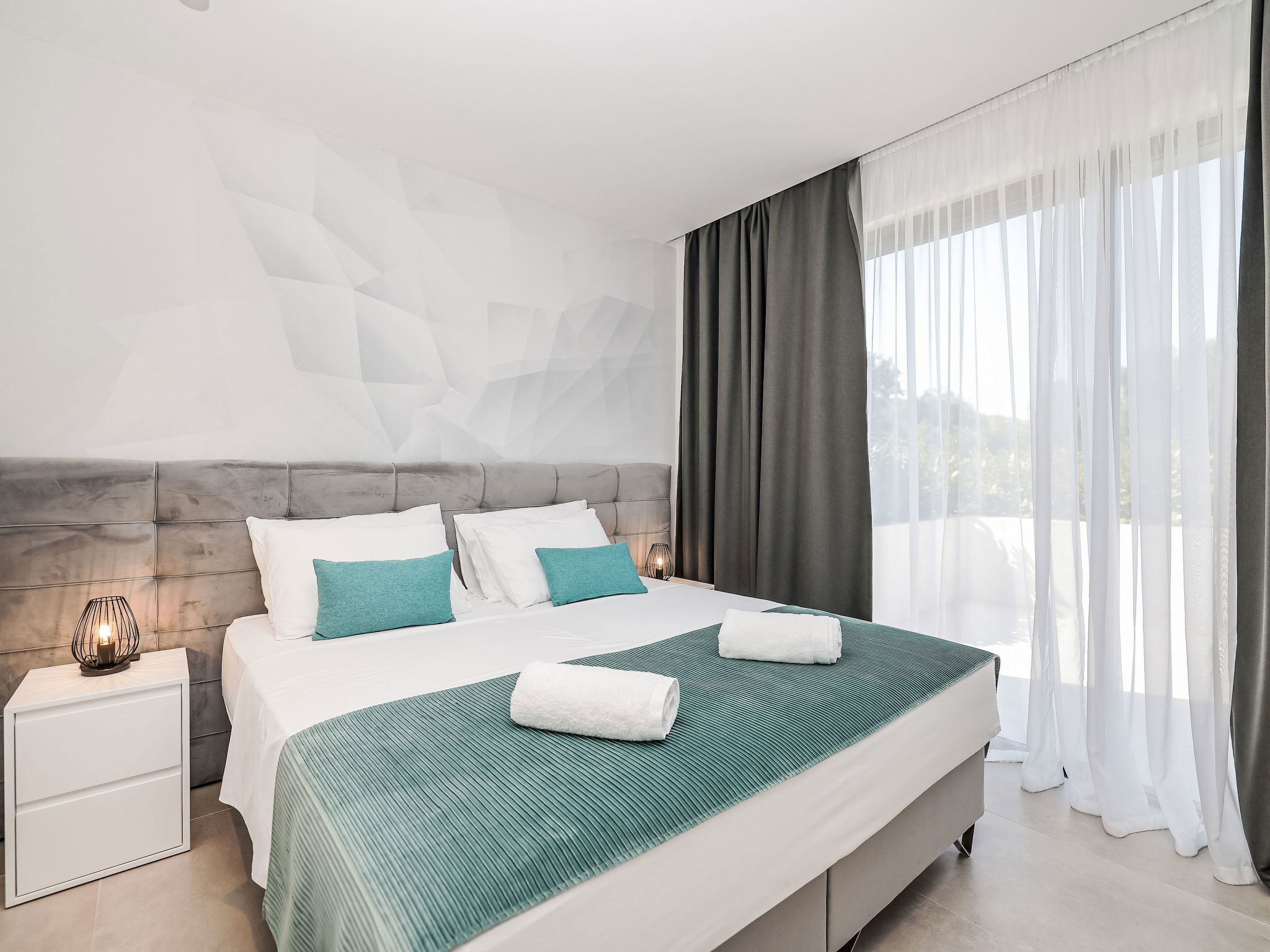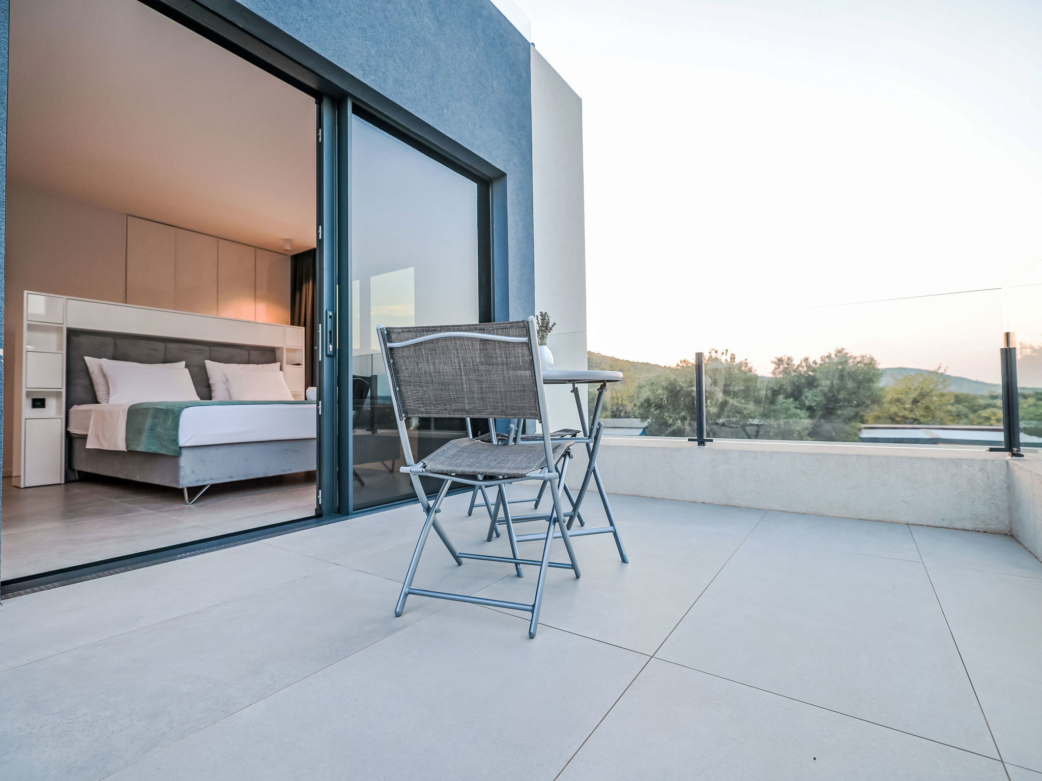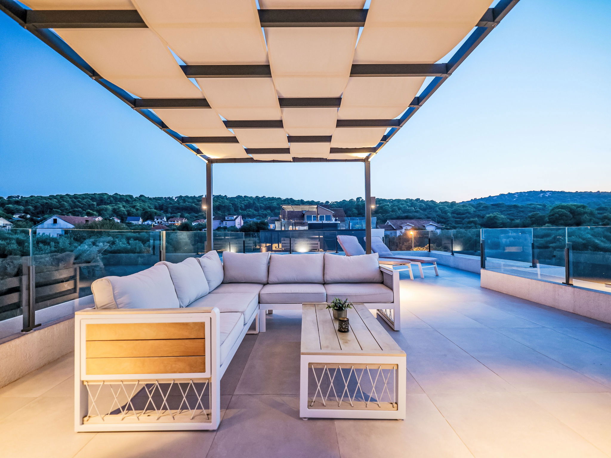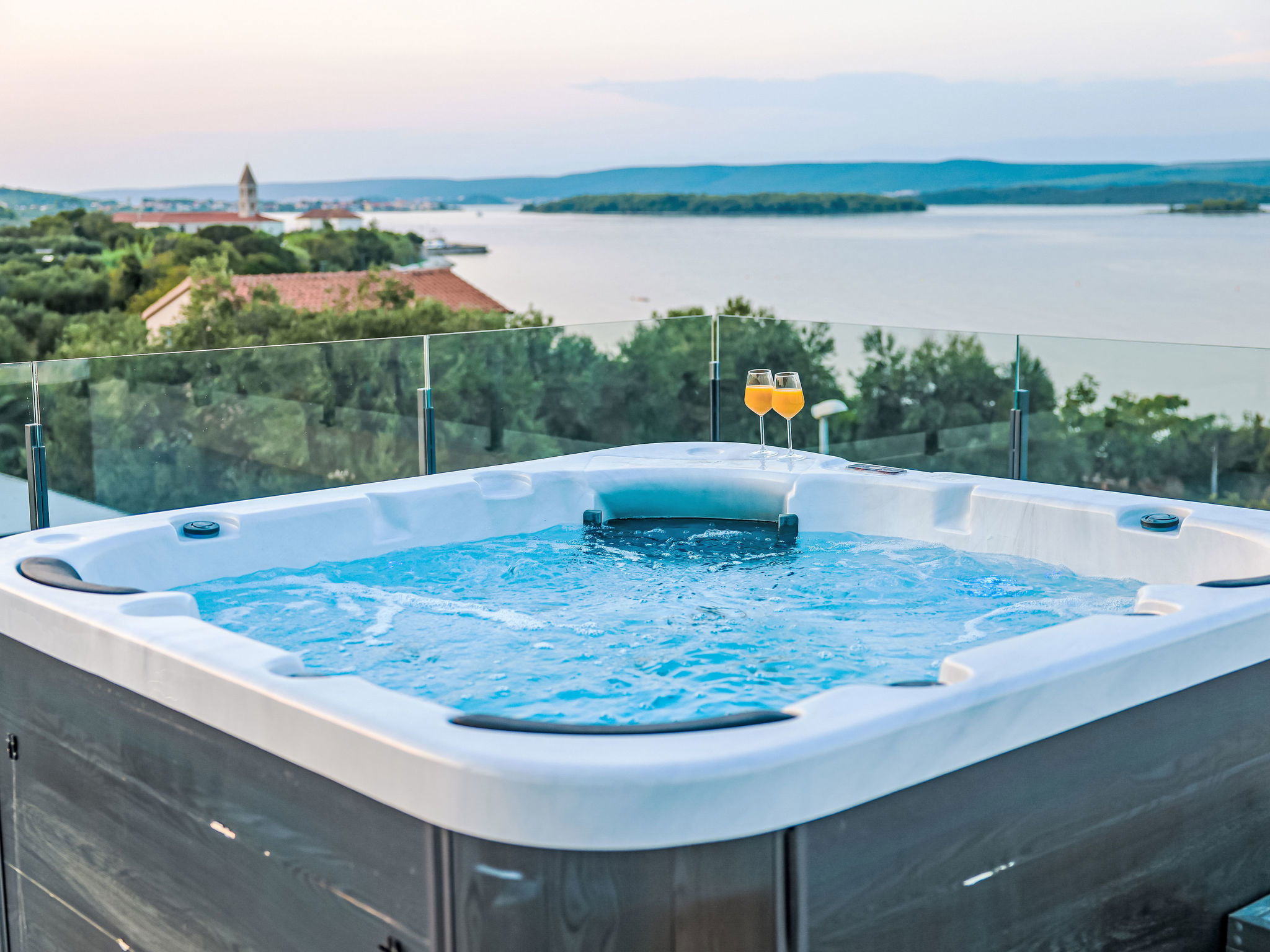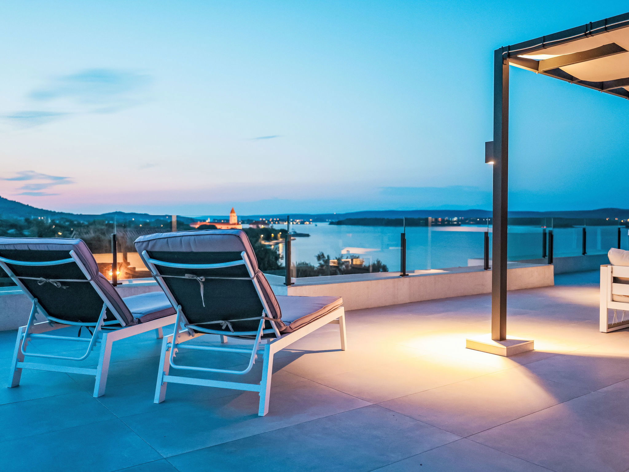Modern villa "Magic Sky 2", 2 storeys. In a quiet, sunny position, 50 m from the sea, 50 m from the beach. Private: property 360 m2 (fenced), swimming pool angular (7 x 3 m, depth 140 cm, seasonal availability: 15.May. - 15.Sep.) with internal staircase. WC in the pool area, outdoor shower, hot tub, garden furniture (slide), pool maintenance by the owner/gardener. In the house: internet access, fitness room, trampoline, roof terrace, washing machine. Parking (for 3 cars) at the house on the premises. Supermarket 2 km, restaurant 2.5 km, bus stop 900 m, sandy beach 50 m. Marina 2.4 km, walking paths from the house 300 m.