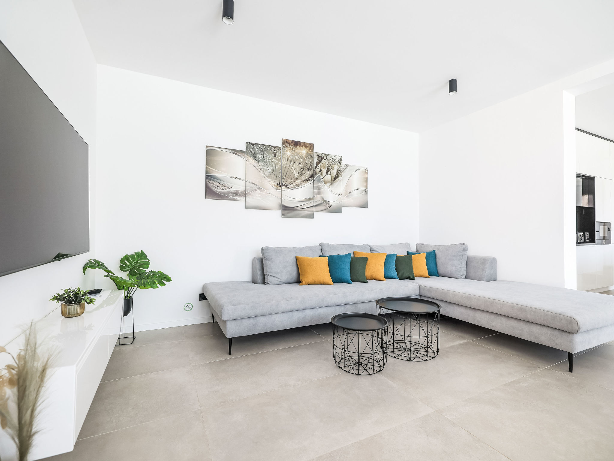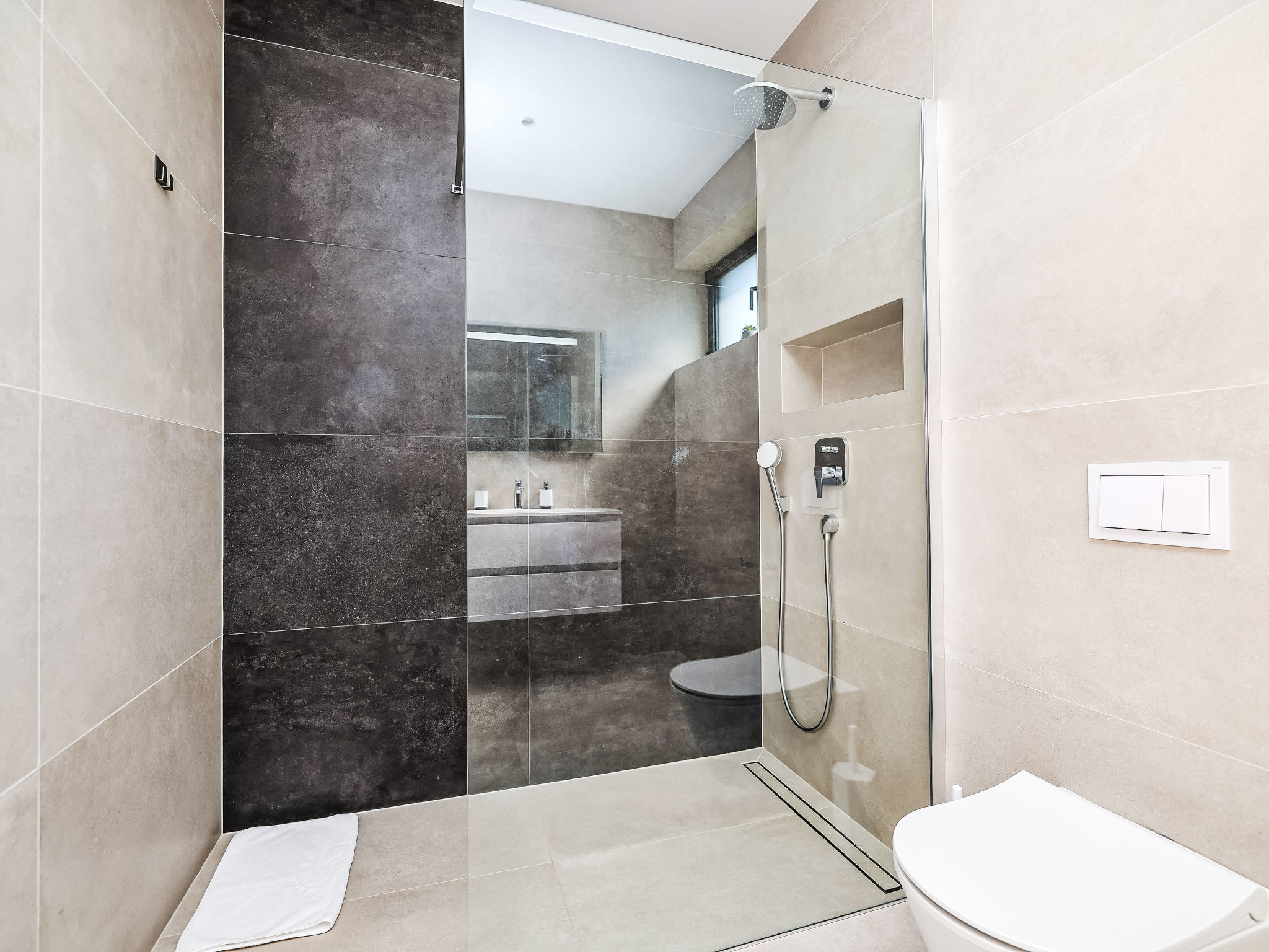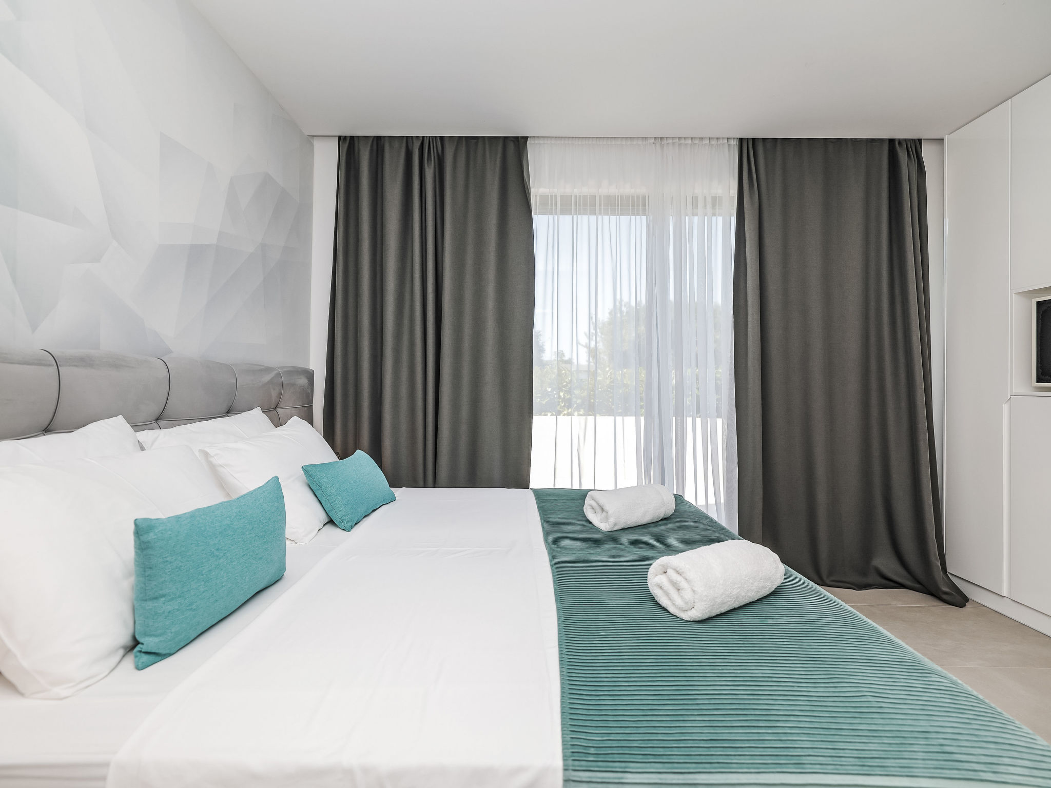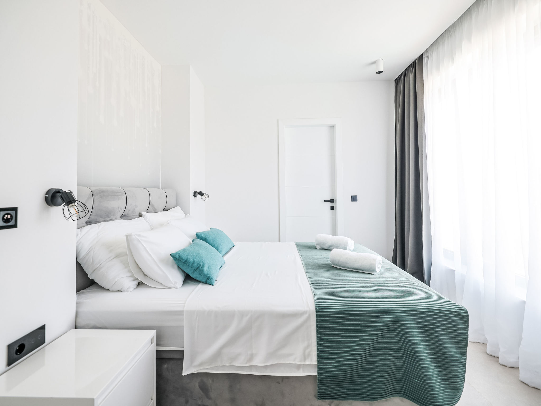 Modern villa "Magic Sky 2", 2 storeys. In a quiet, sunny position, 50 m from the sea, 50 m from the beach. Private: property 360 m2 (fenced), swimming pool angular (7 x 3 m, depth 140 cm, seasonal availability: 15.May. - 15.Sep.) with internal staircase. WC in the pool area, outdoor shower, hot tub, garden furniture (slide), pool maintenance by the owner/gardener. In the house: internet access, fitness room, trampoline, roof terrace, washing machine. Parking (for 3 cars) at the house on the premises. Supermarket 2 km, restaurant 2.5 km, bus stop 900 m, sandy beach 50 m. Marina 2.4 km, walking paths from the house 300 m.
